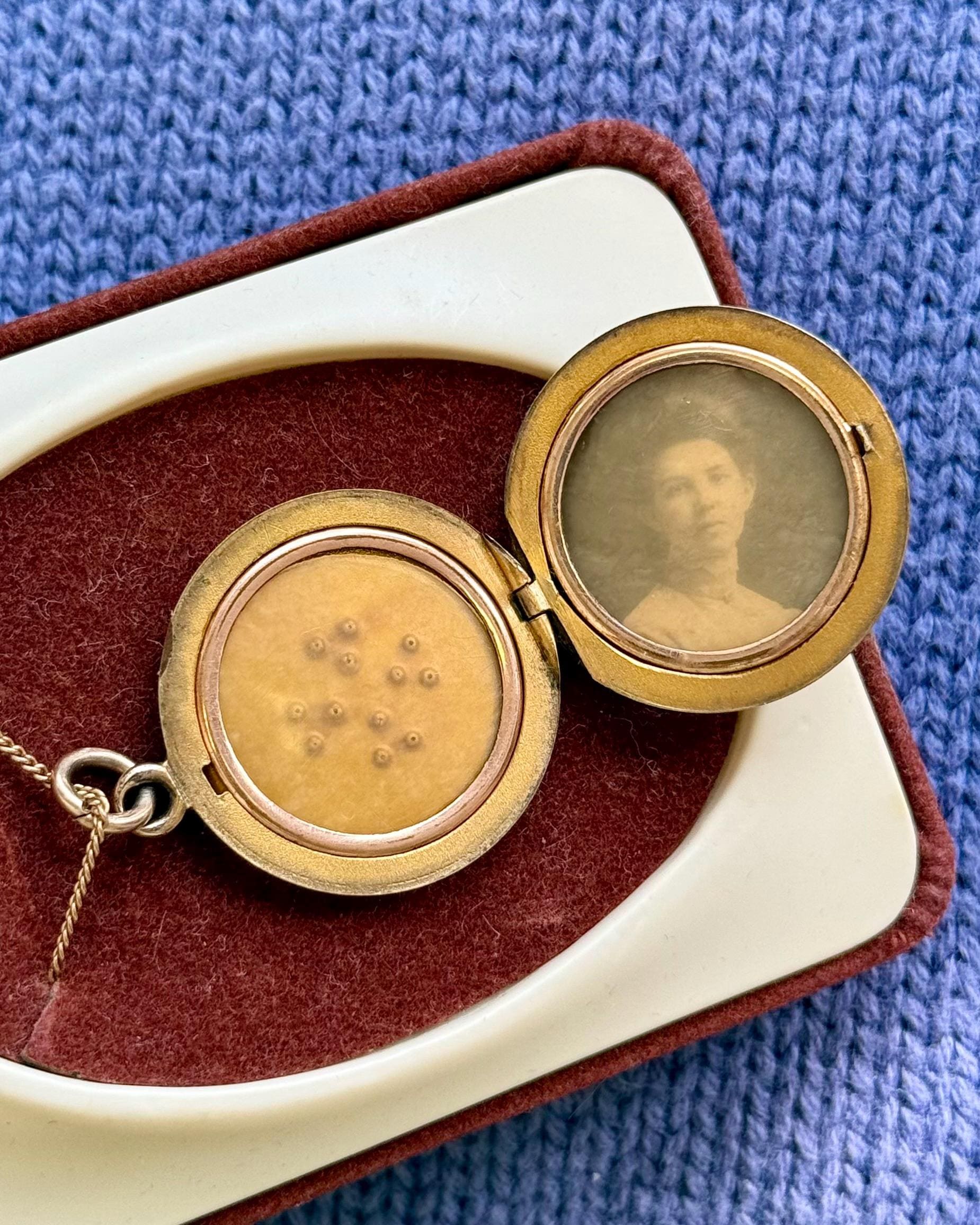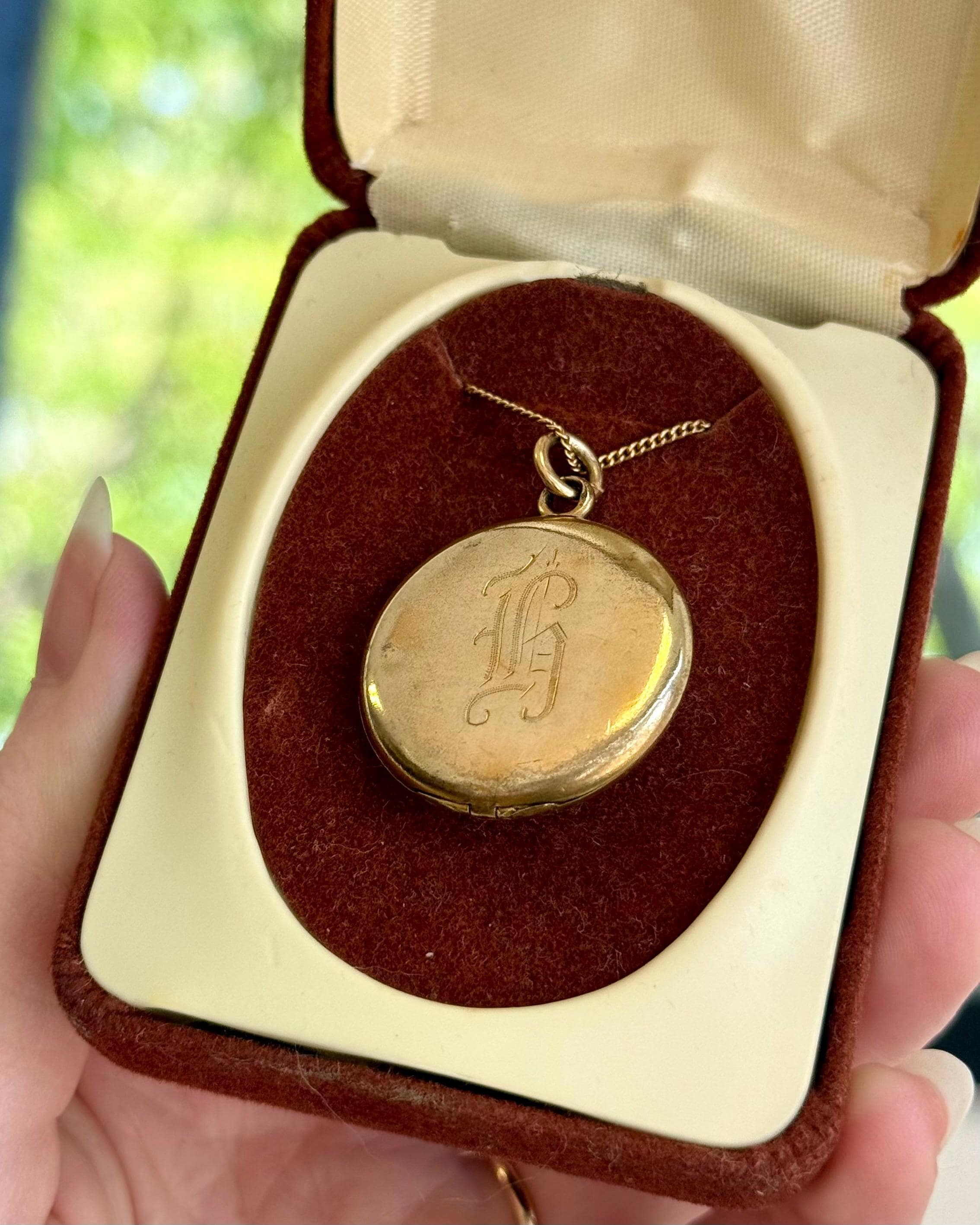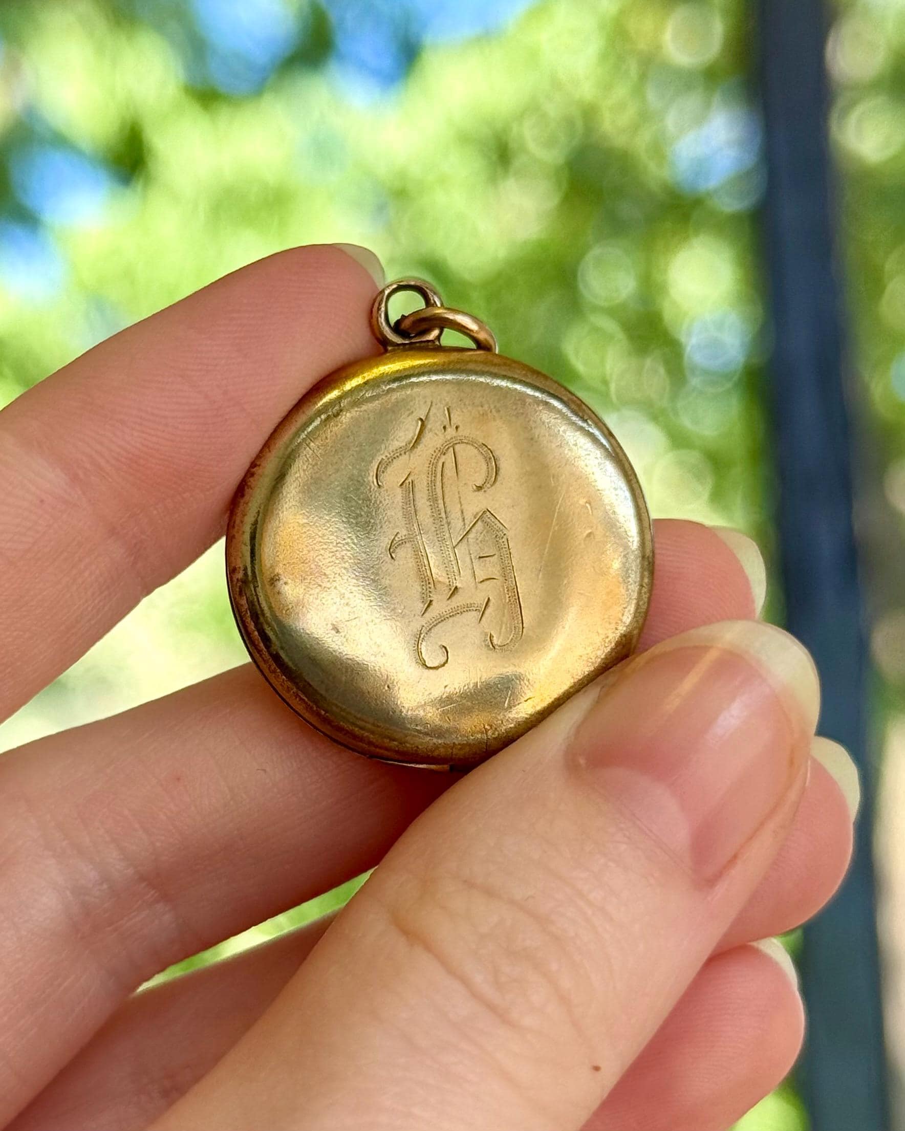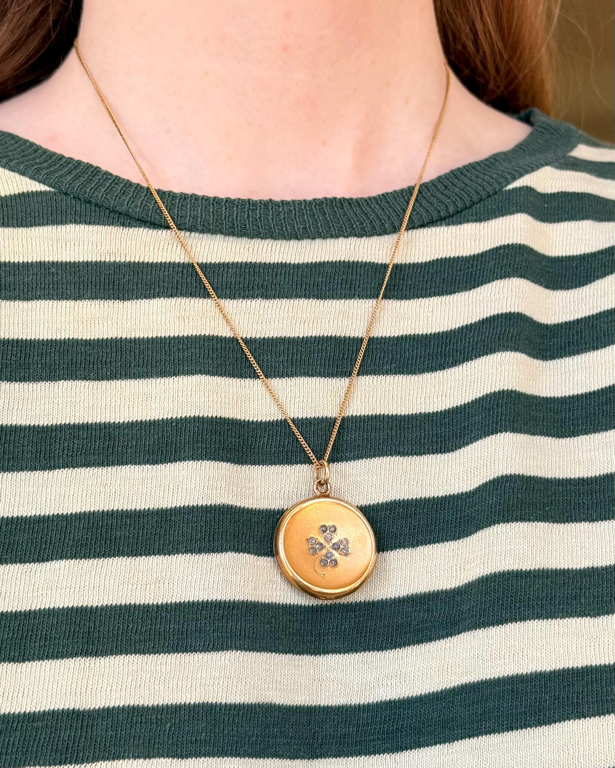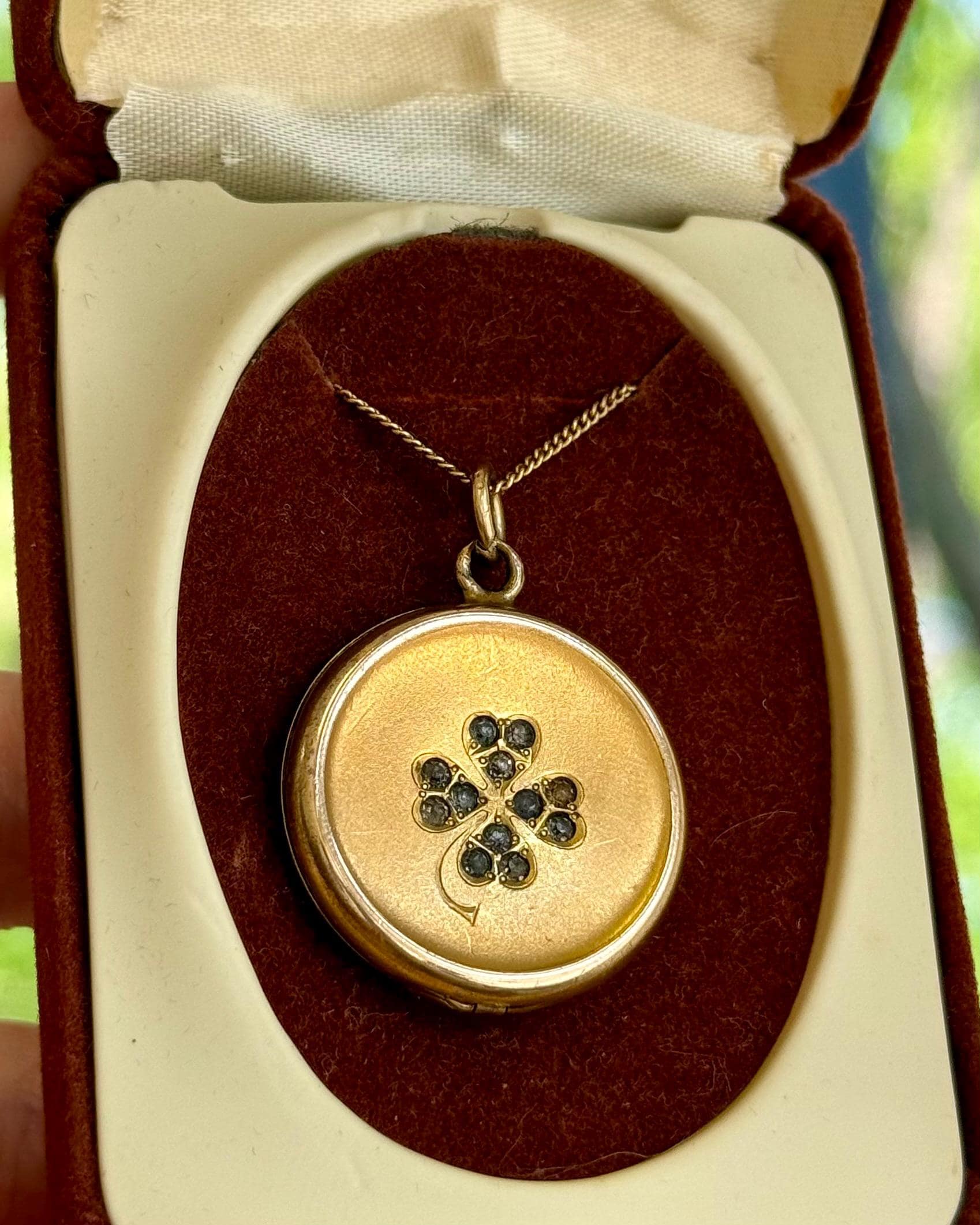 An authentic antique locket pendant only. features a lucky four leaf clover motif set with paste stones on front, engraved unidentifiable initial in old English lettering, possibly lowercase “h”? on back. the front is slightly concave with a brassy matte finish. includes the original photo placed inside by the first owner. marked W&H Co with heart marking underneath for Wightman & Hugh. photo frames press in and hold tightly. beautiful natural patina! easily strings onto your own jewelry of choice.