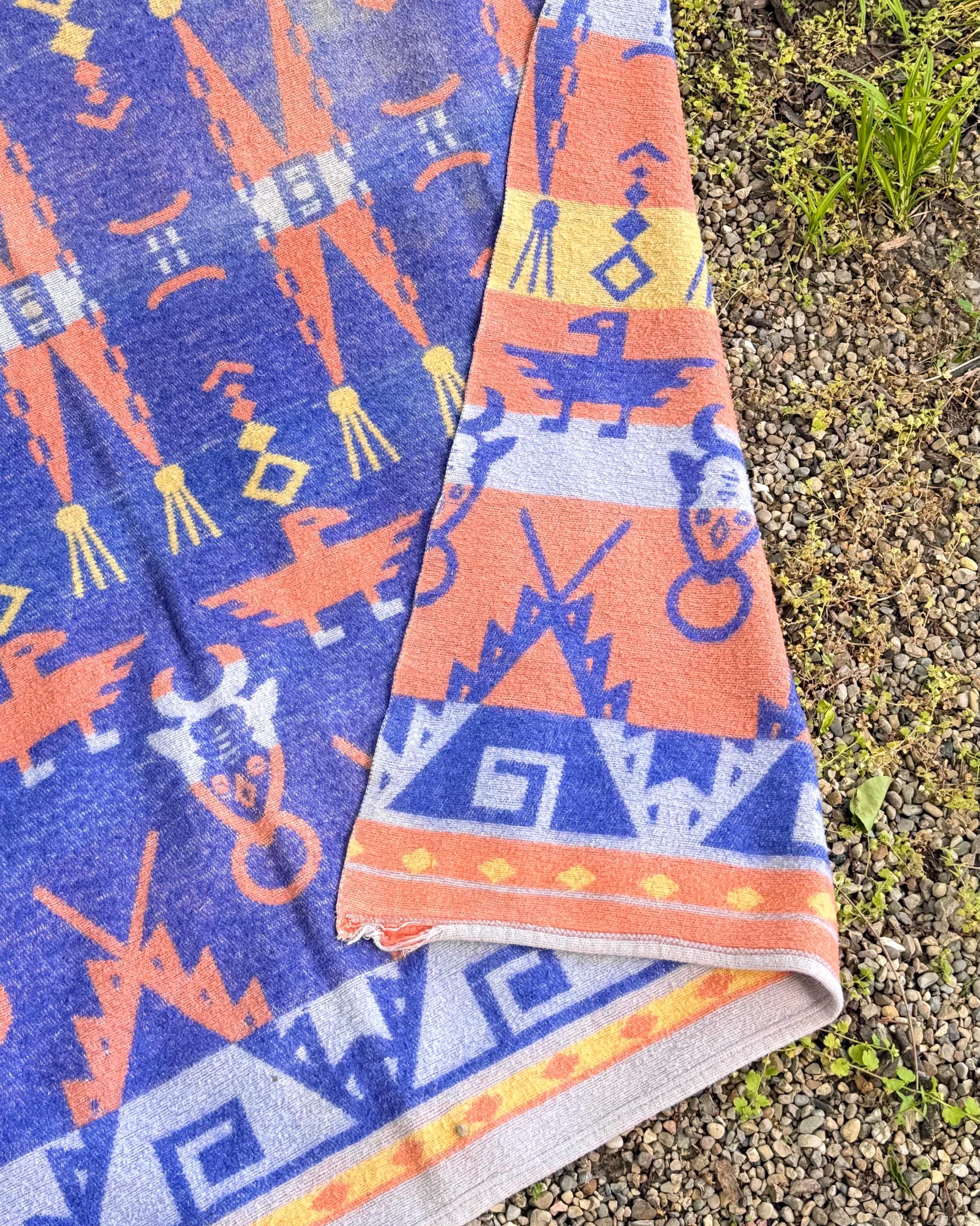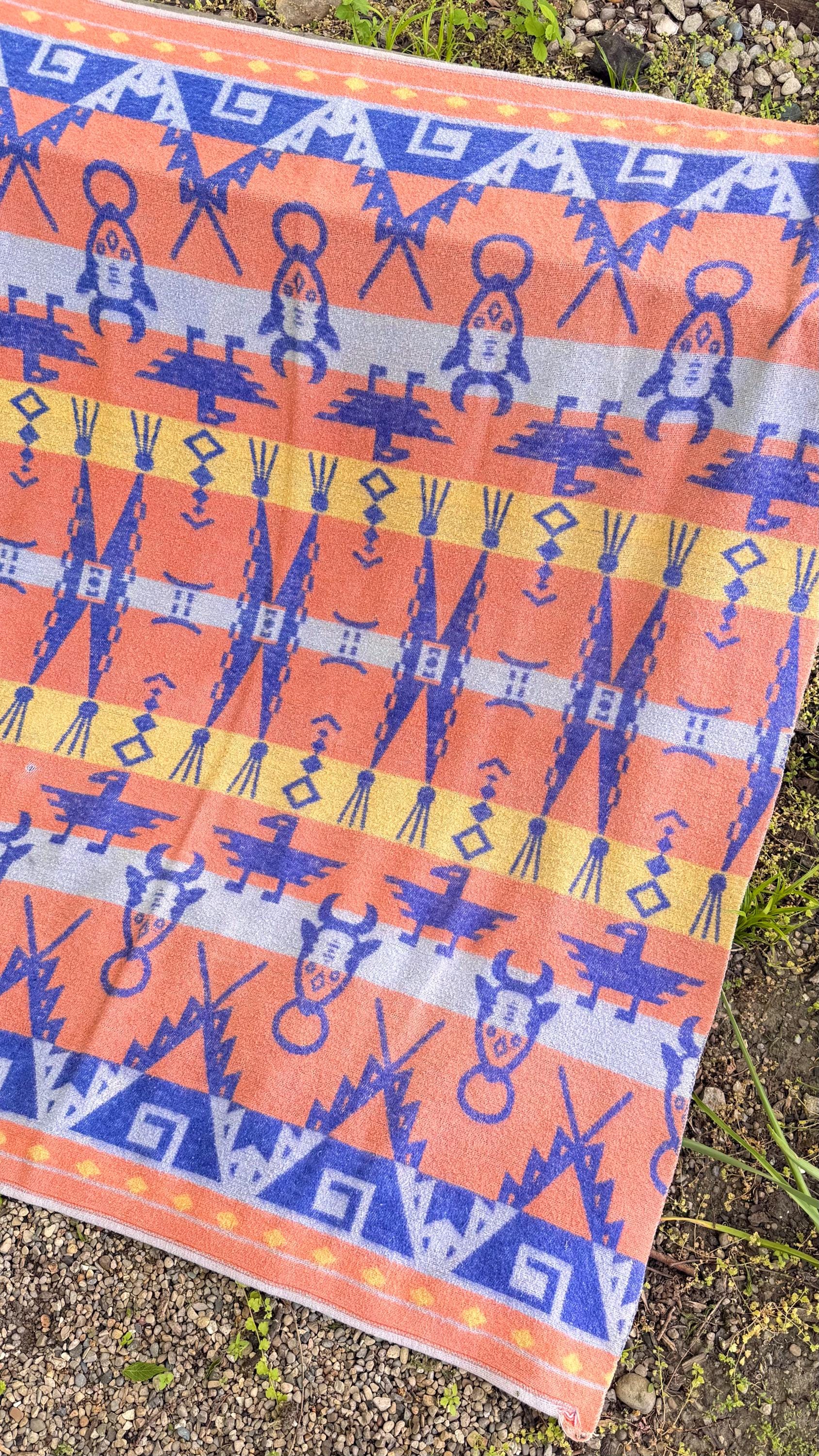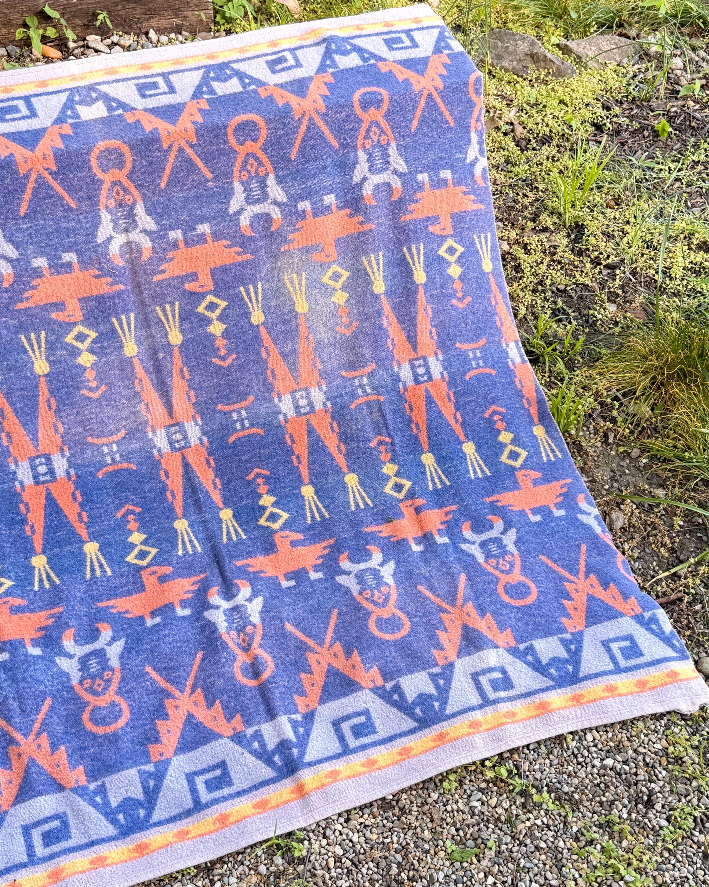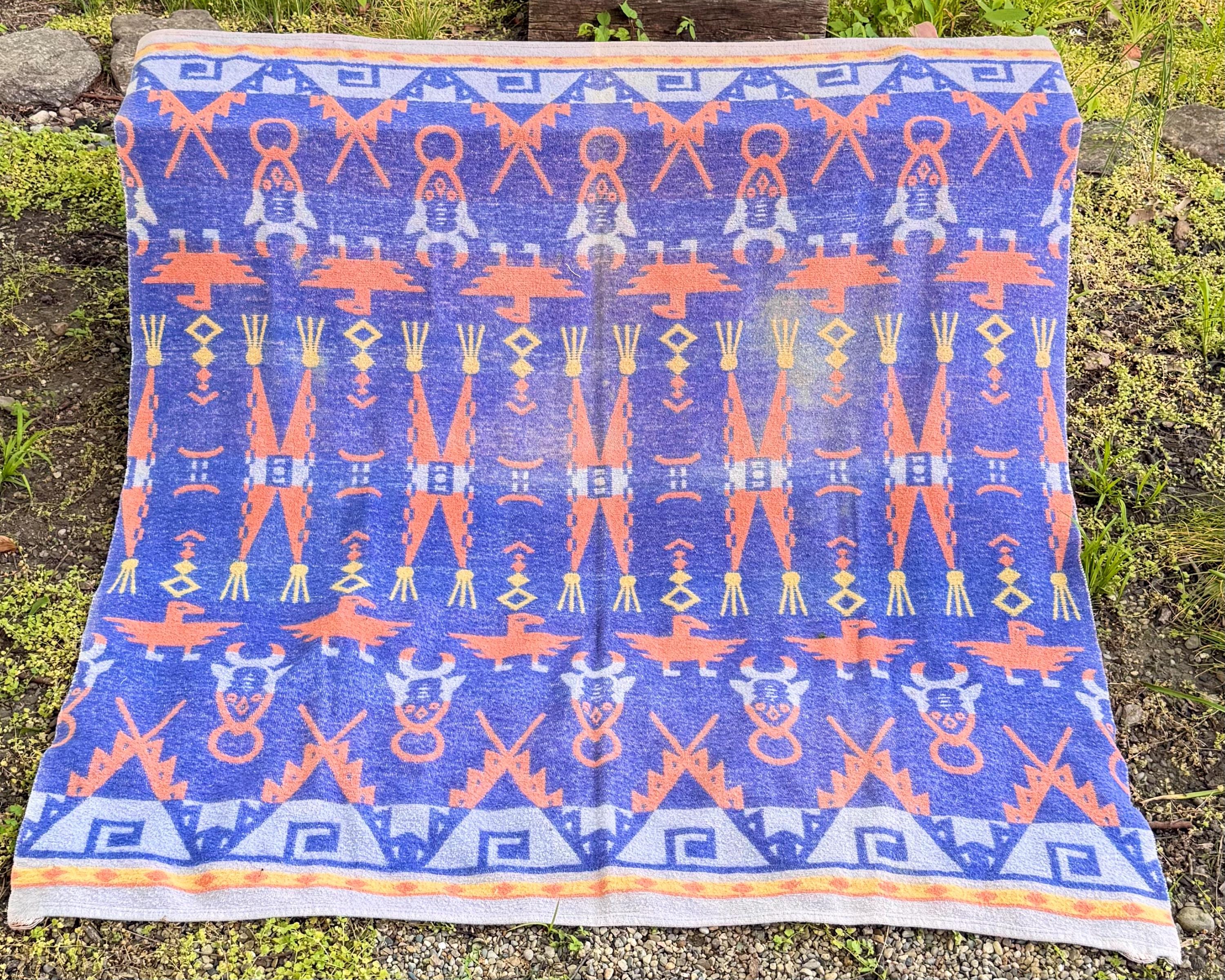 An authentic vintage camp blanket. features a pictorial southwestern woven pattern with thunderbird and bull motifs. no label but similar in style to the iconic Beacon blankets. crafted from an ultra soft fleece. reversible with one side mostly periwinkle blue and the other shows a striped desert pastel gradient. shows natural patina for a lived in look. excellent for a baby nursery as well as regular household or outdoor use.