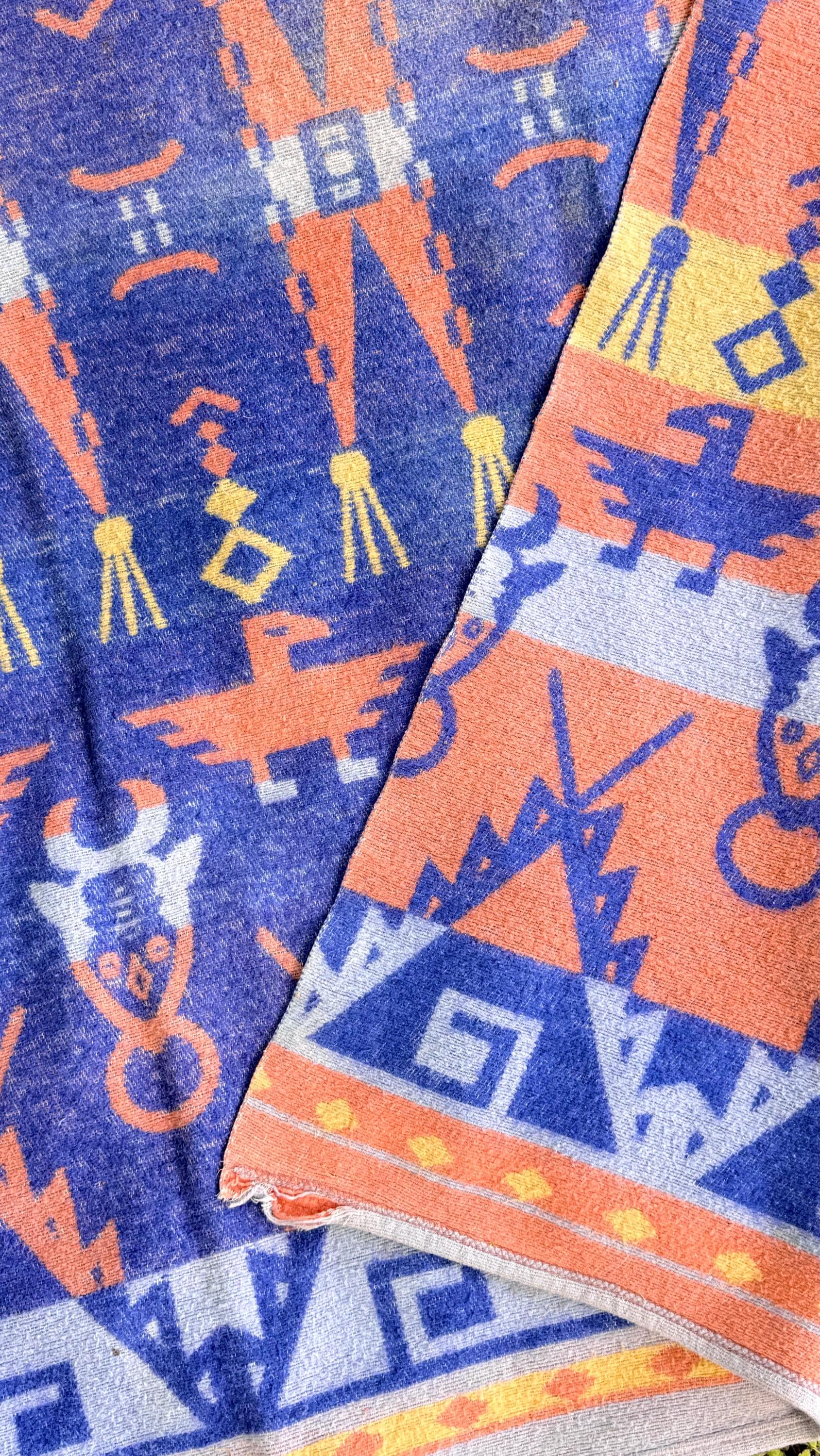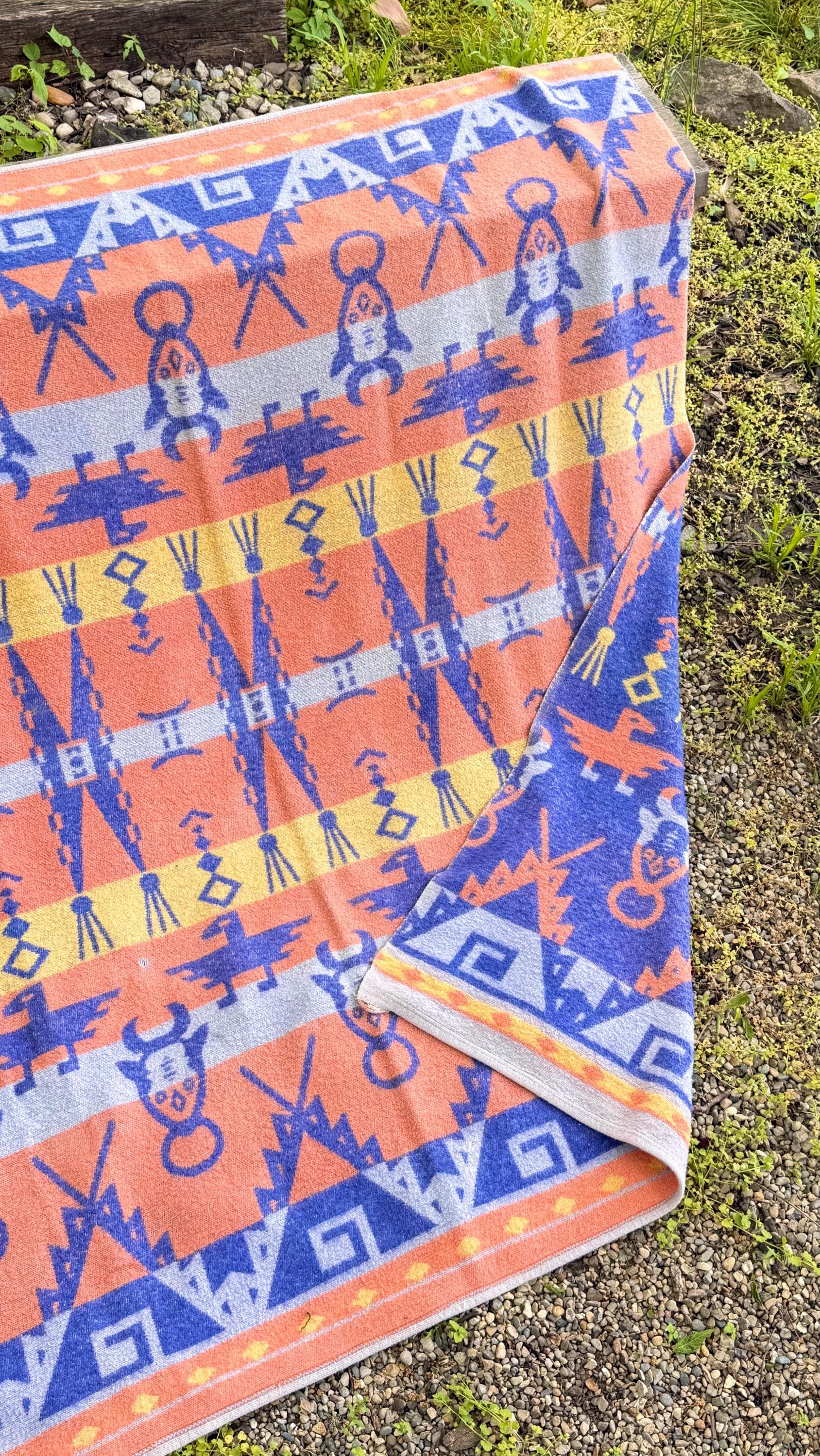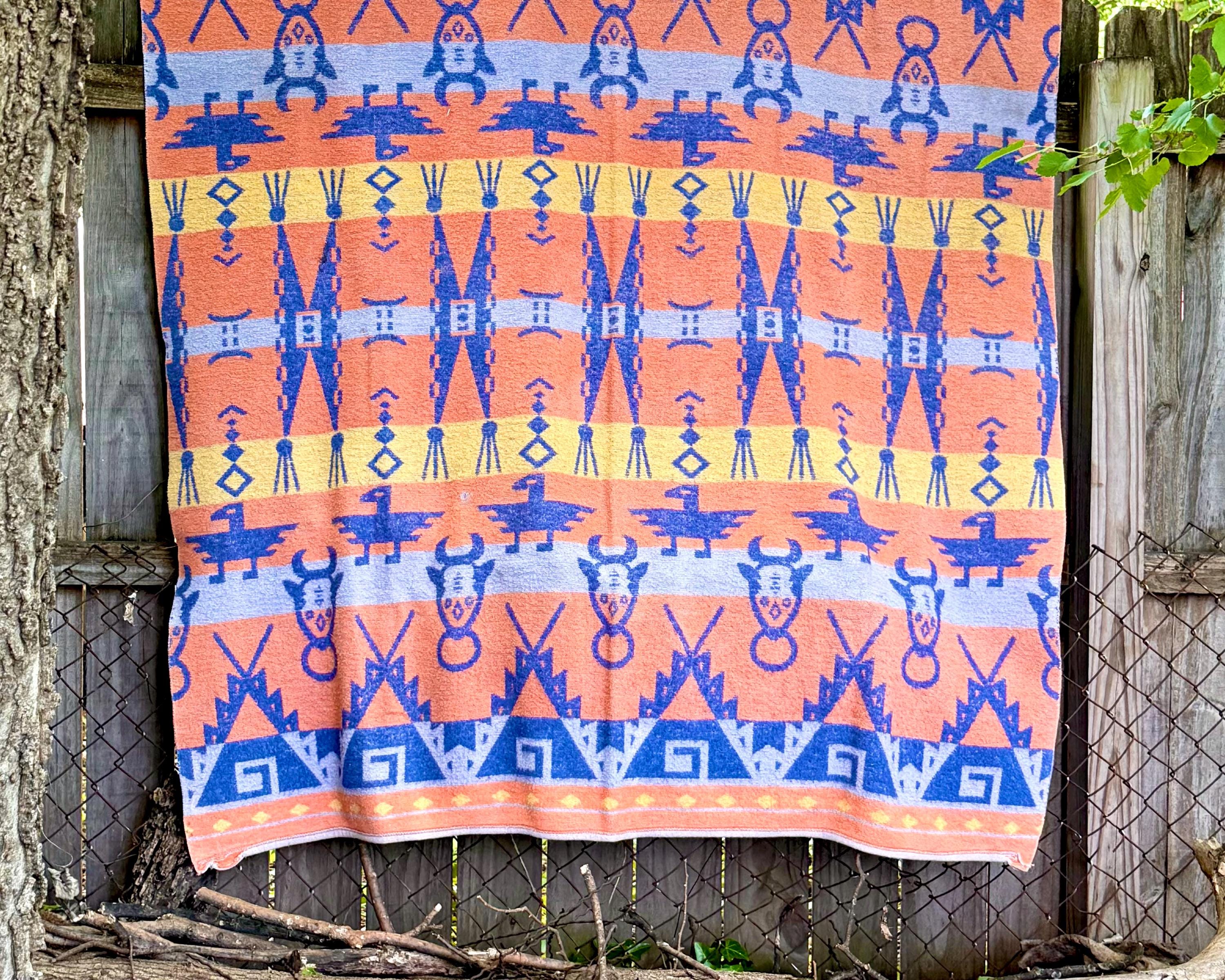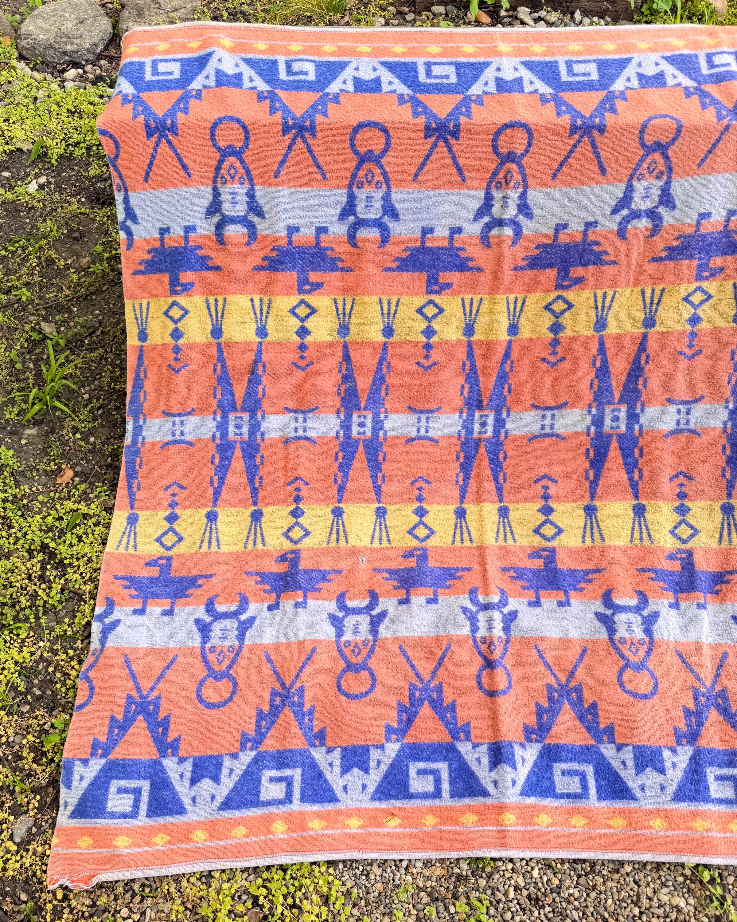 An authentic vintage camp blanket. features a pictorial southwestern woven pattern with thunderbird and bull motifs. no label but similar in style to the iconic Beacon blankets. crafted from an ultra soft fleece. reversible with one side mostly periwinkle blue and the other shows a striped desert pastel gradient. shows natural patina for a lived in look. excellent for a baby nursery as well as regular household or outdoor use.