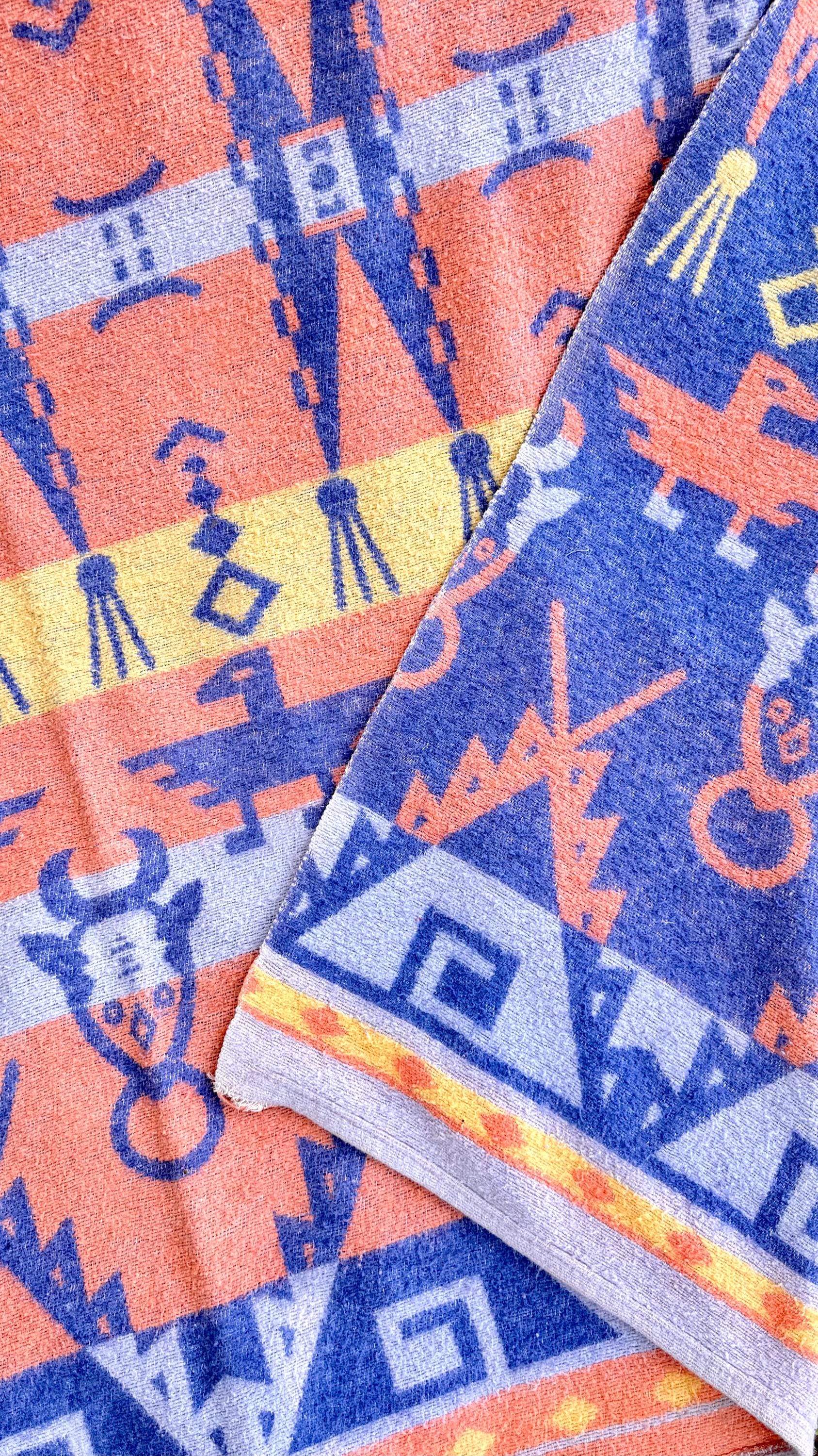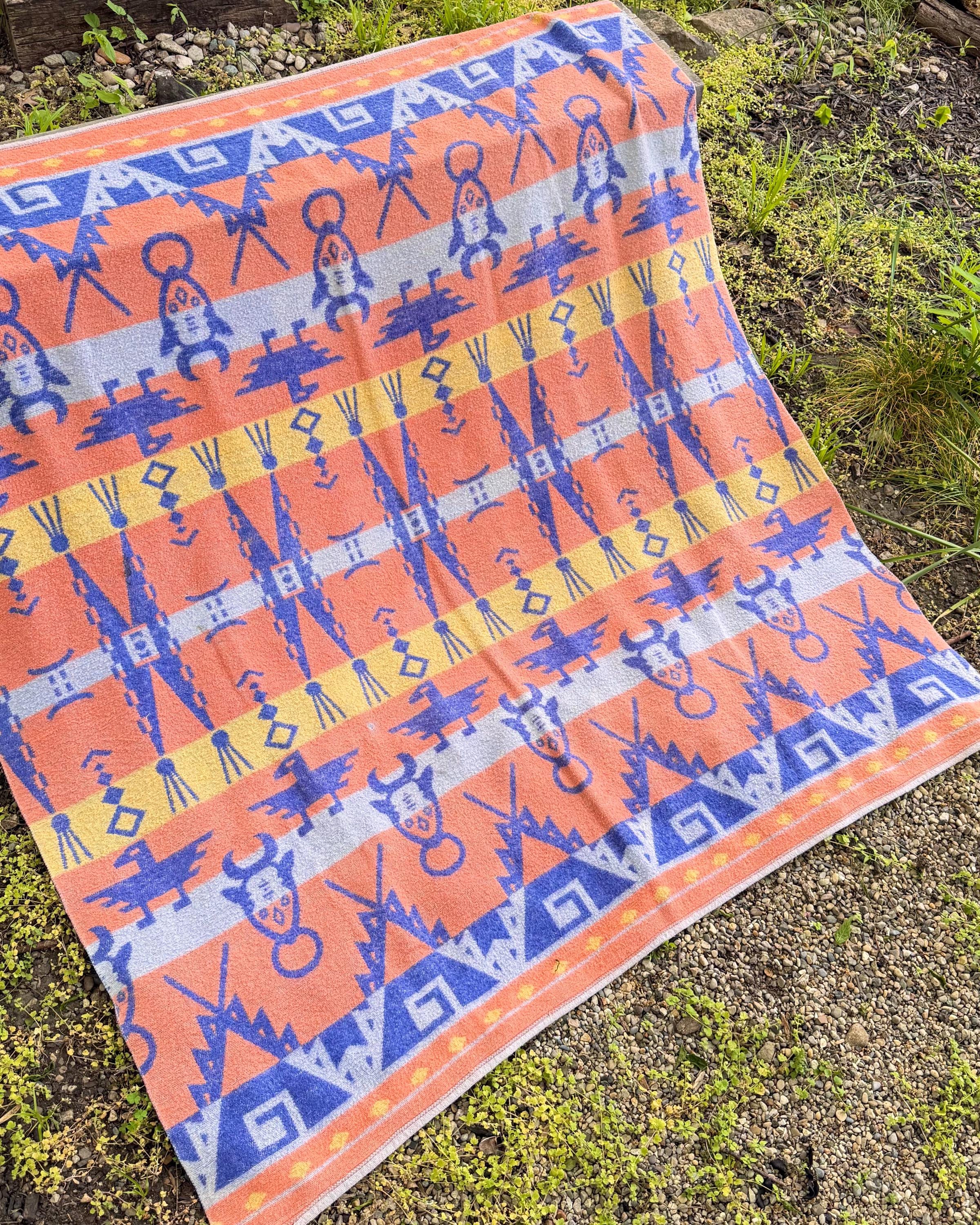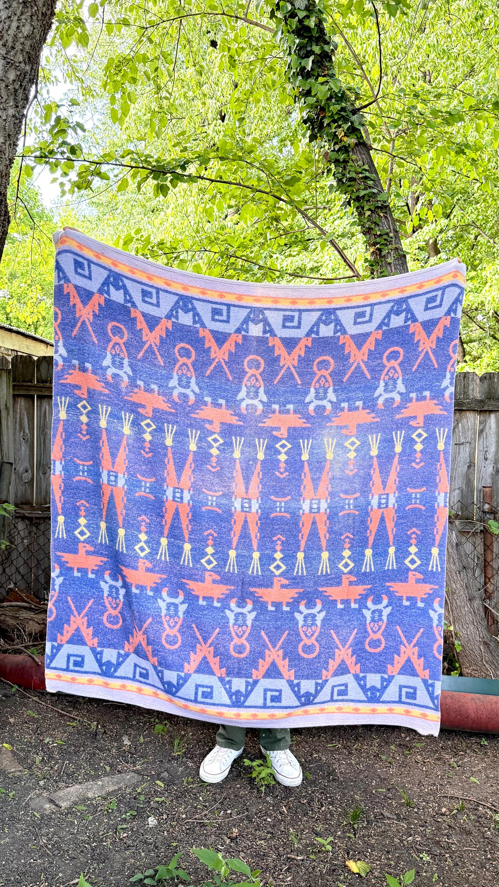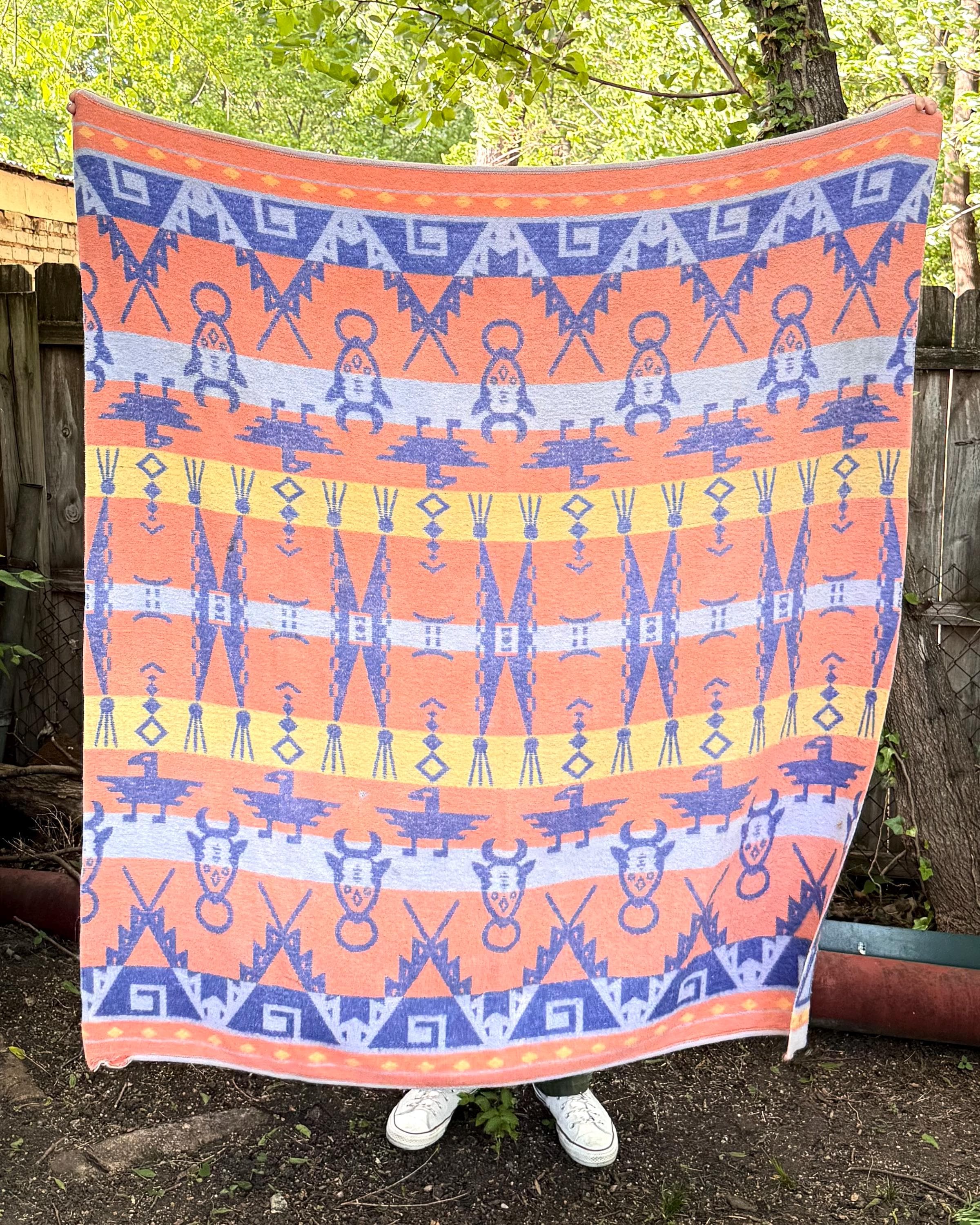 An authentic vintage camp blanket. features a pictorial southwestern woven pattern with thunderbird and bull motifs. no label but similar in style to the iconic Beacon blankets. crafted from an ultra soft fleece. reversible with one side mostly periwinkle blue and the other shows a striped desert pastel gradient. shows natural patina for a lived in look. excellent for a baby nursery as well as regular household or outdoor use.