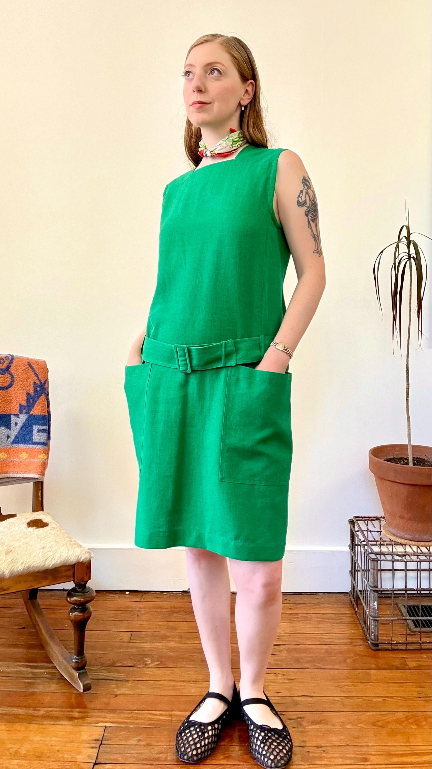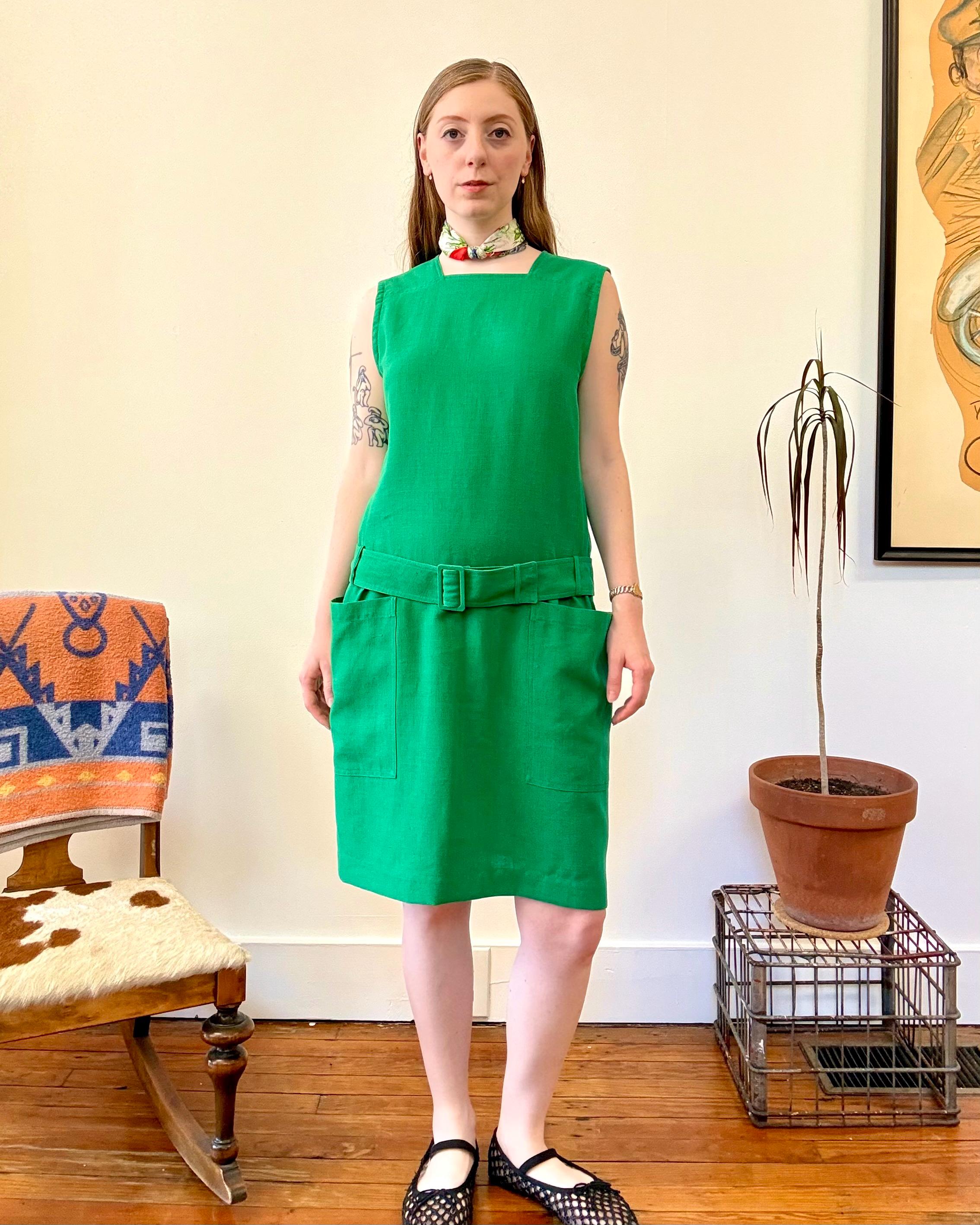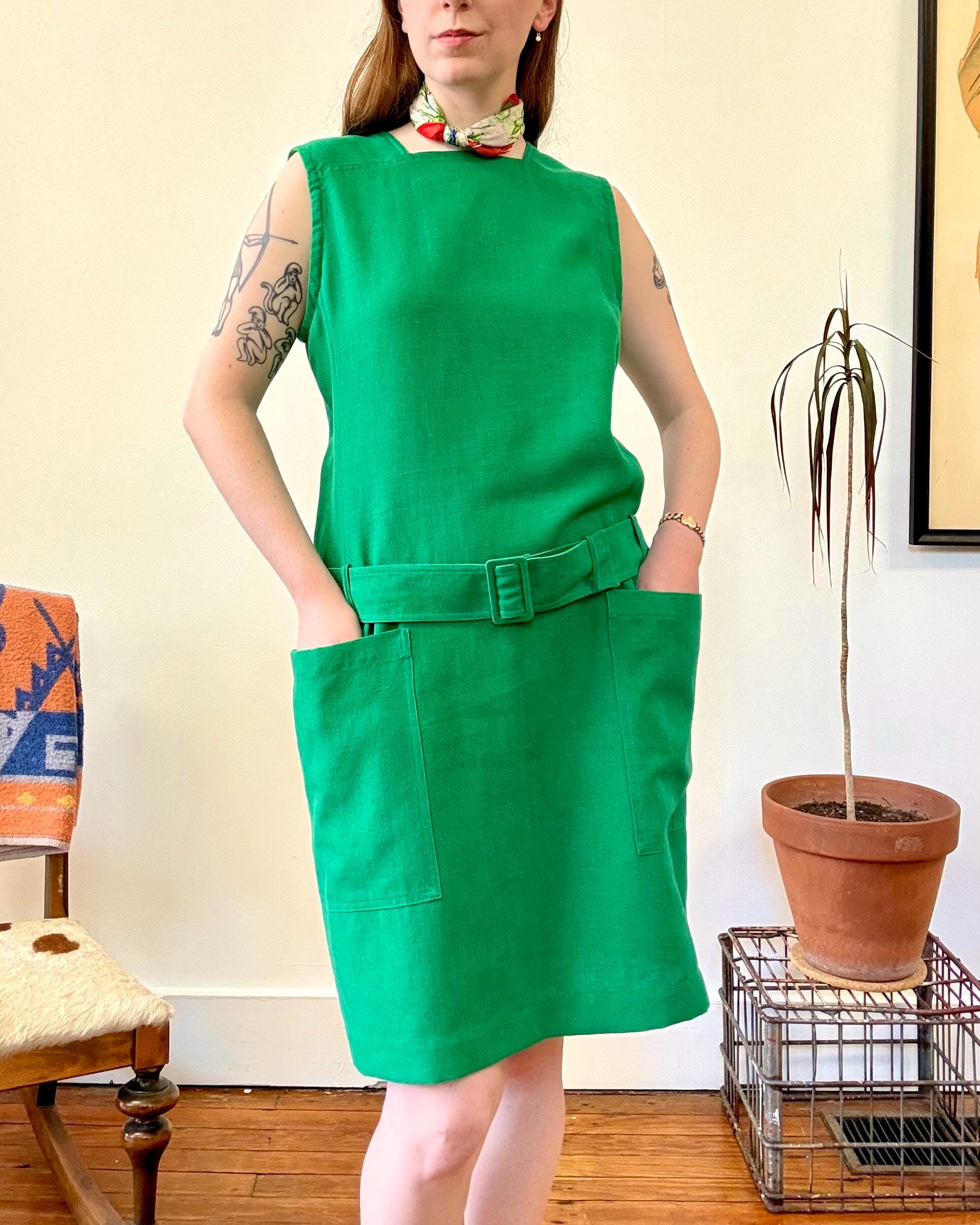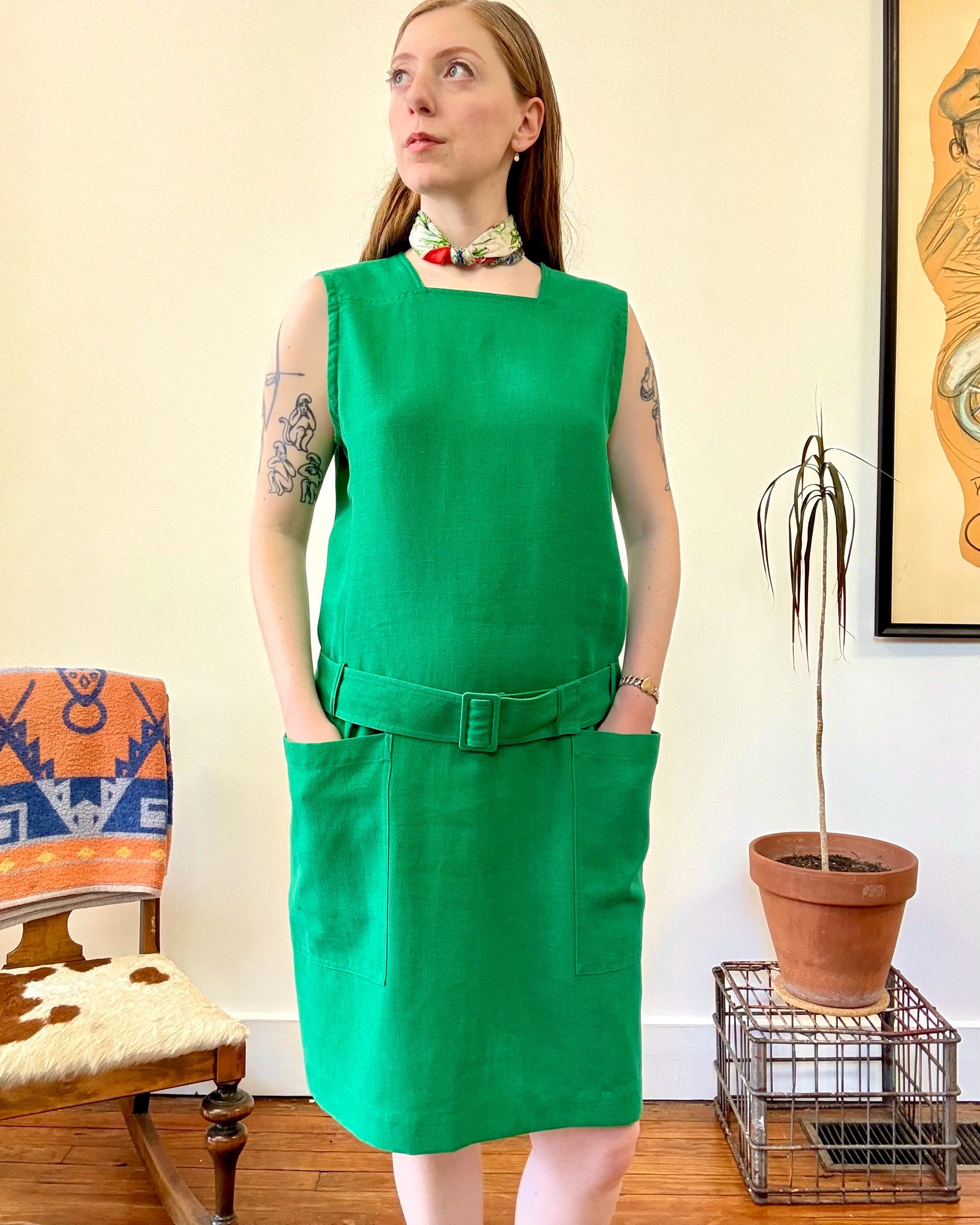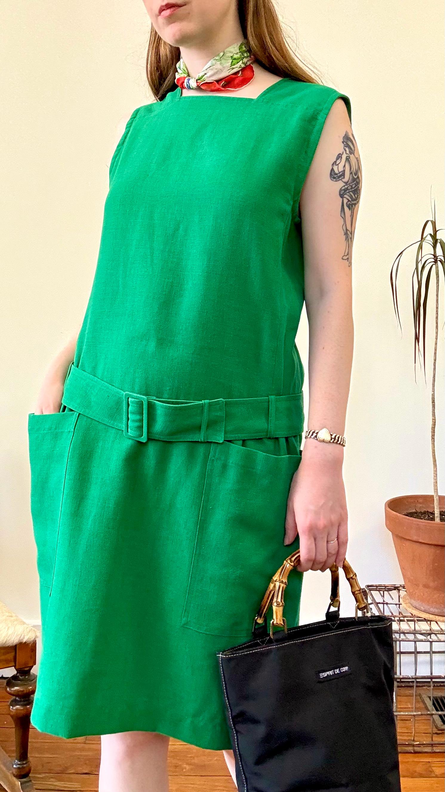 An authentic vintage designer dress by Guy Laroche. made in France. excellent French design inspired by mod fashion. a sleeveless shift style with a square neckline, pockets, fully adjustable belted drop waist. skirt panel designed to lay flat against the hip with tailored bodice ; a relaxed and chic silhouette.