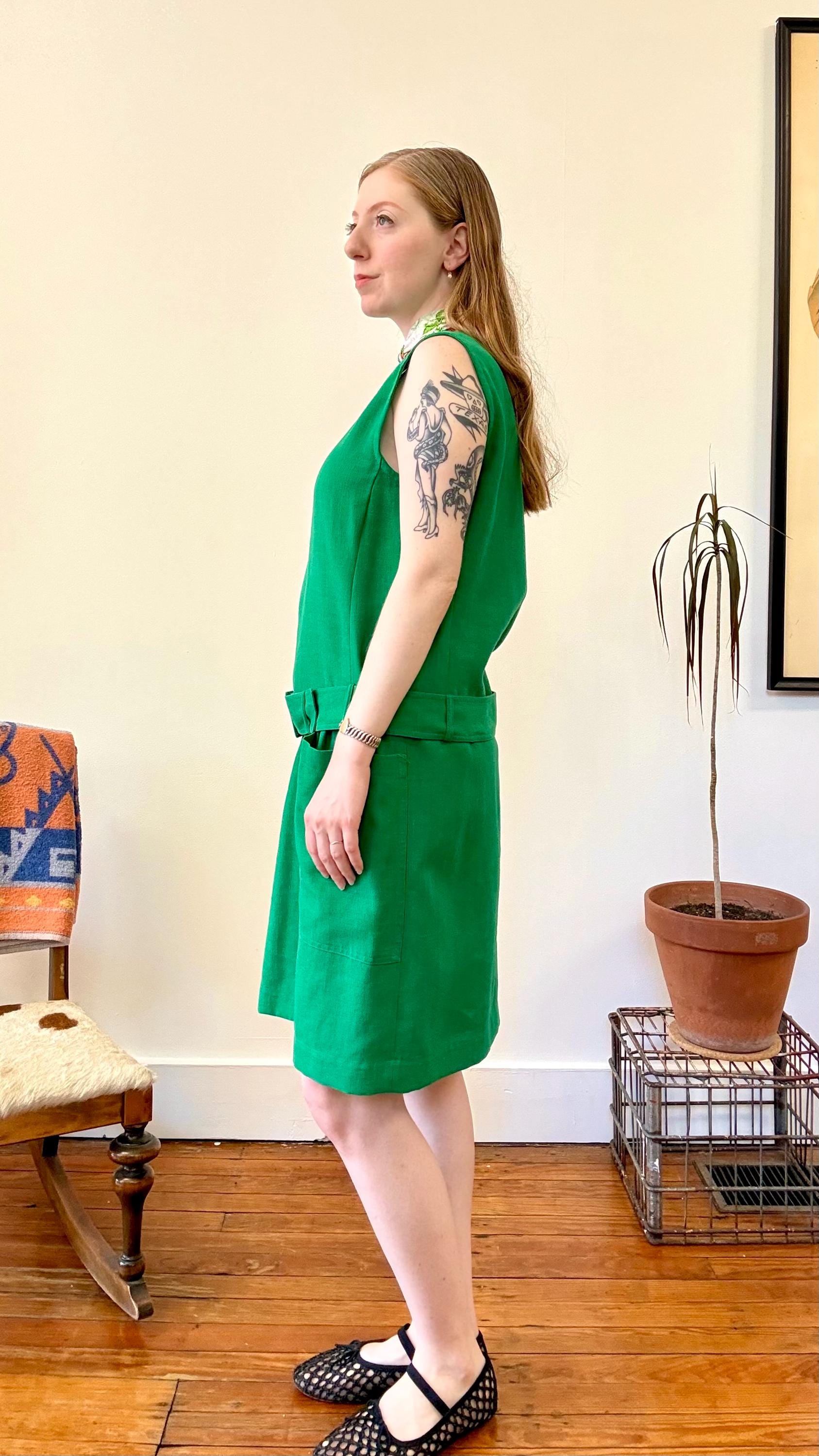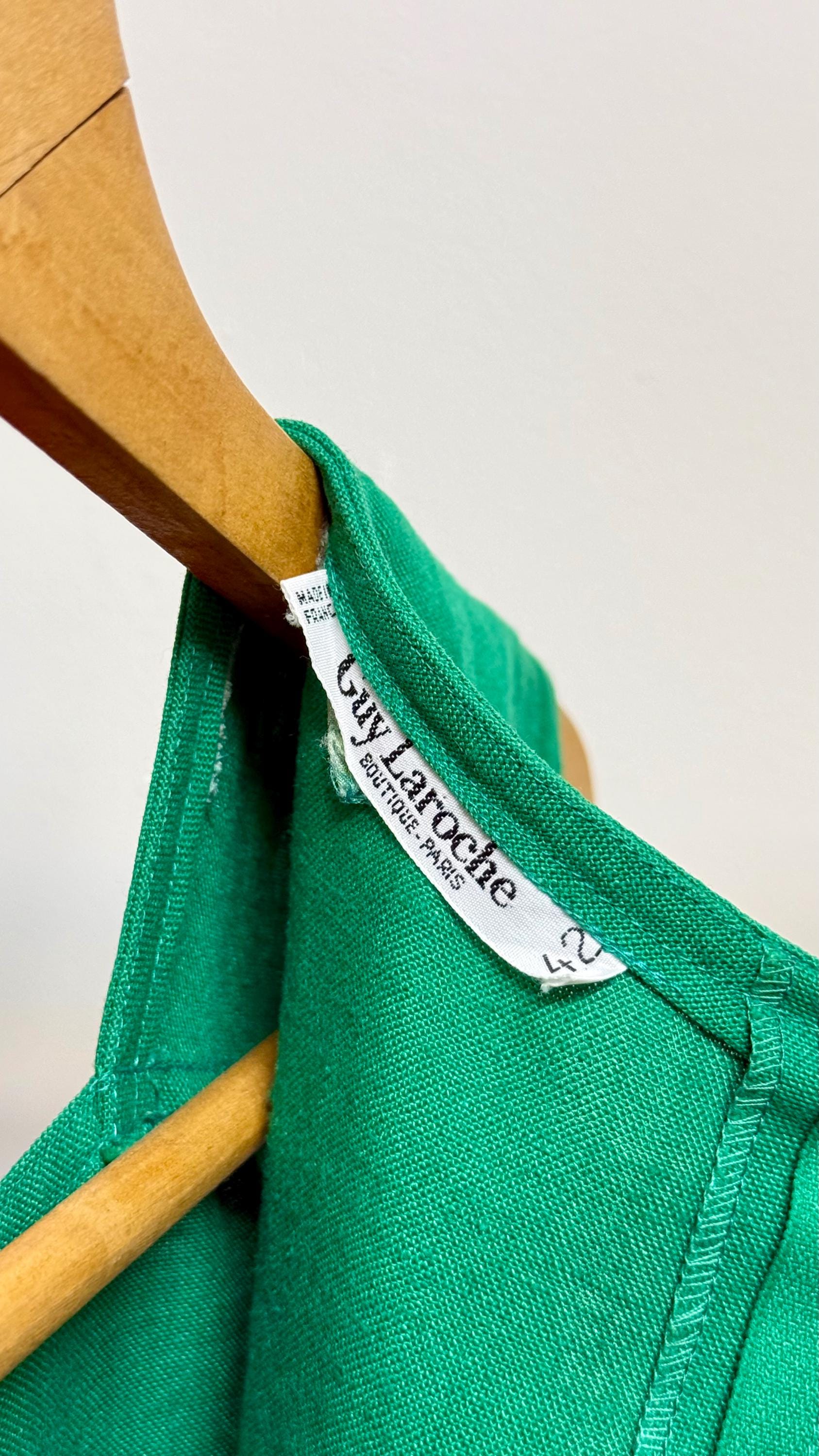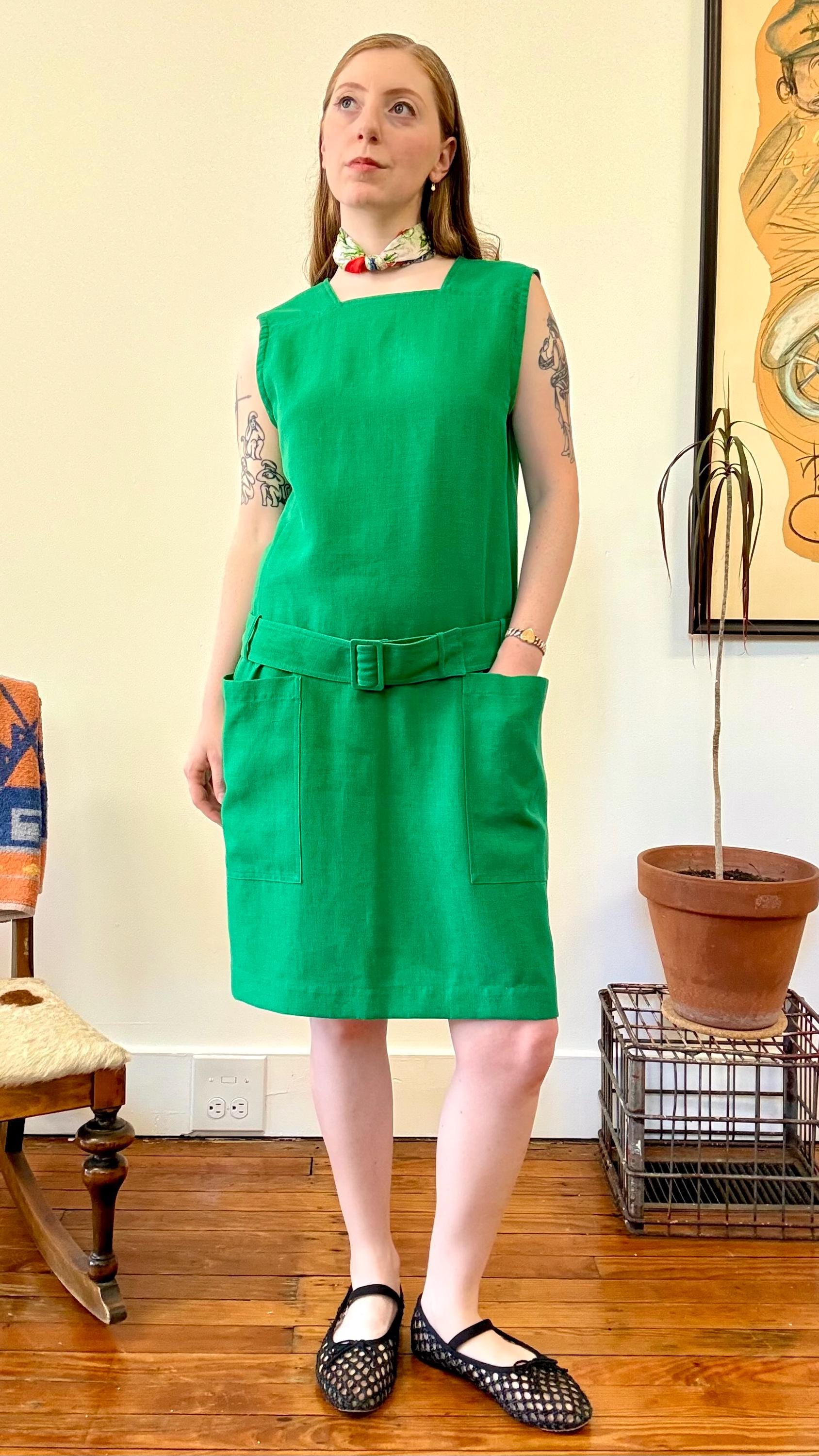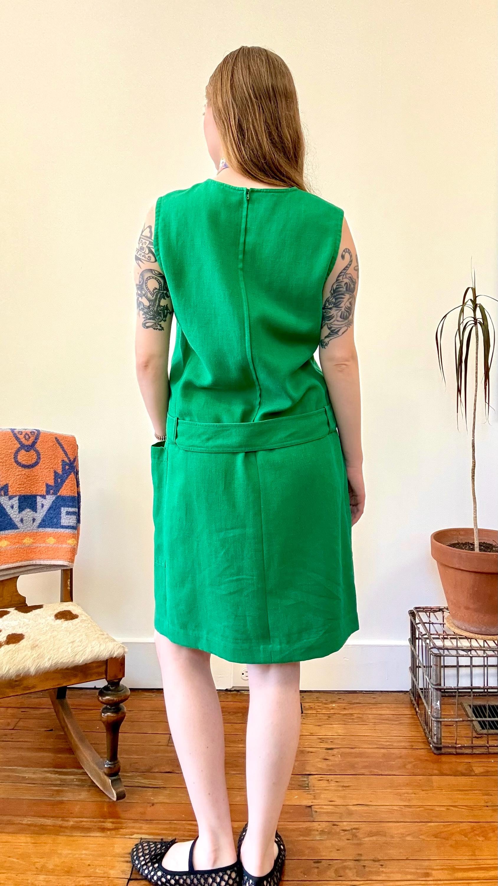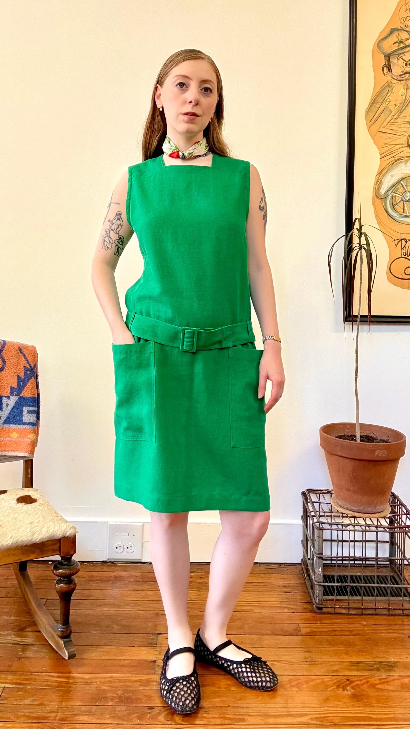 An authentic vintage designer dress by Guy Laroche. made in France. excellent French design inspired by mod fashion. a sleeveless shift style with a square neckline, pockets, fully adjustable belted drop waist. skirt panel designed to lay flat against the hip with tailored bodice ; a relaxed and chic silhouette.