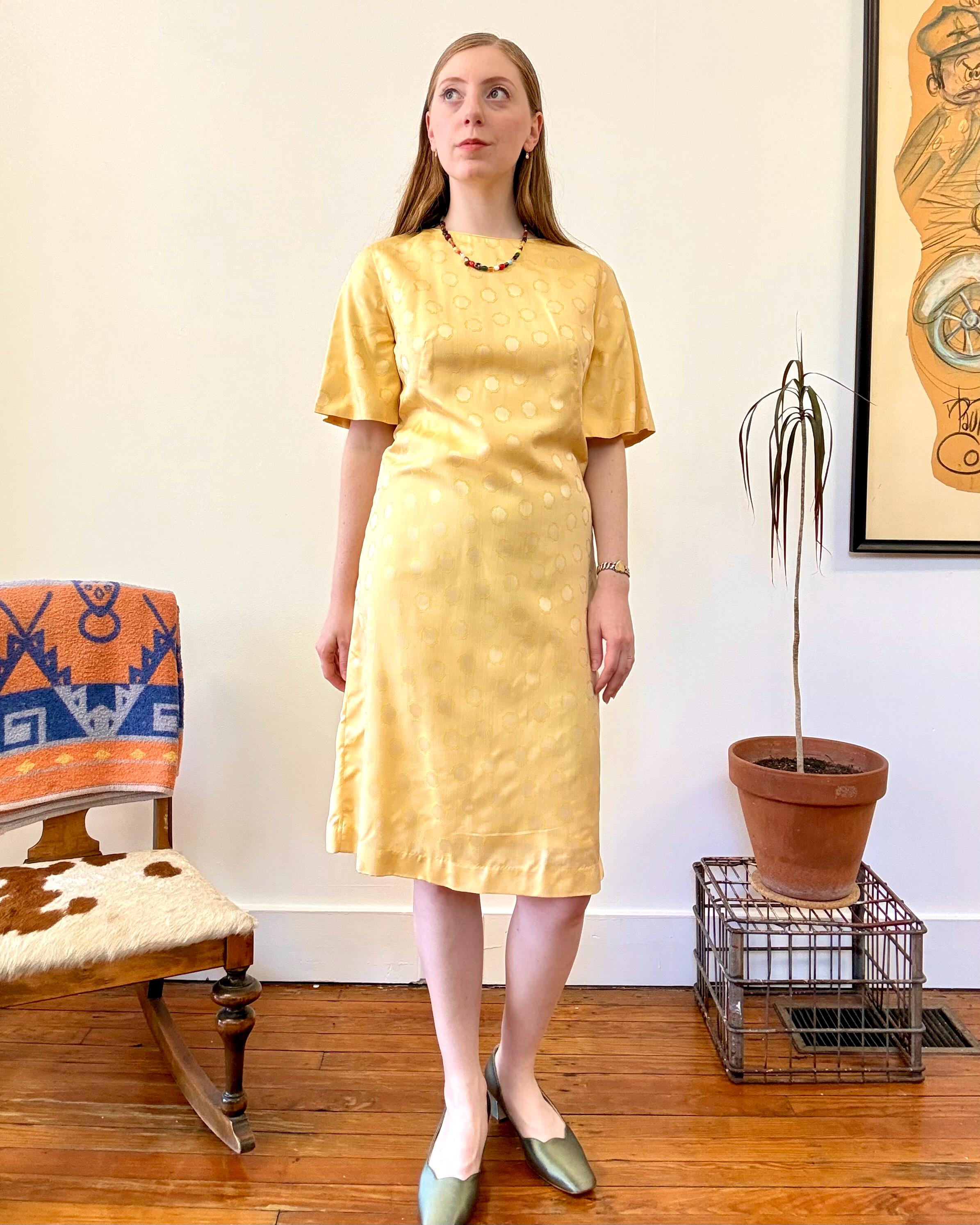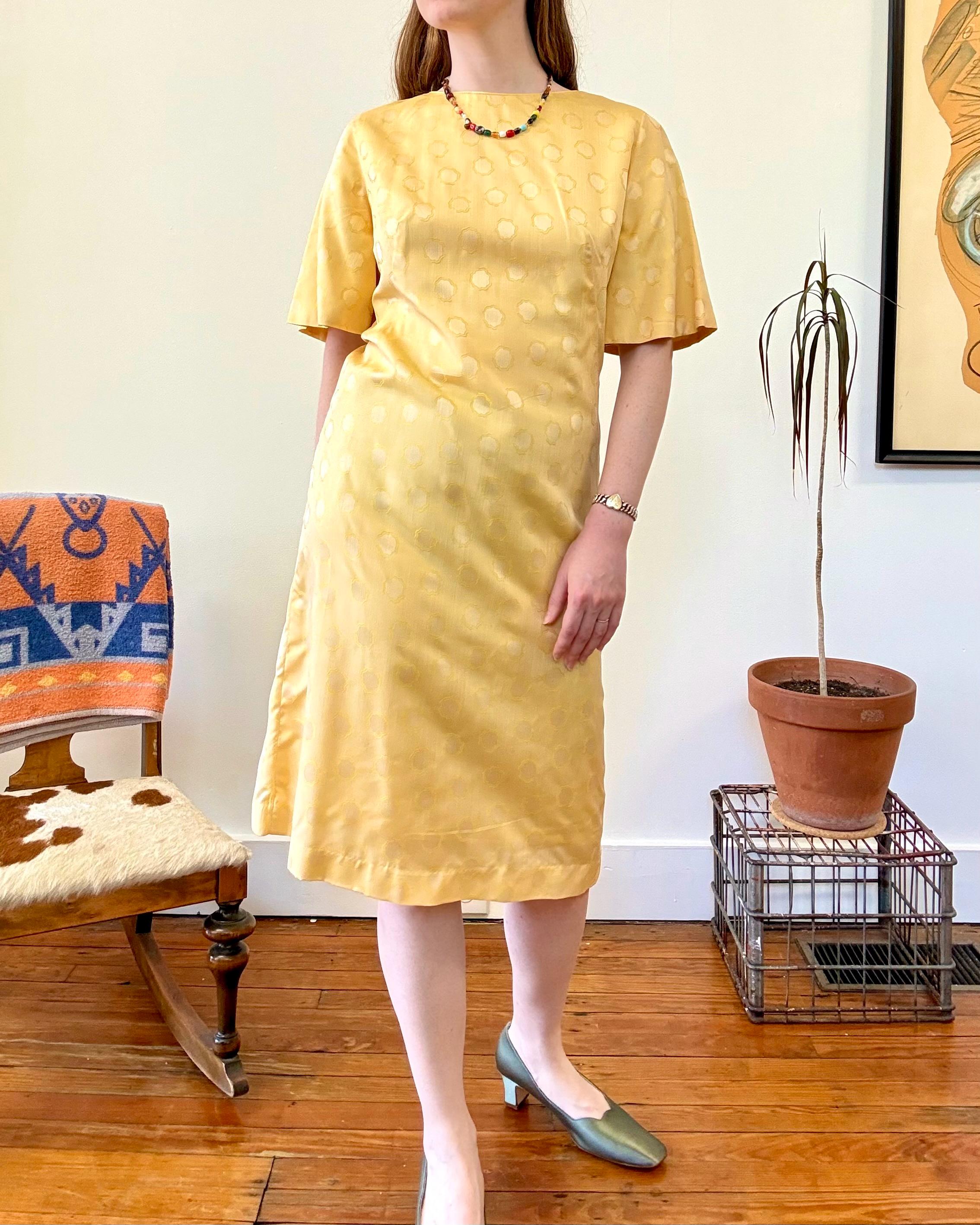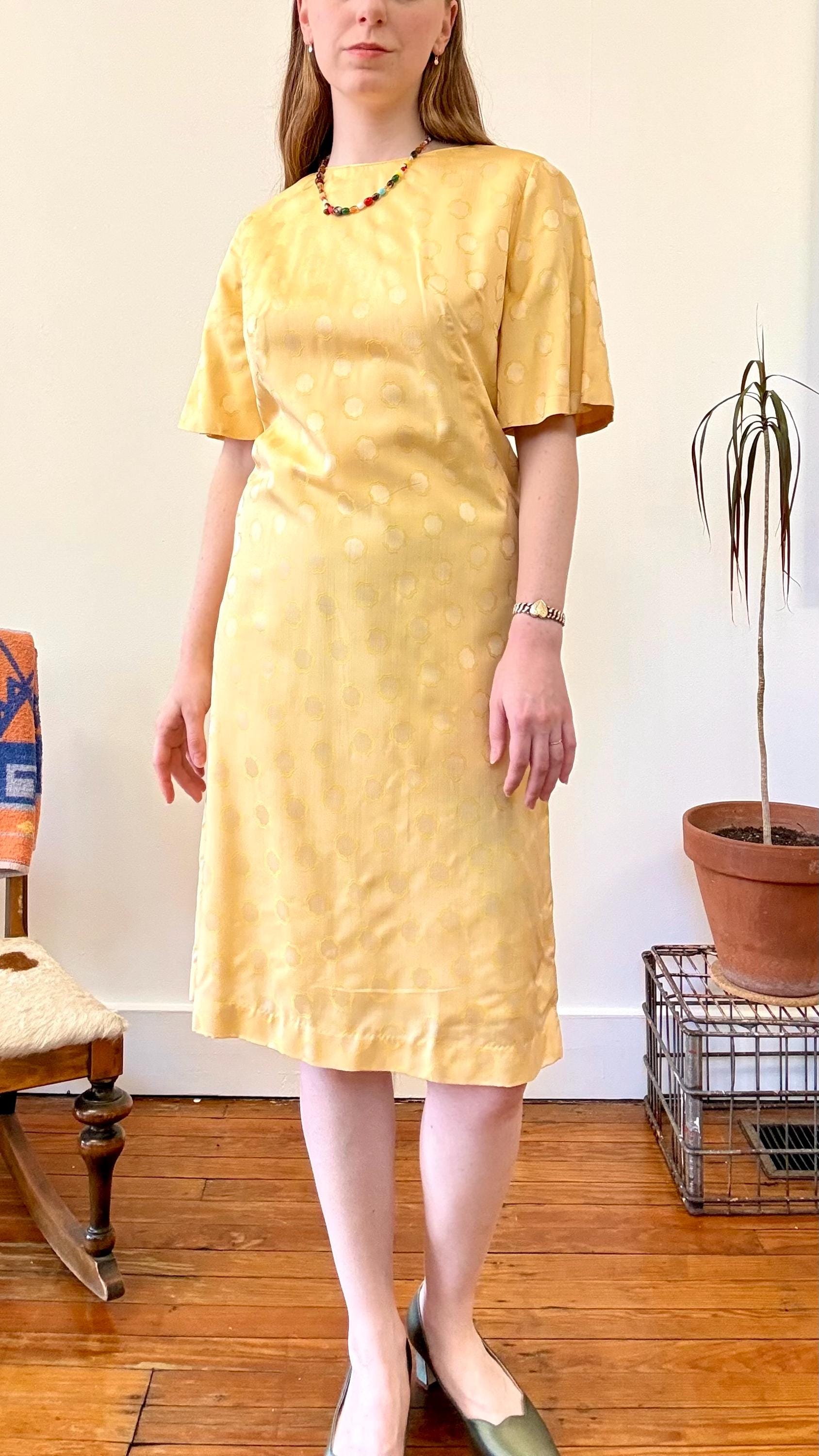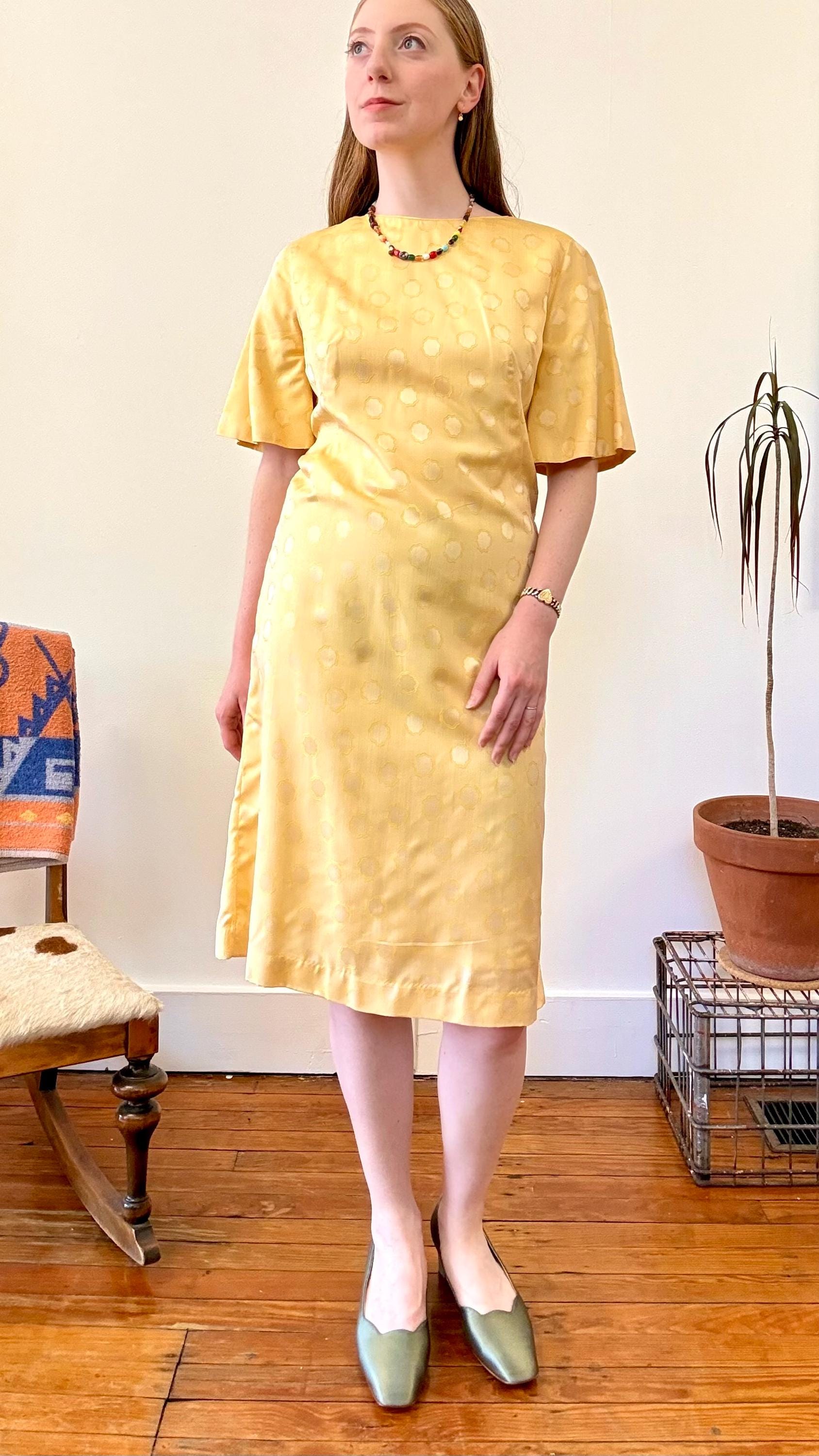 An authentic vintage designer dress by unknown Alabama label, Enid. a classic midcentury shift dress that really comes to life when worn. the sleeve, shoulder, and hip are just slightly tailored to create a very elegant and comfortable silhouette. the half length sleeves have a subtle “flutter” to them. crafted from a luxurious lightweight woven silk with abstract dot pattern and soft satin finish. fully lined. zips up the back with a metal zipper. they really don’t make dresses like this anymore! dry clean only.