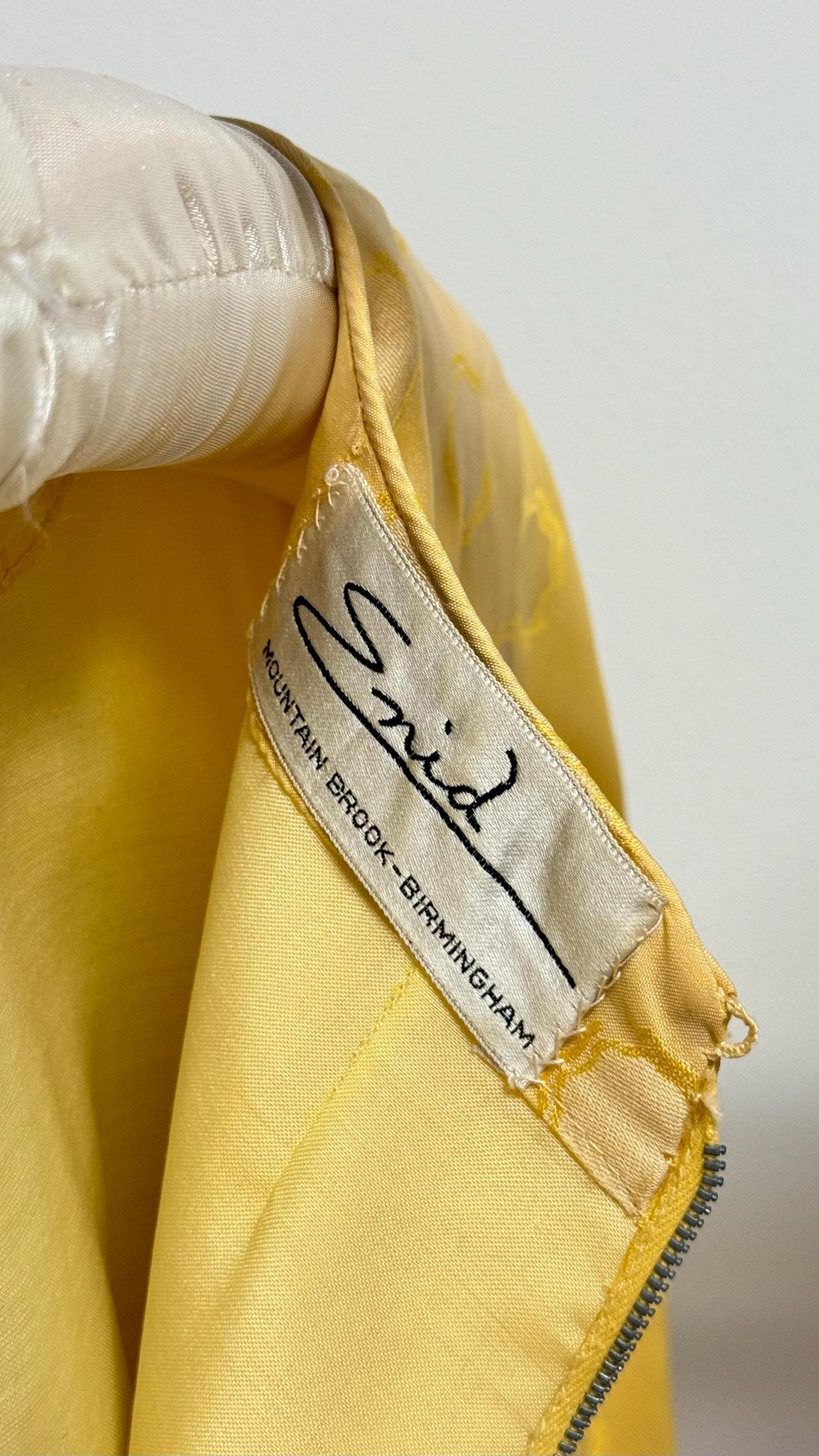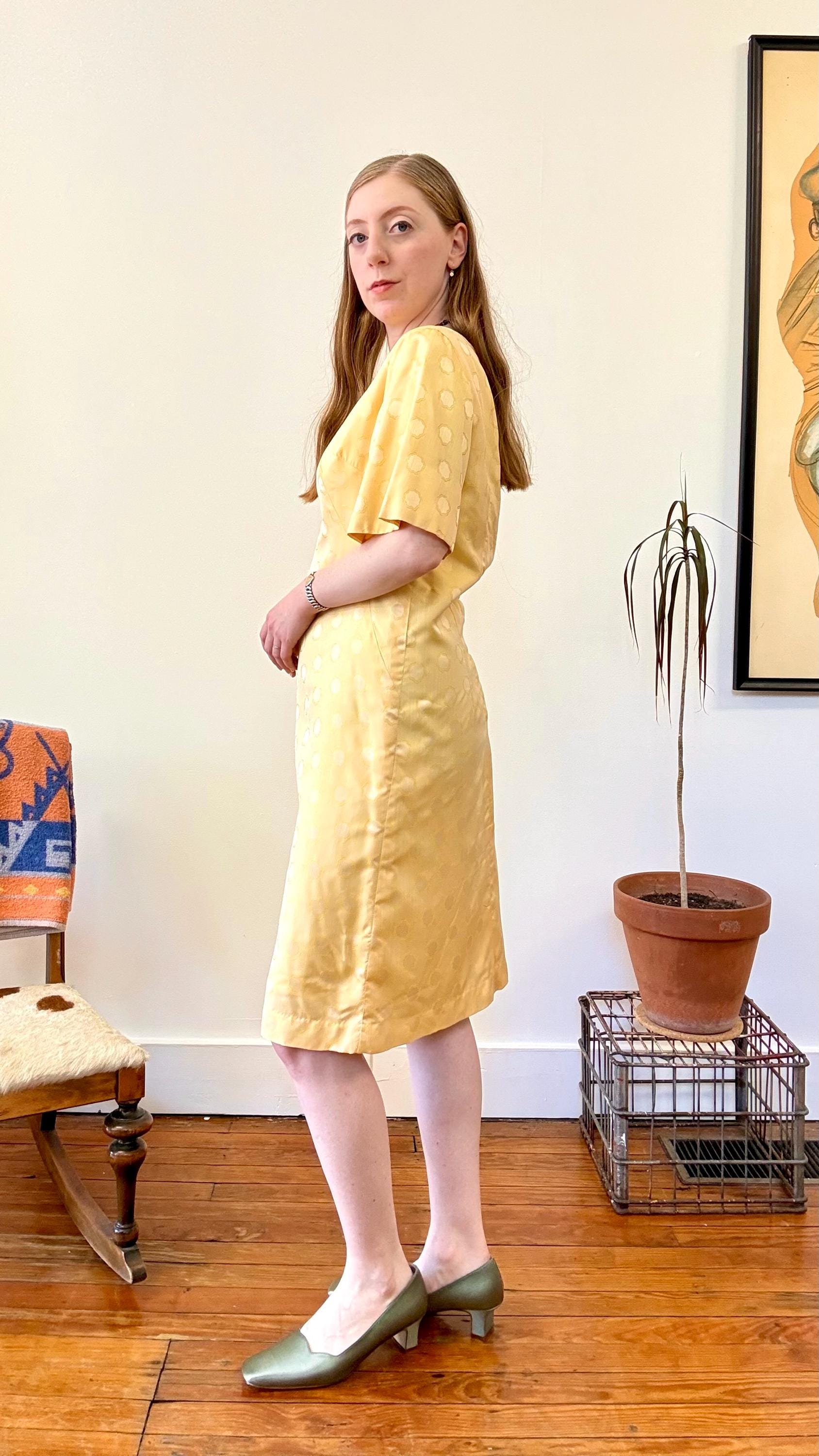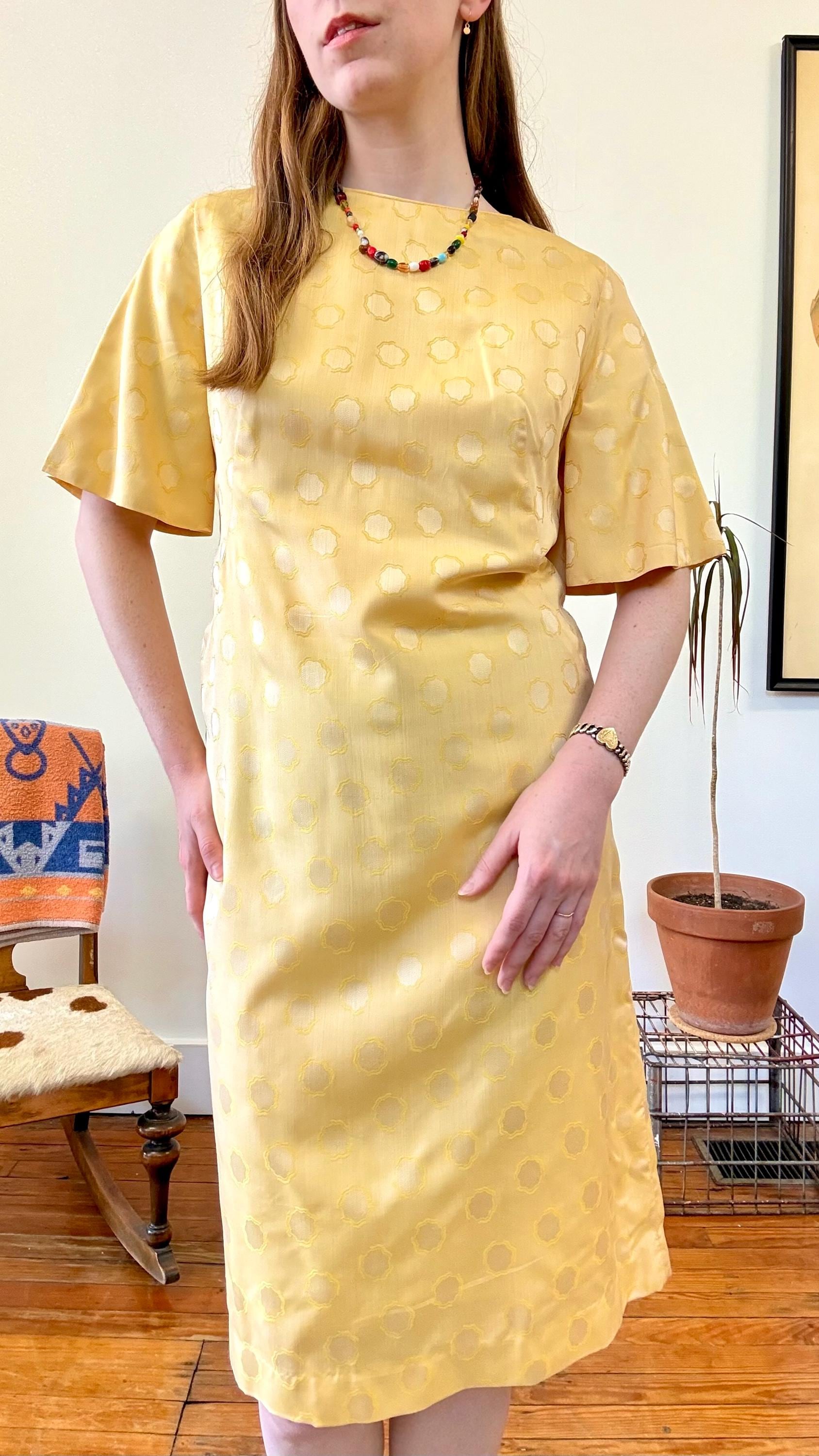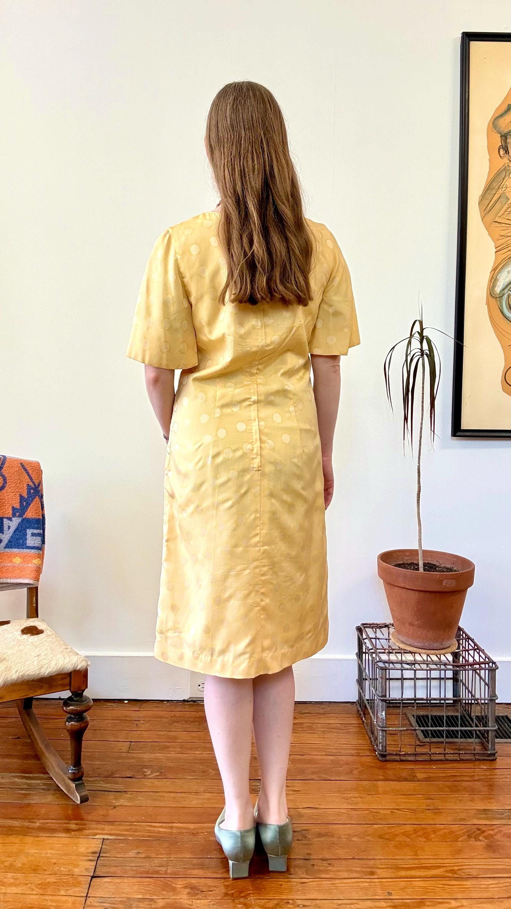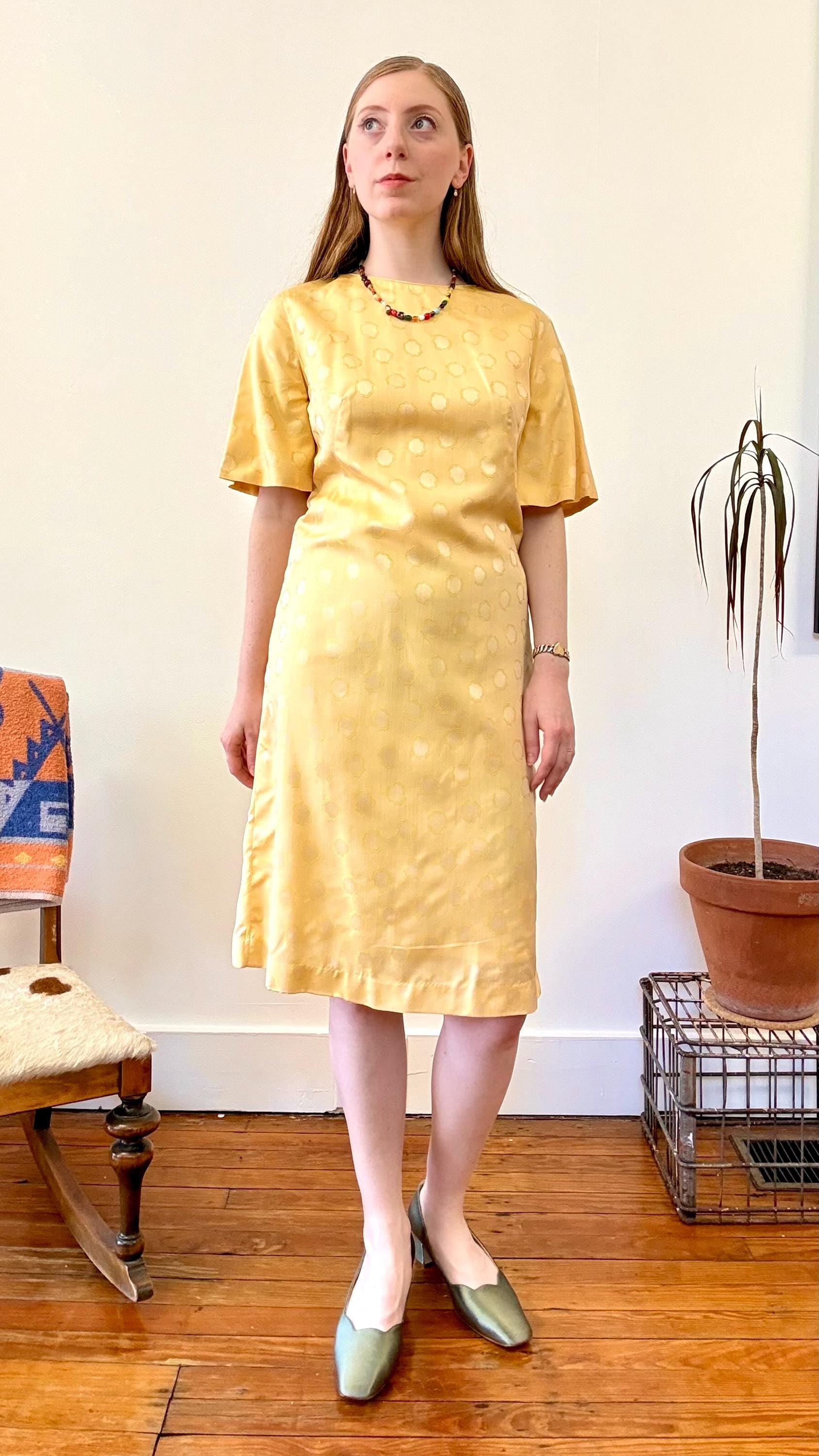 An authentic vintage designer dress by unknown Alabama label, Enid. a classic midcentury shift dress that really comes to life when worn. the sleeve, shoulder, and hip are just slightly tailored to create a very elegant and comfortable silhouette. the half length sleeves have a subtle “flutter” to them. crafted from a luxurious lightweight woven silk with abstract dot pattern and soft satin finish. fully lined. zips up the back with a metal zipper. they really don’t make dresses like this anymore! dry clean only.