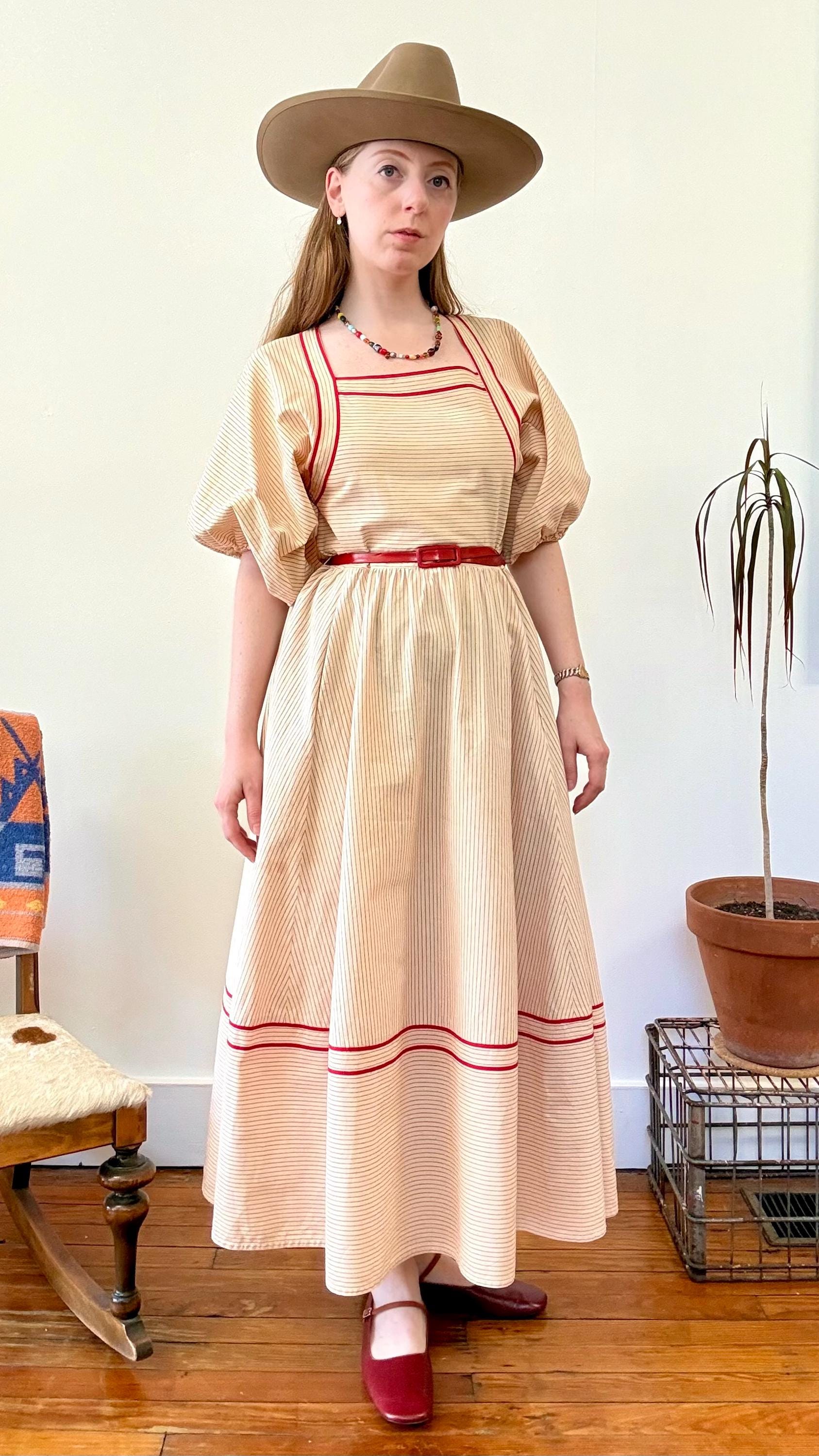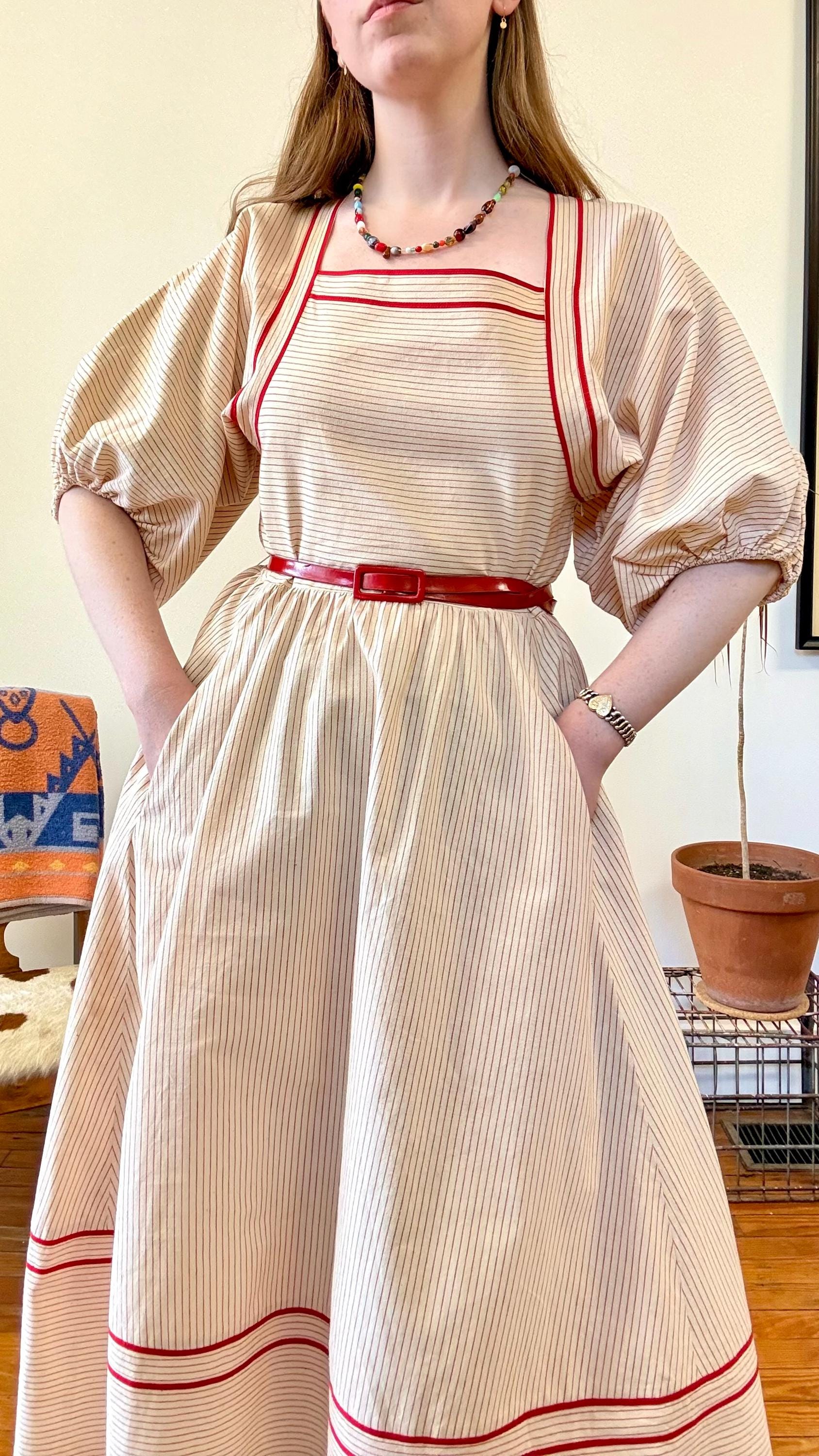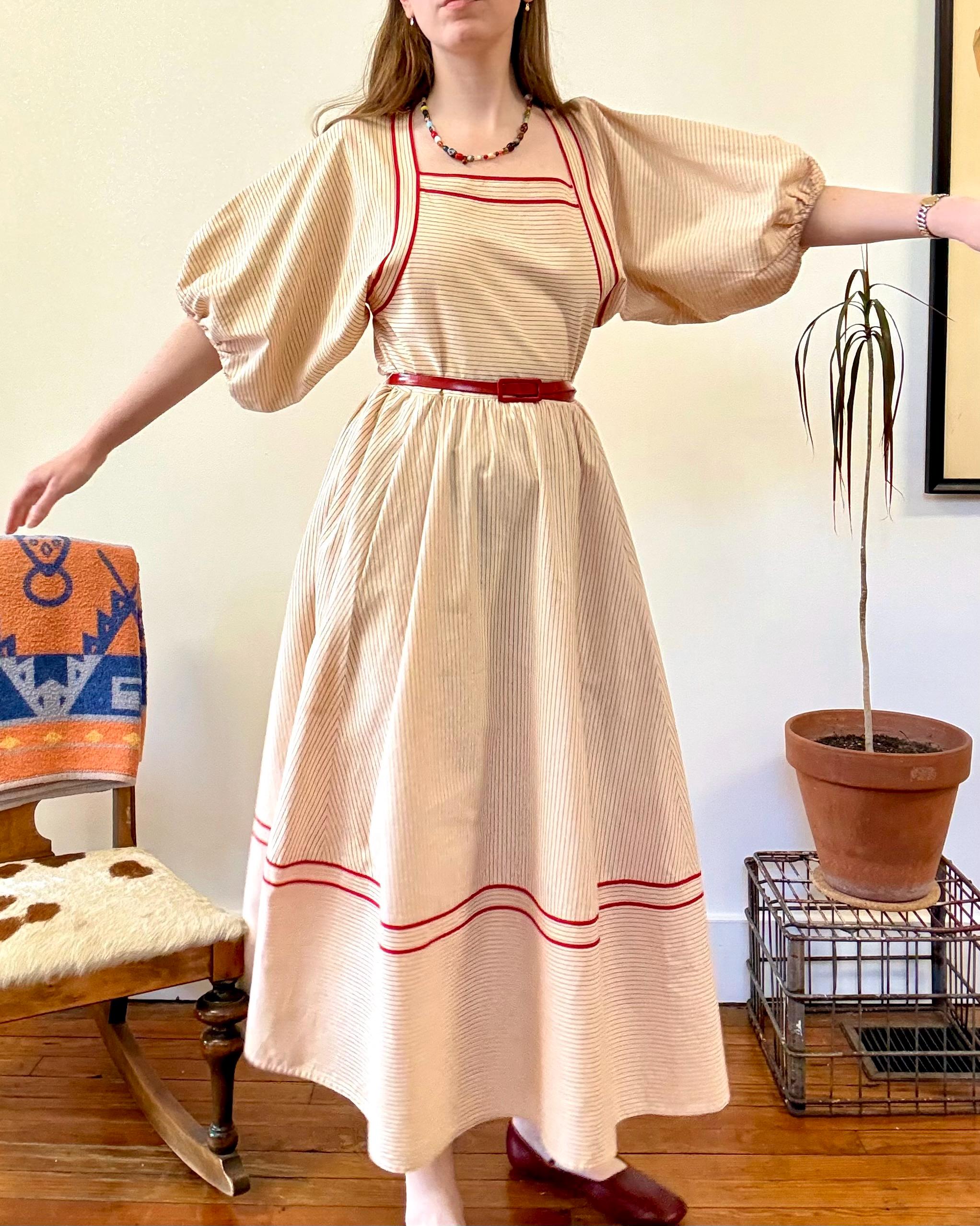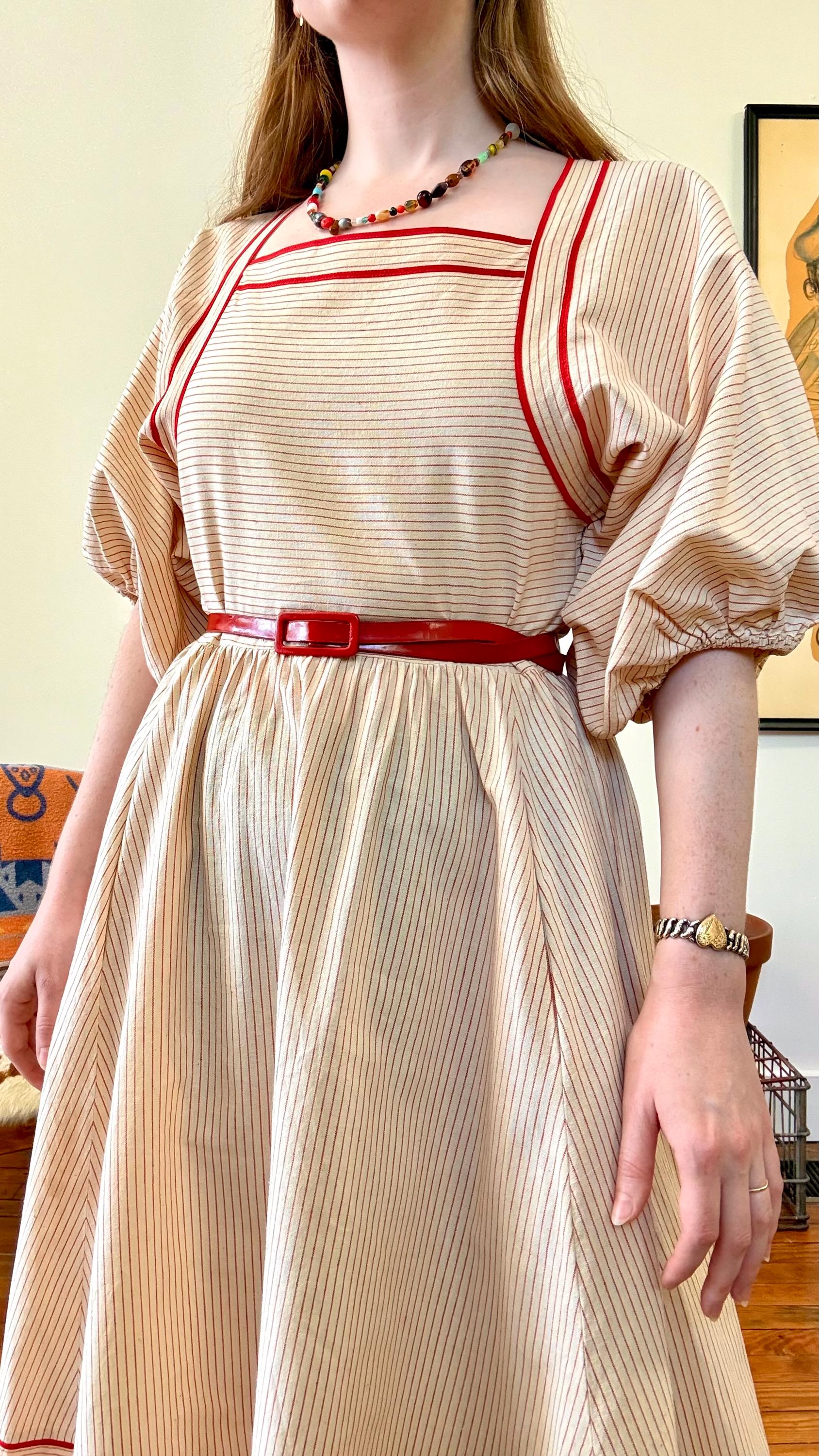 An authentic vintage designer dress by Albert Nipon. a stunning day dress style with oversized elasticized billowy sleeves, wide squared neckline, pockets, and full midi skirt. fastens with a nylon side zipper. crafted from a lightweight and slightly tinted natural canvas fabric with woven pinstripe pattern, finished with rayon trim. unlined. includes matching patent leather skinny belt. Neiman Marcus label. dry clean or gentle hand wash, hang dry.