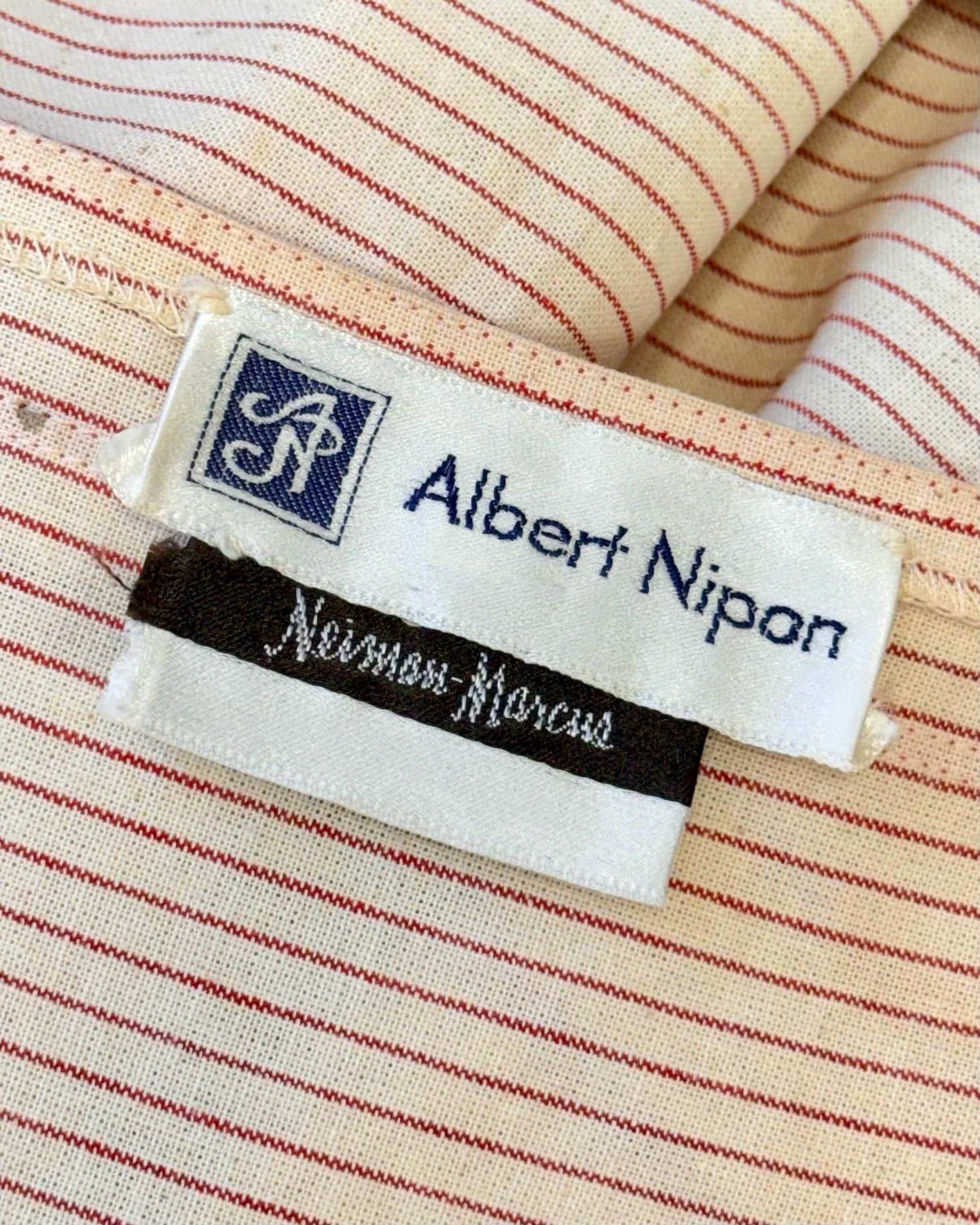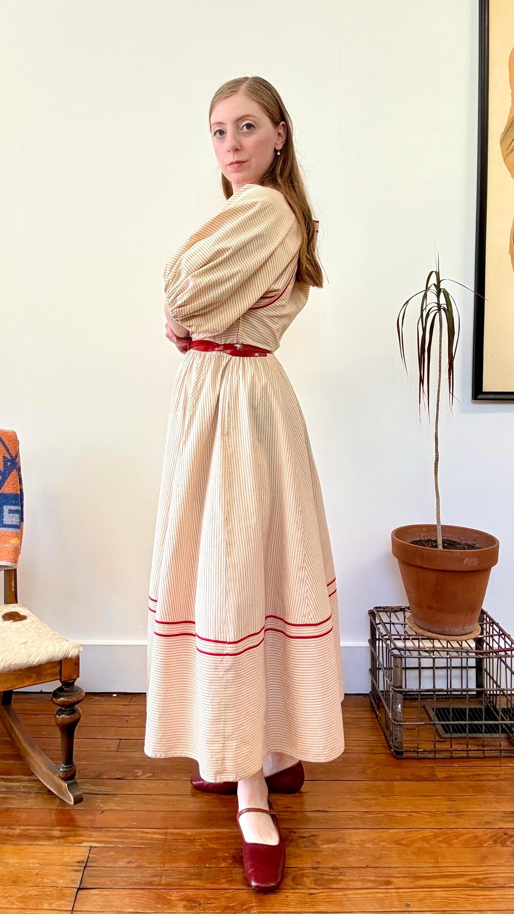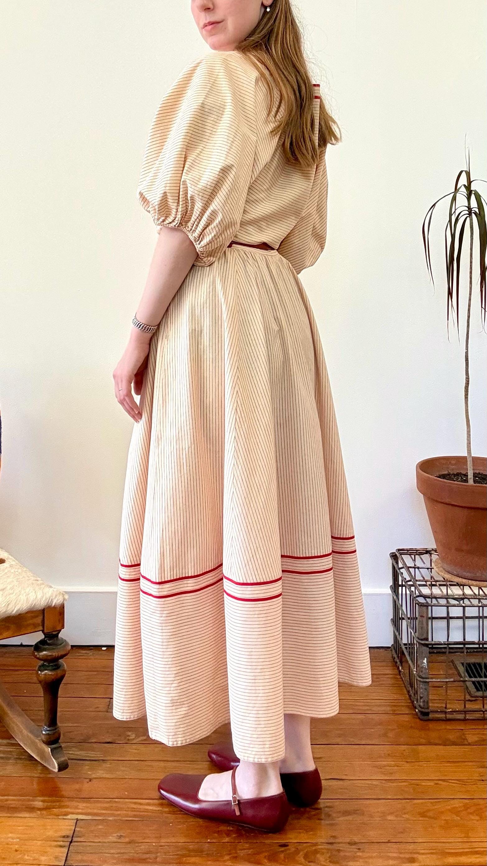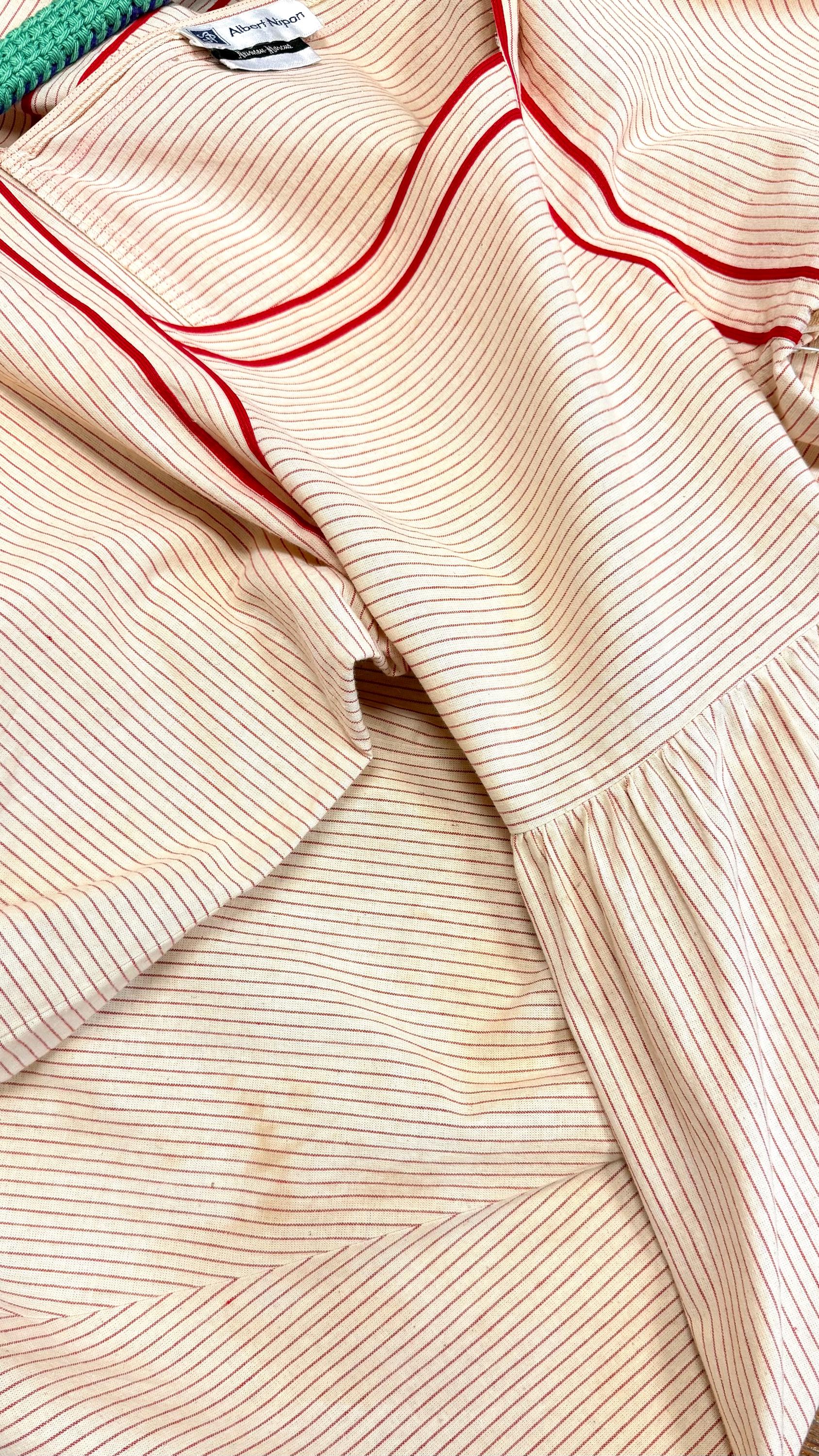 An authentic vintage designer dress by Albert Nipon. a stunning day dress style with oversized elasticized billowy sleeves, wide squared neckline, pockets, and full midi skirt. fastens with a nylon side zipper. crafted from a lightweight and slightly tinted natural canvas fabric with woven pinstripe pattern, finished with rayon trim. unlined. includes matching patent leather skinny belt. Neiman Marcus label. dry clean or gentle hand wash, hang dry.