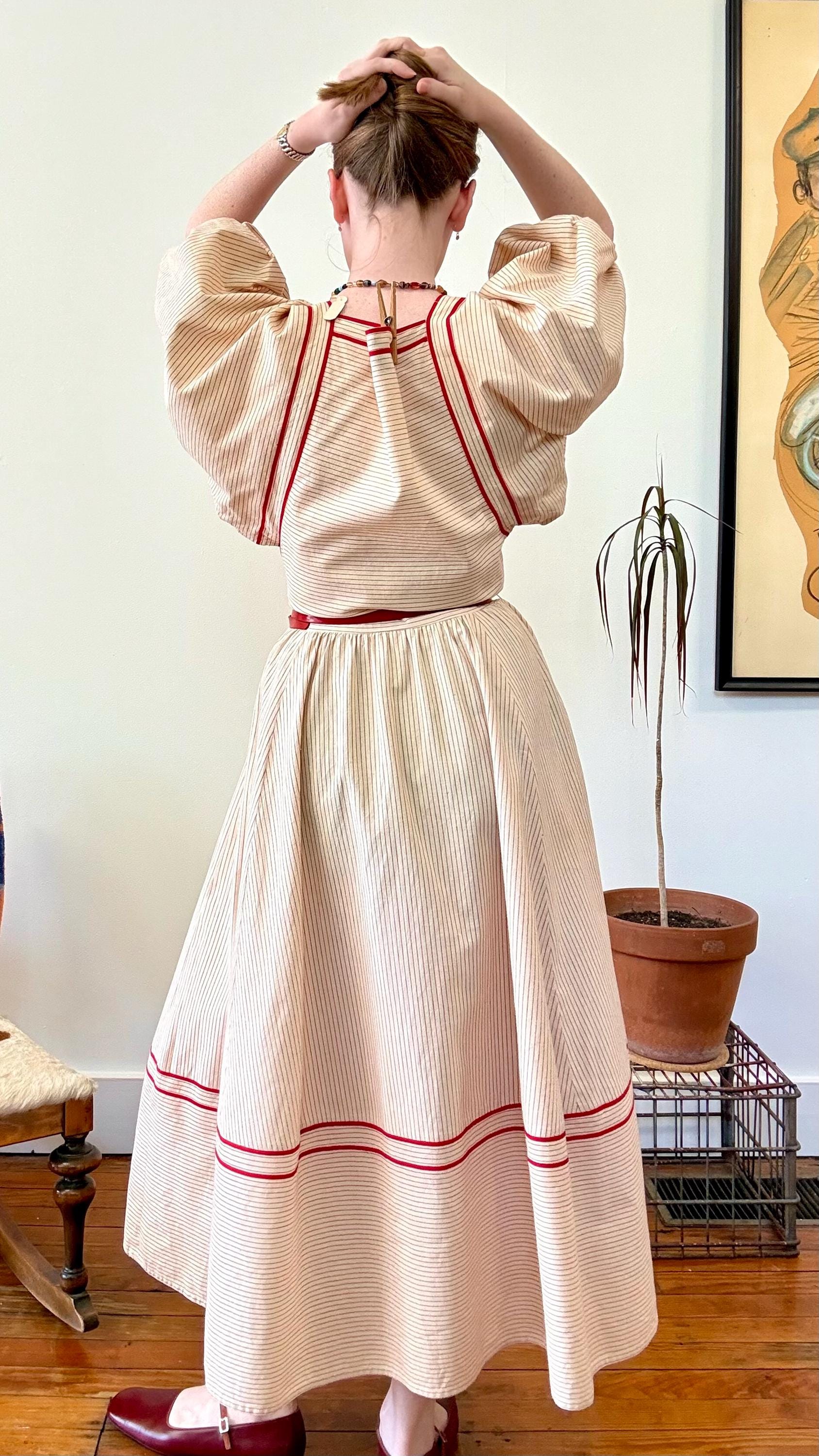 condition : great with subtle imperfection, appropriate signs of age and wear as seen in photos, faint stains along skirt side seam that didn’t fully lift after laundering - hardly noticed when worn and hide well in sweep of skirt.