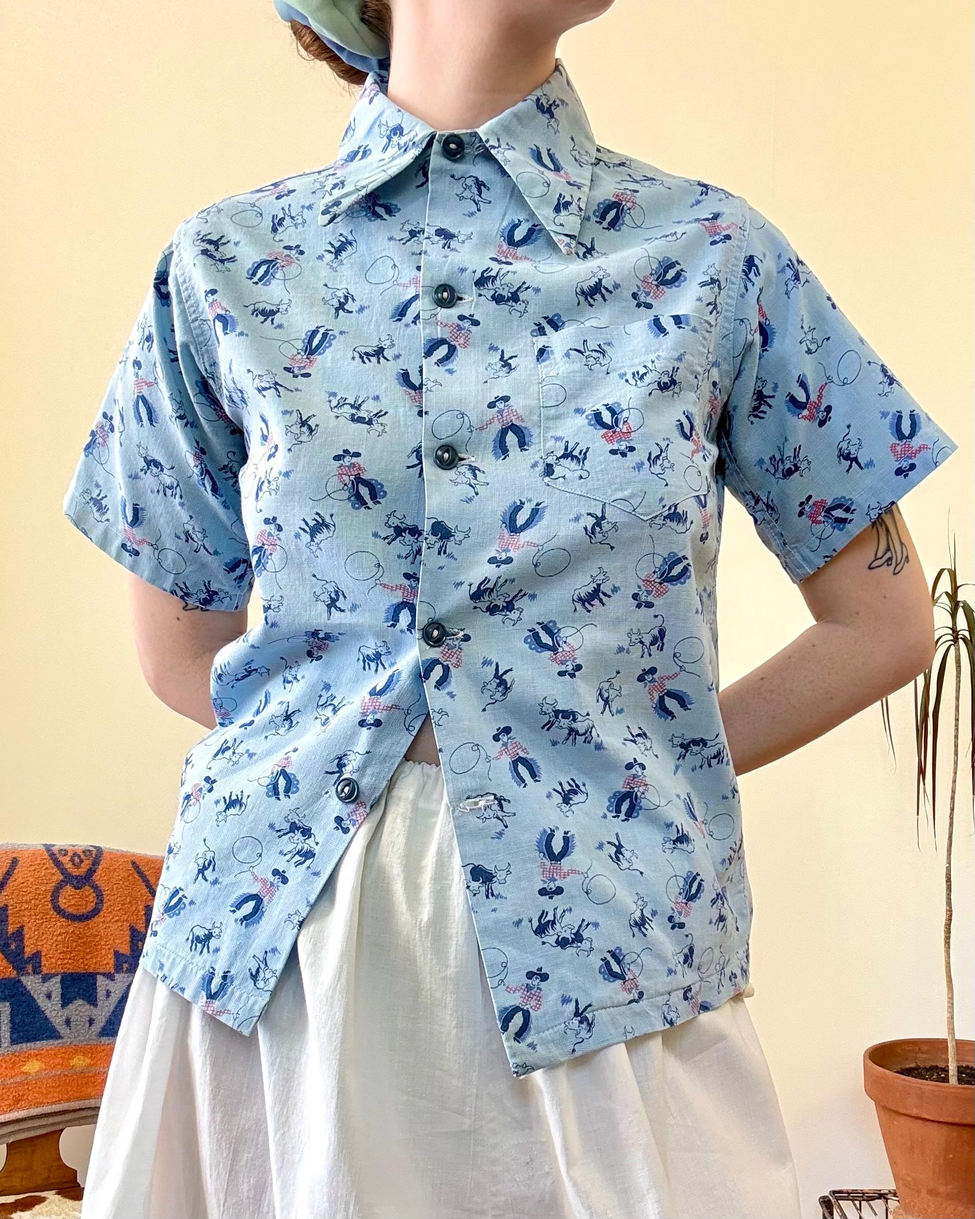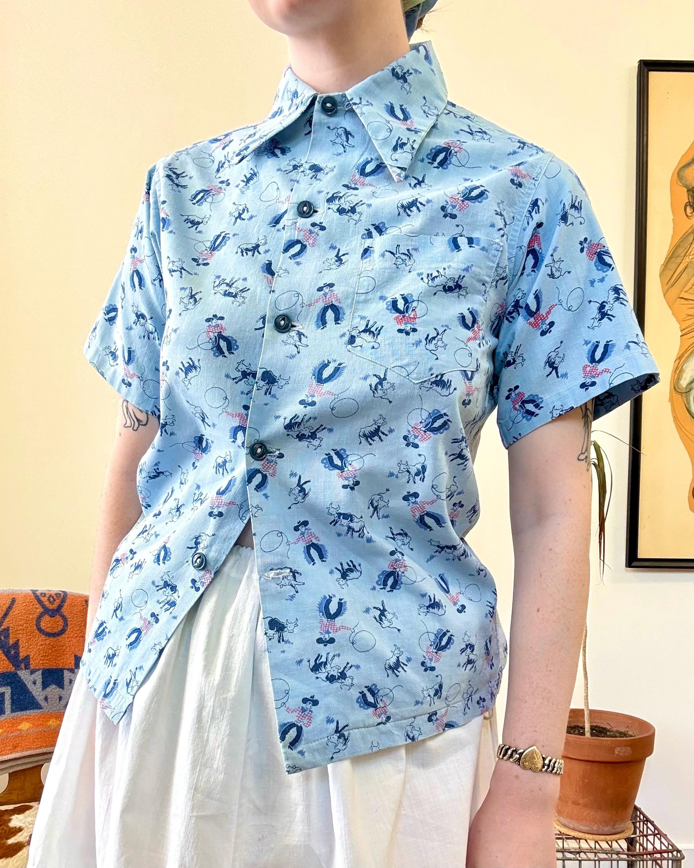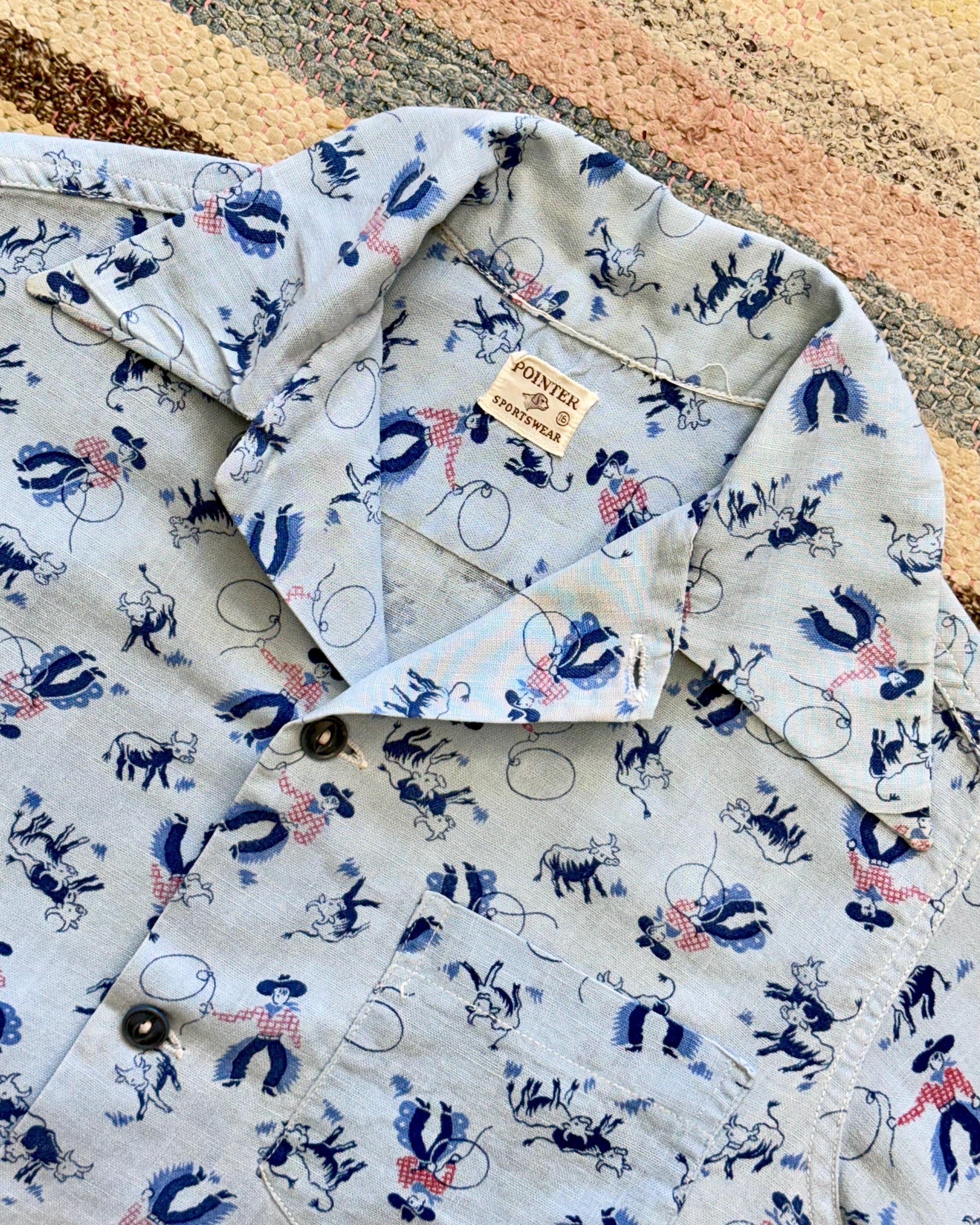 An authentic vintage short sleeve shirt. features a playful storybook style western print with cowboys and cattle. dagger collar. cat eye buttons. woven fabric similar to a feedsack. pointer sportswear label. tagged a larger youth boys size 16.