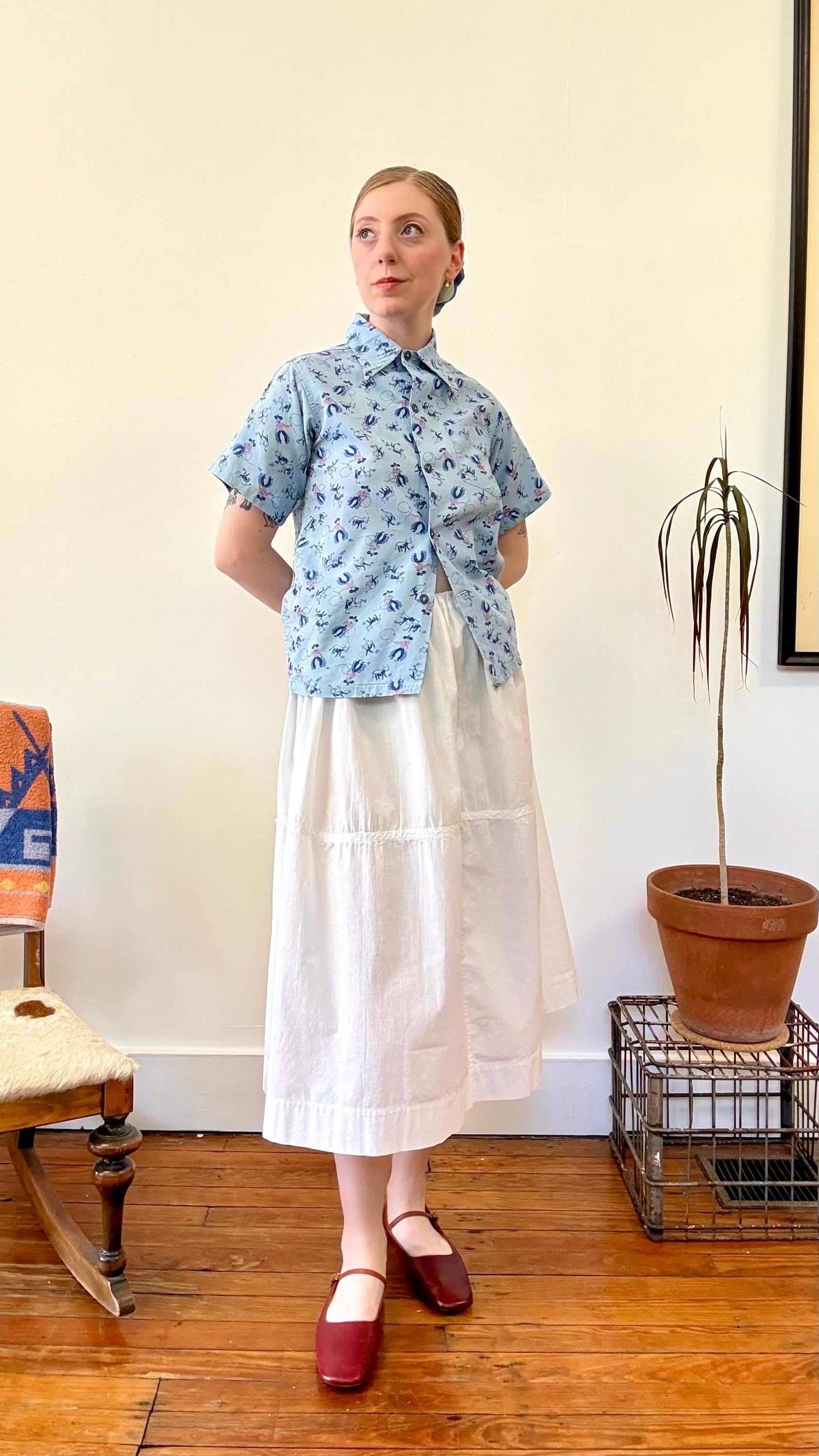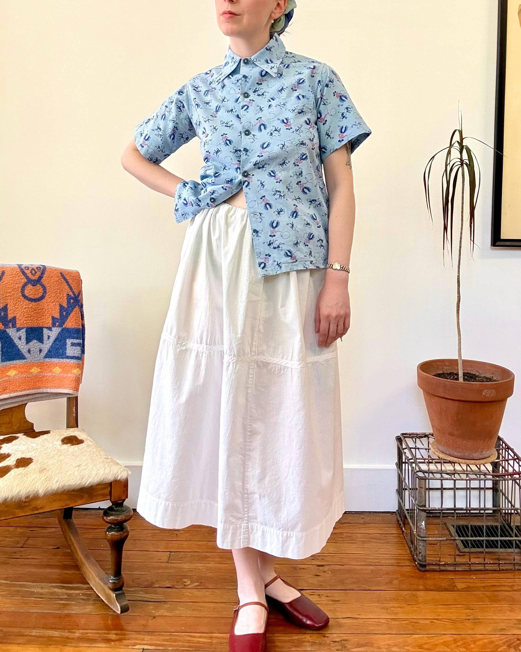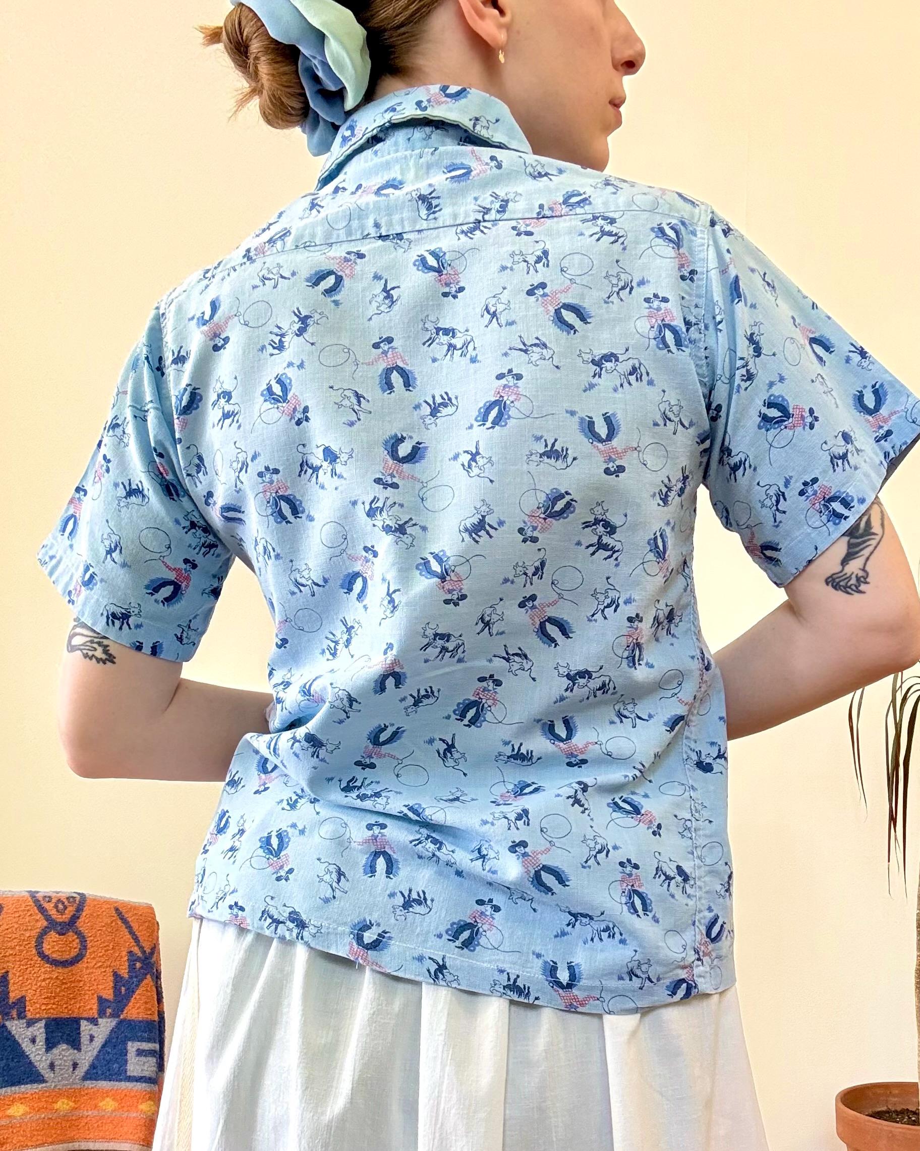 An authentic vintage short sleeve shirt. features a playful storybook style western print with cowboys and cattle. dagger collar. cat eye buttons. woven fabric similar to a feedsack. pointer sportswear label. tagged a larger youth boys size 16.