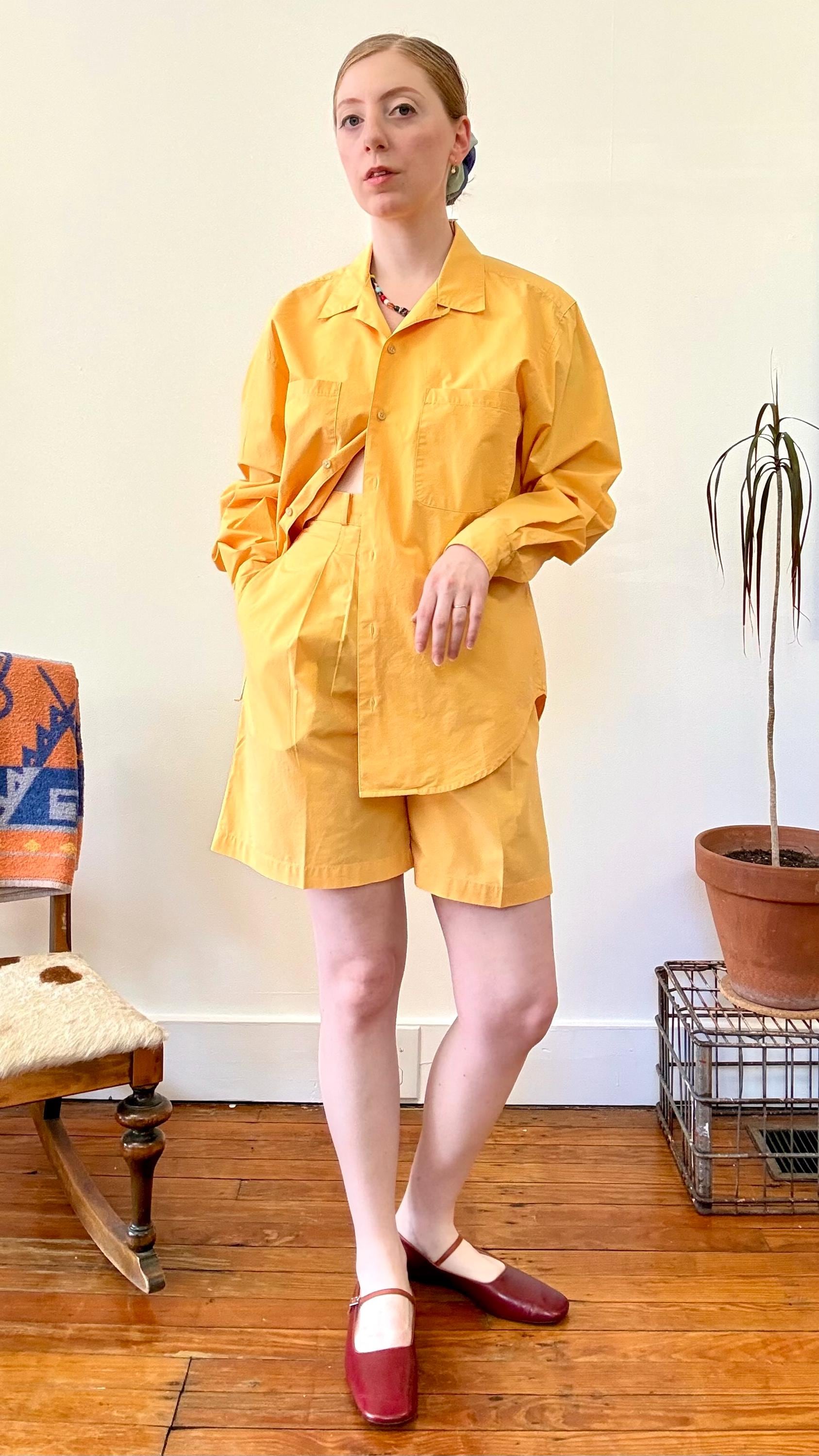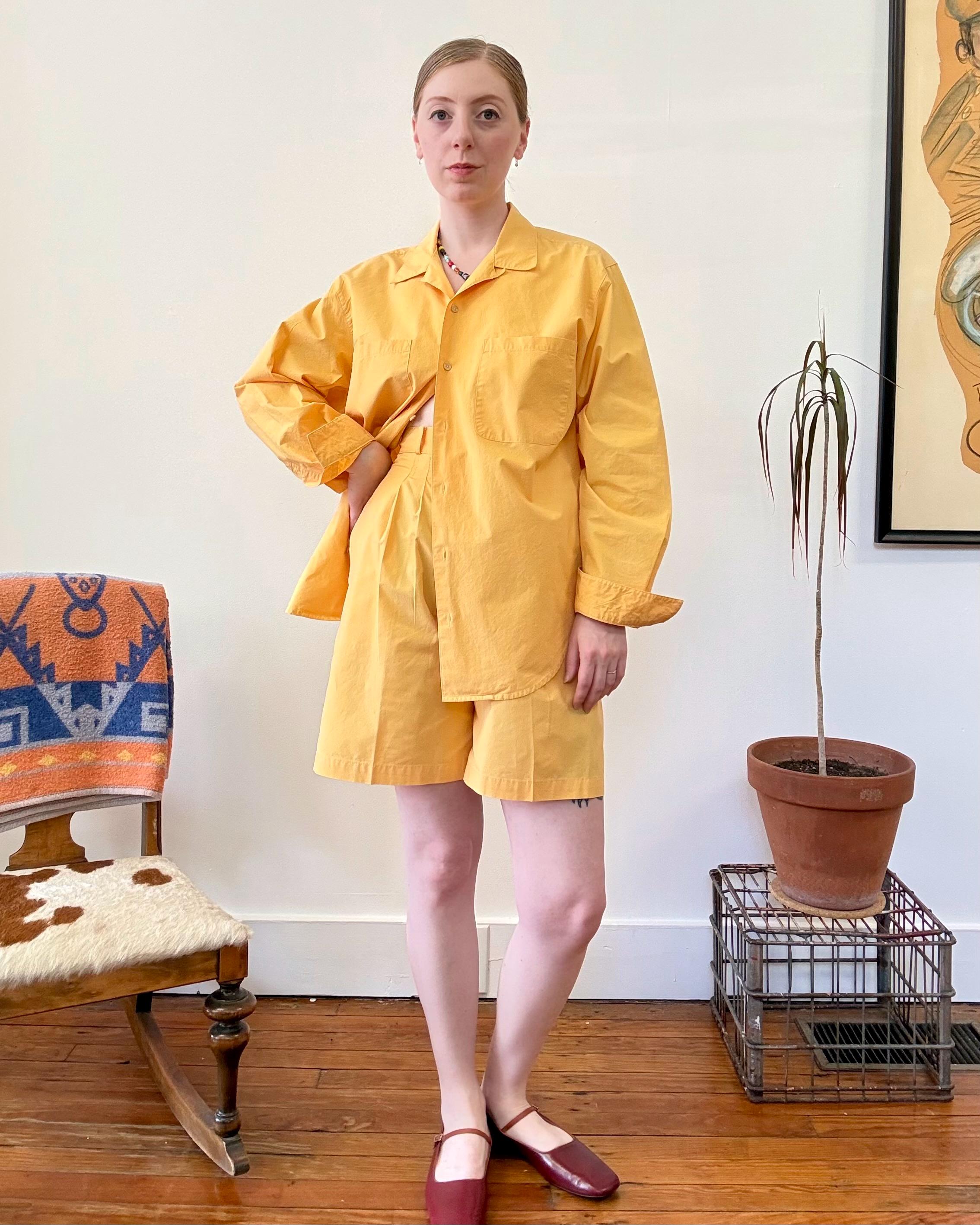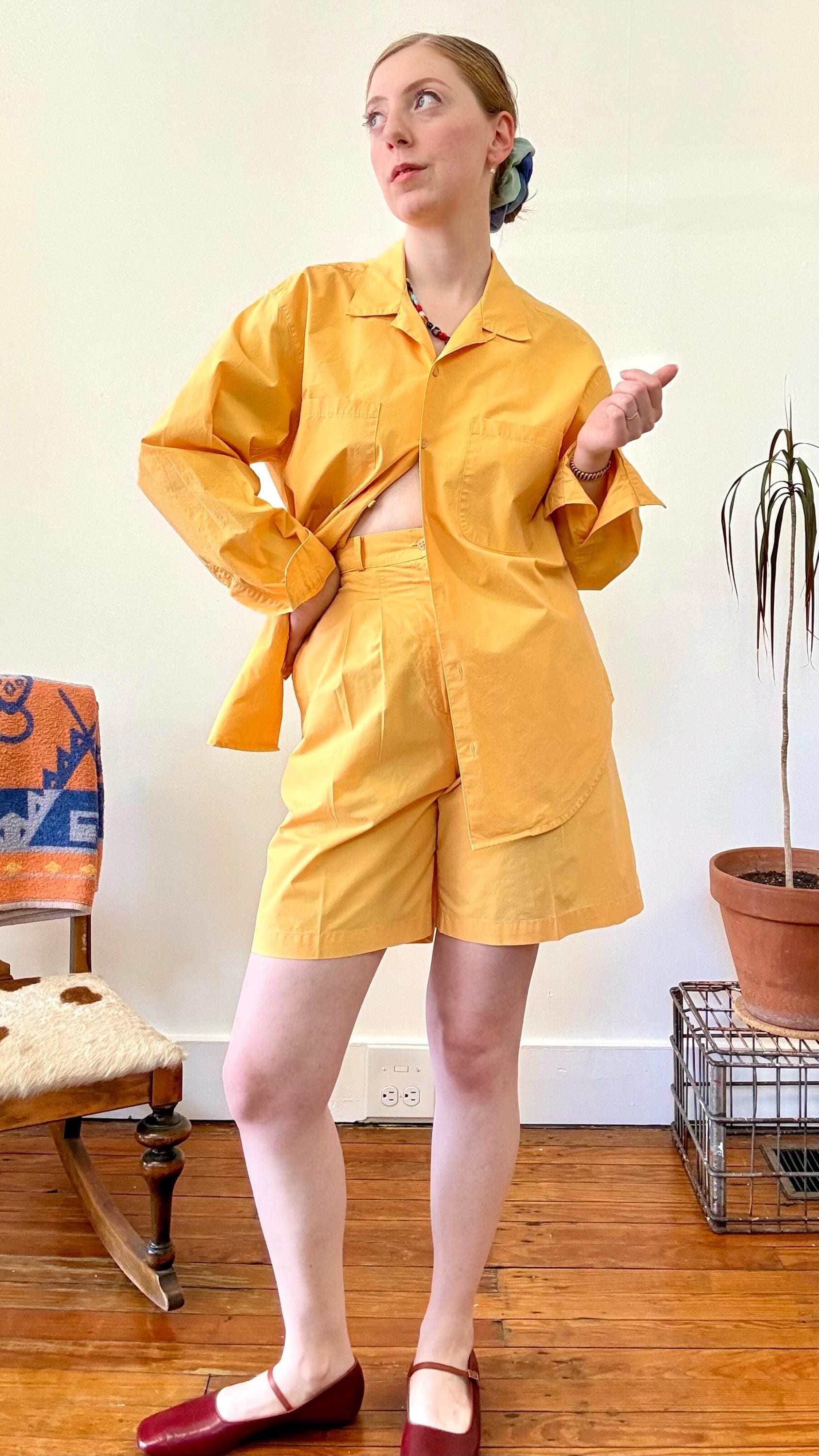 shown styled with a matching Banana Republic papaya pleated shorts,