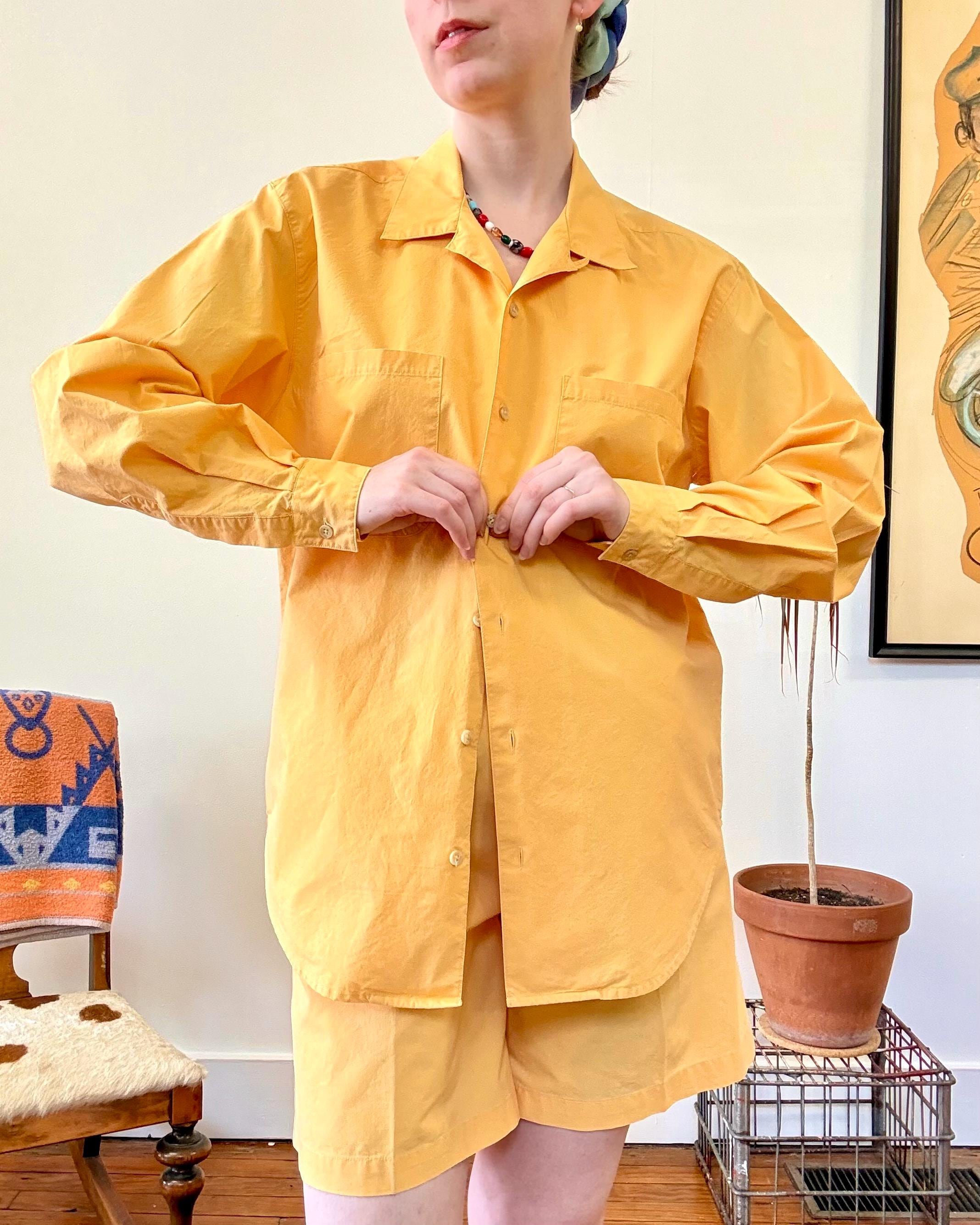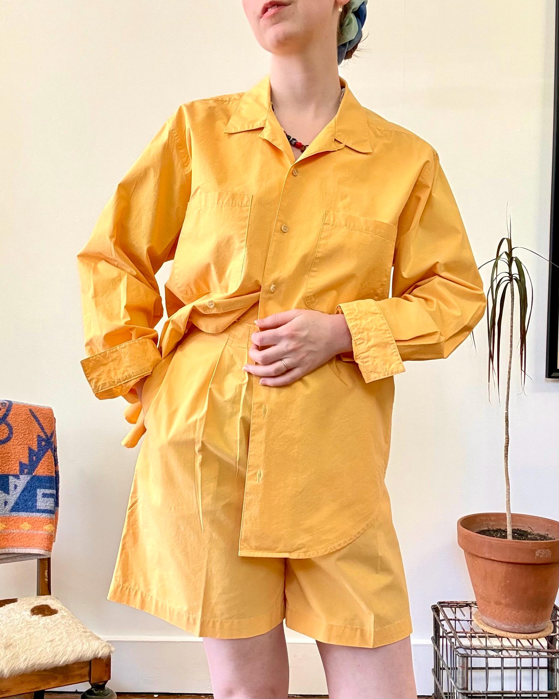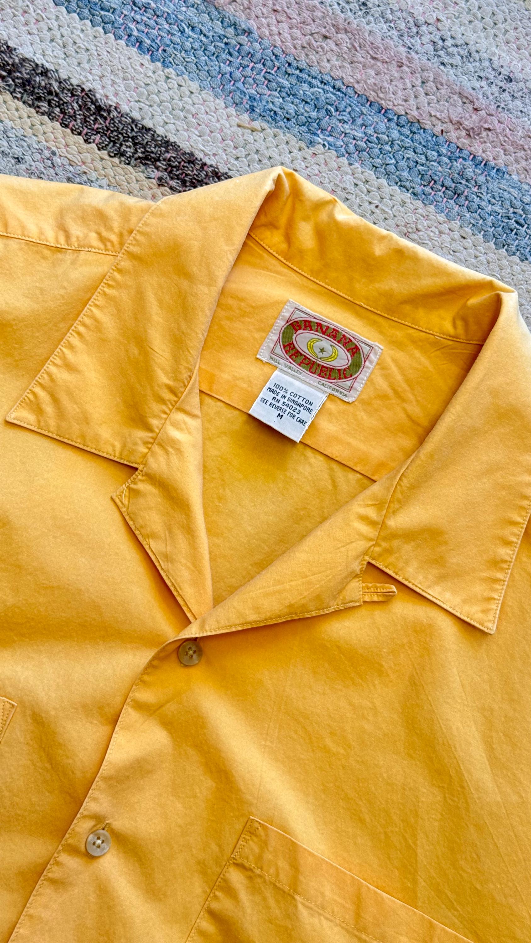 An authentic vintage shirt by Banana Republic, Mill Valley label. a classic menswear inspired style, features a loop collar neckline and “tortoise” buttons. crafted from a cotton woven fabric in a dried papaya hue. a gender neutral style.