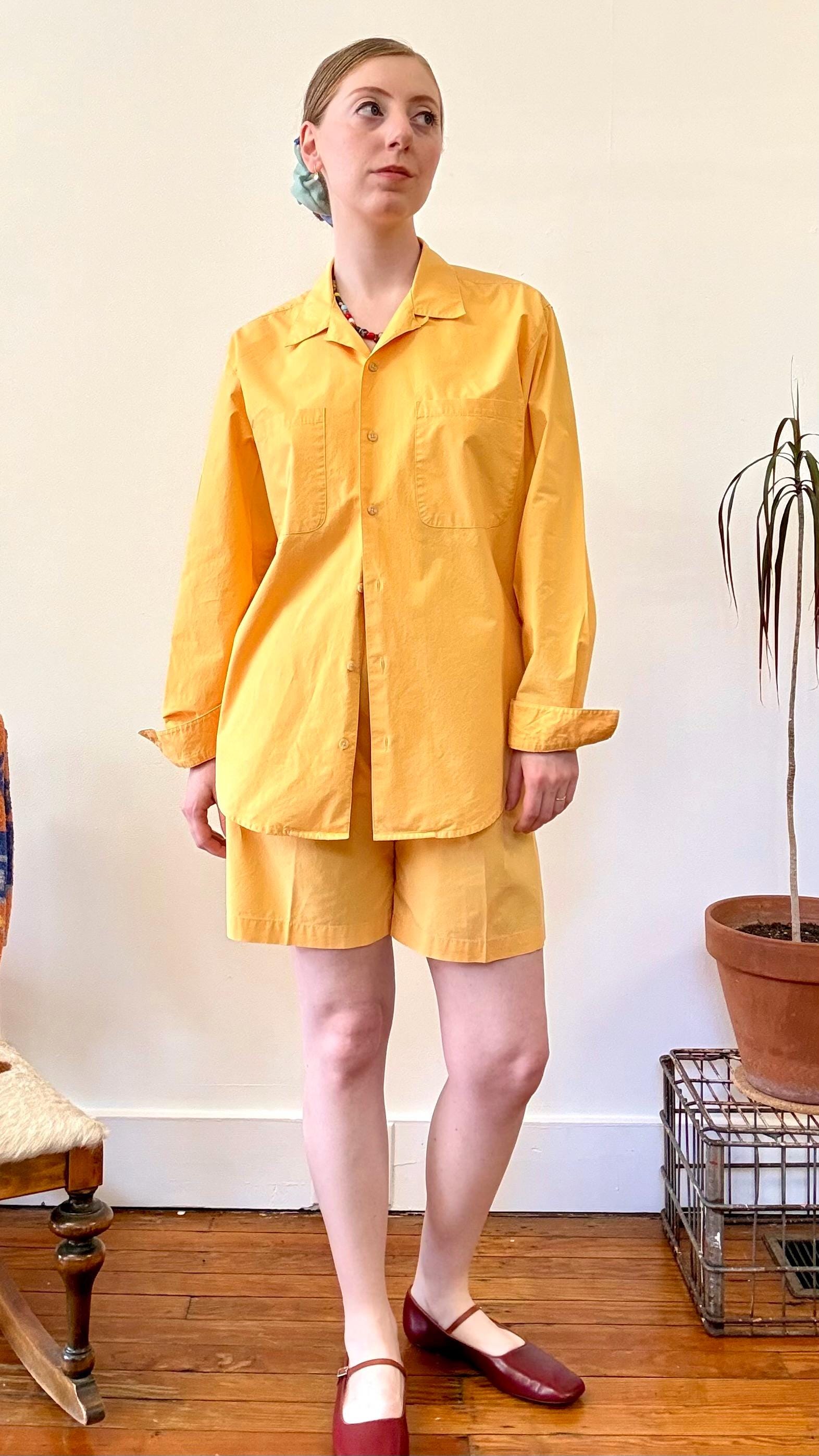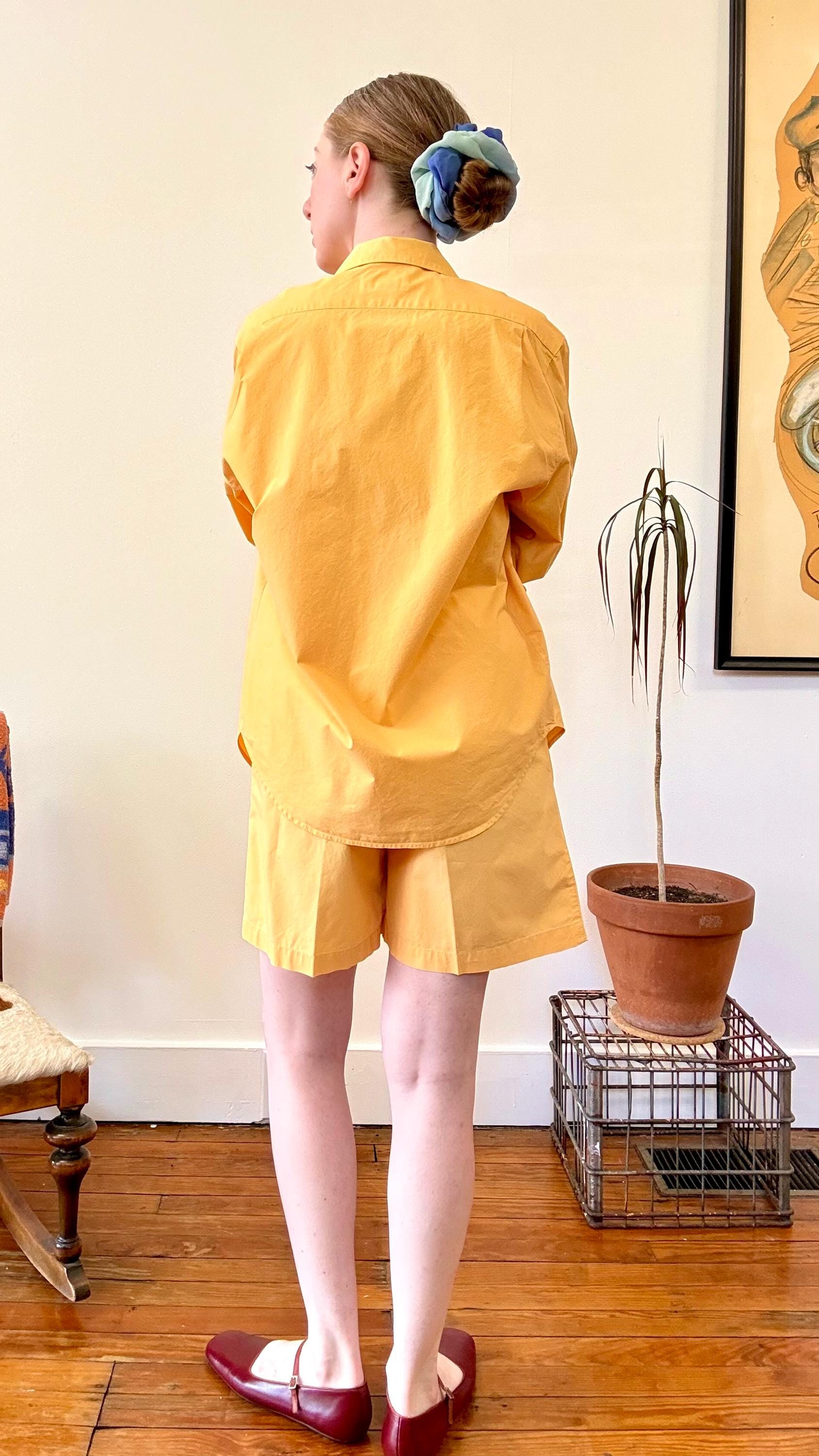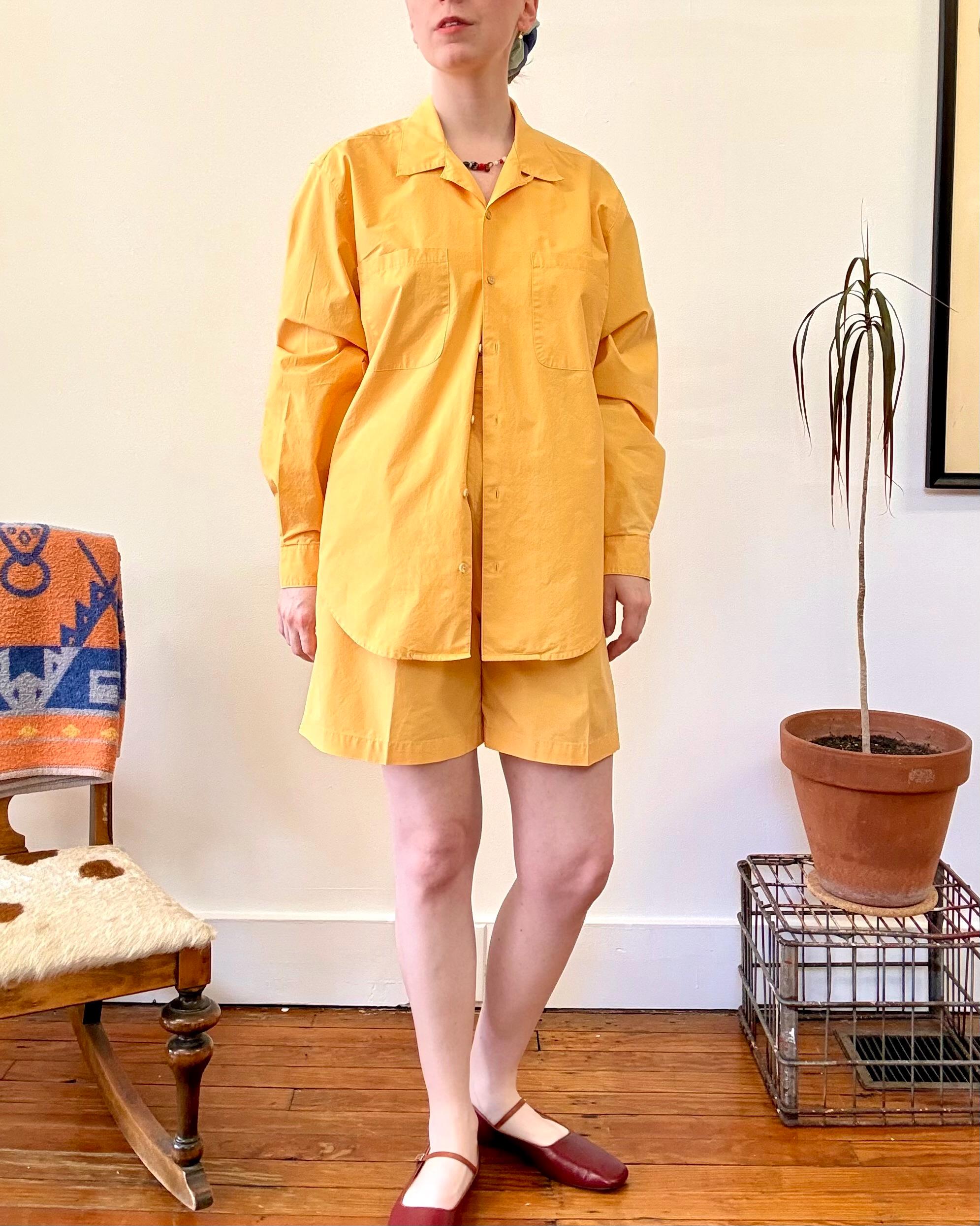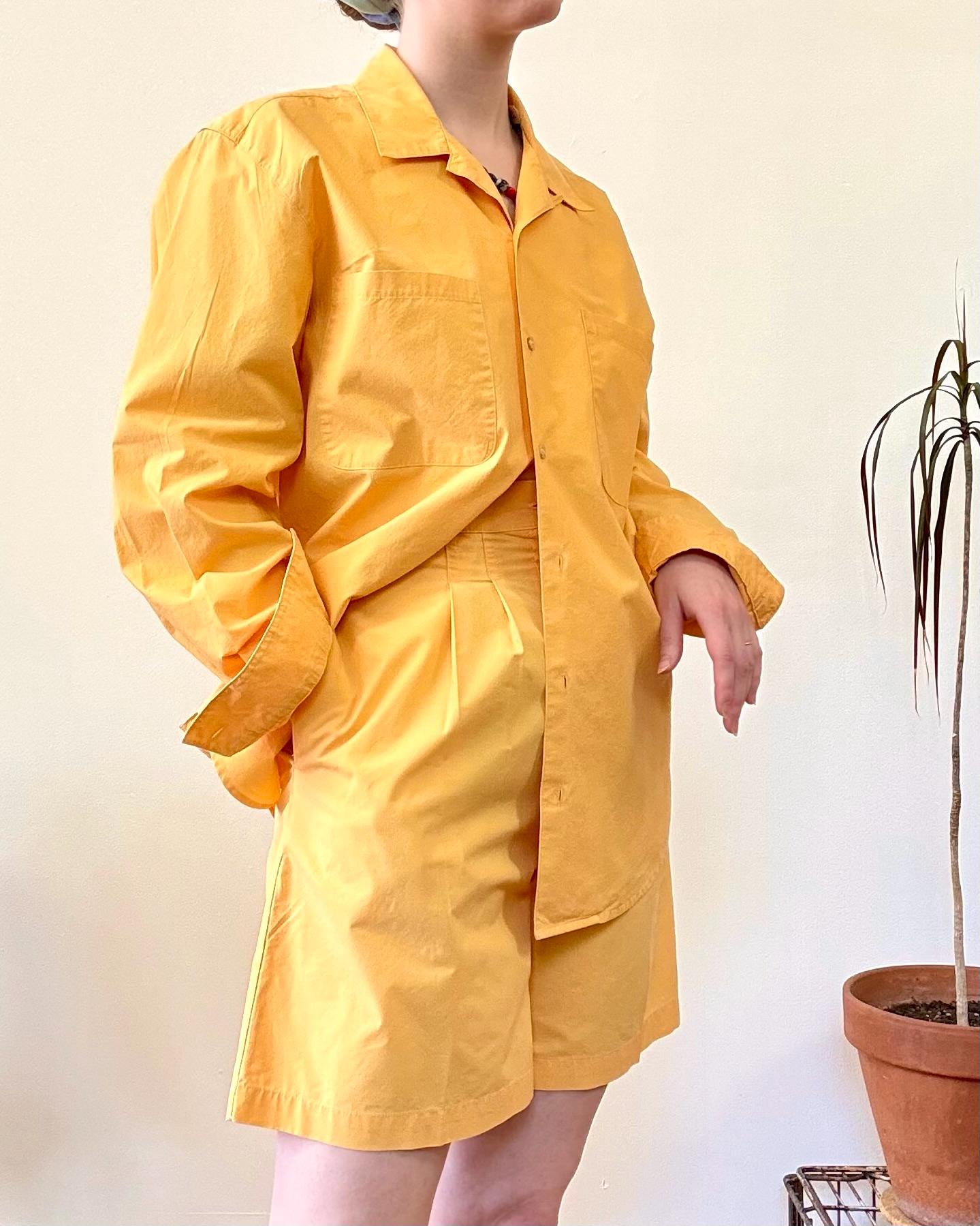 An authentic vintage shirt by Banana Republic, Mill Valley label. a classic menswear inspired style, features a loop collar neckline and “tortoise” buttons. crafted from a cotton woven fabric in a dried papaya hue. a gender neutral style.