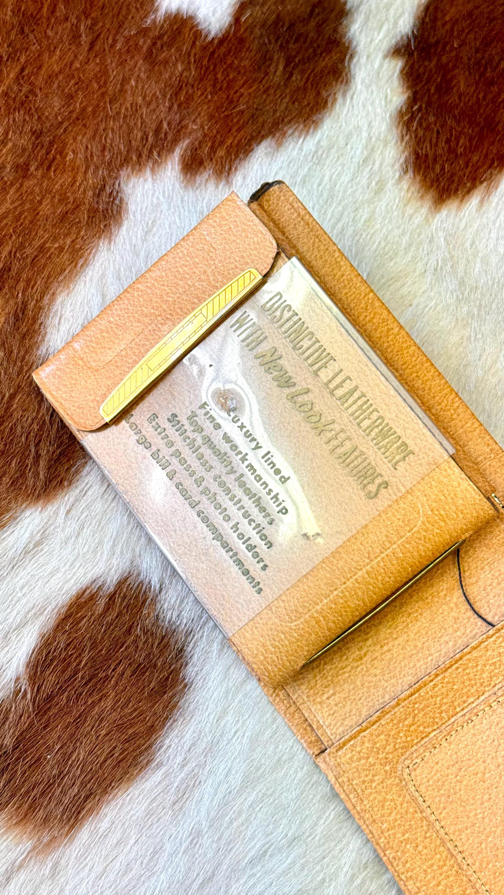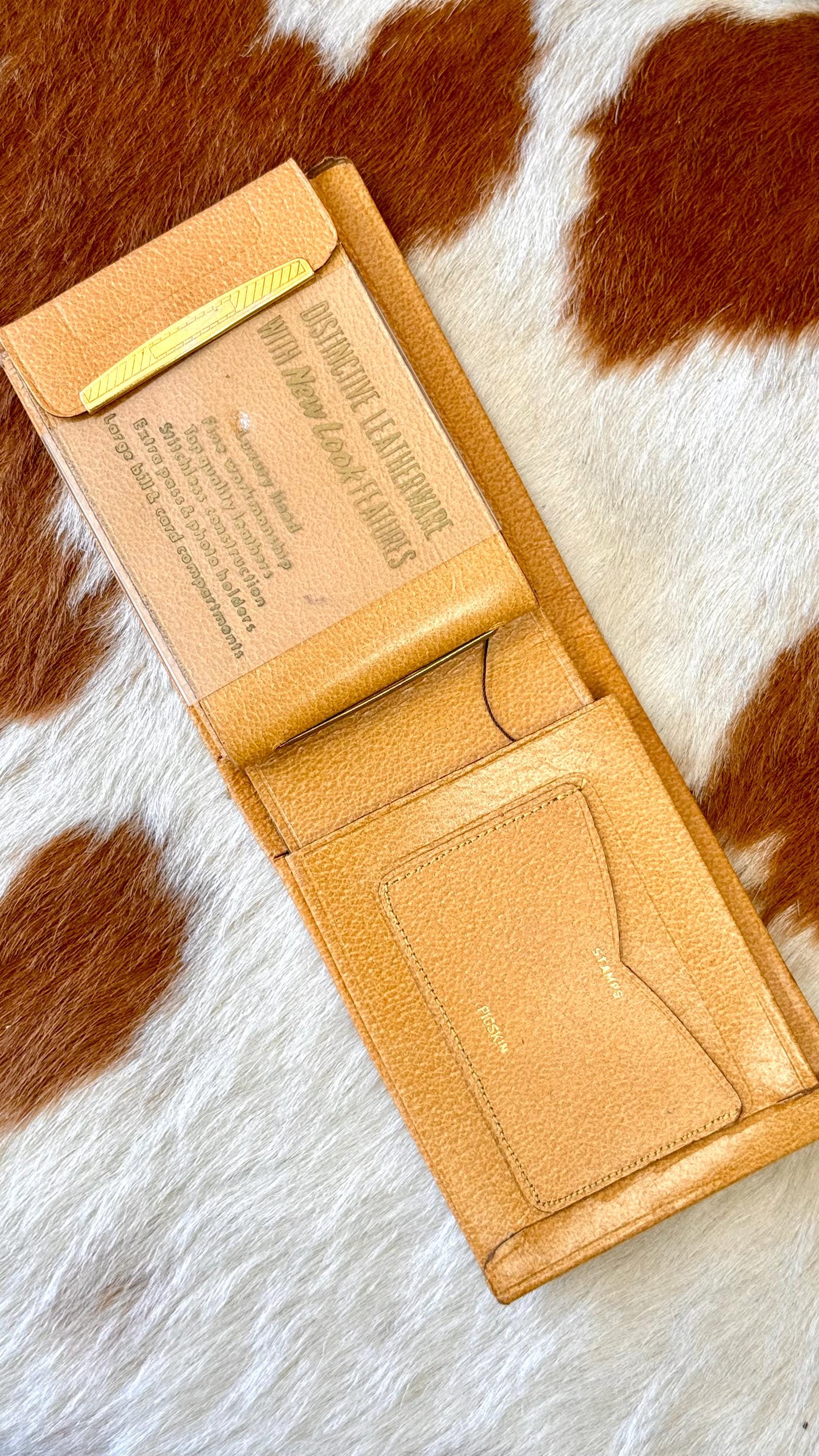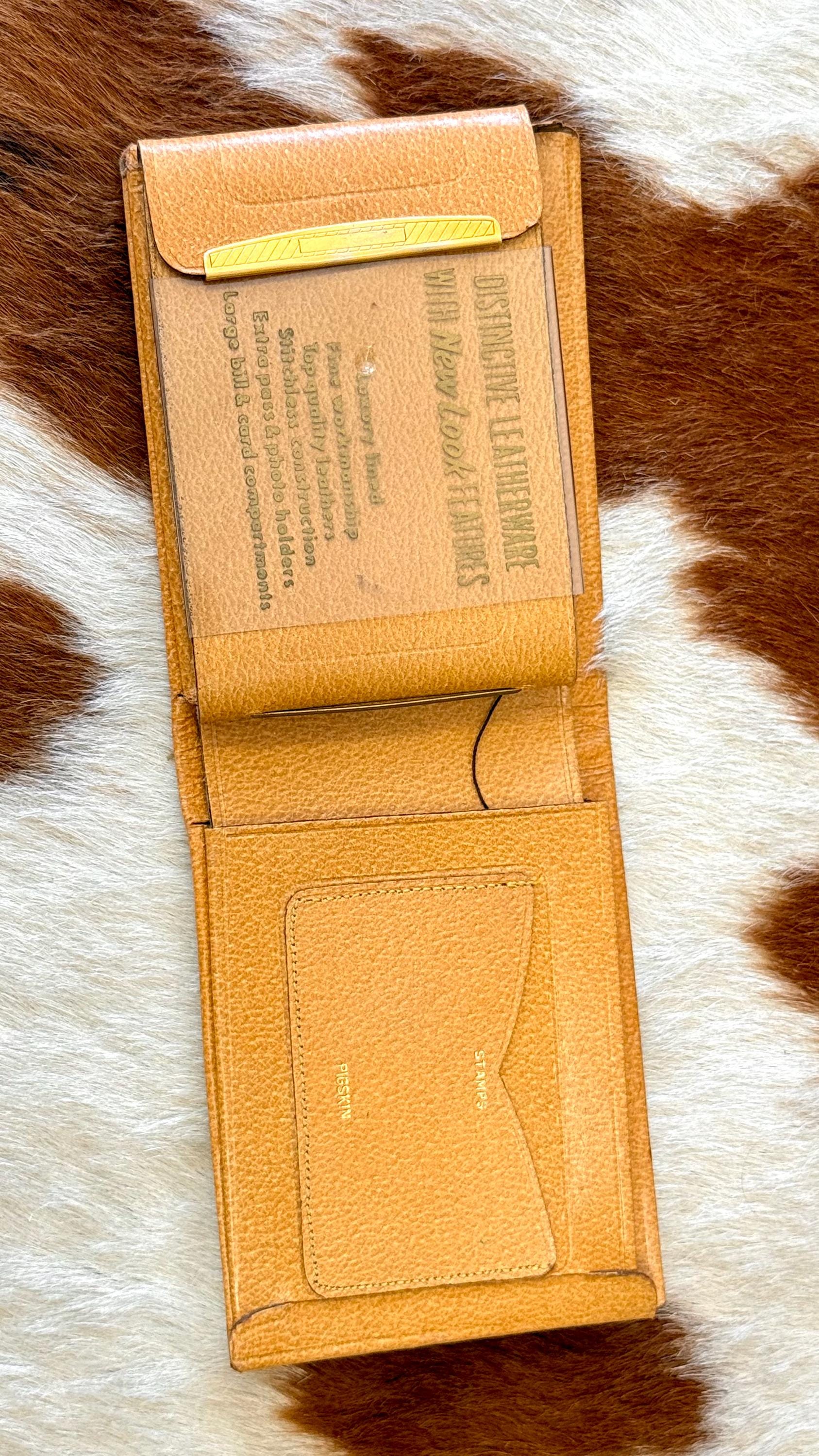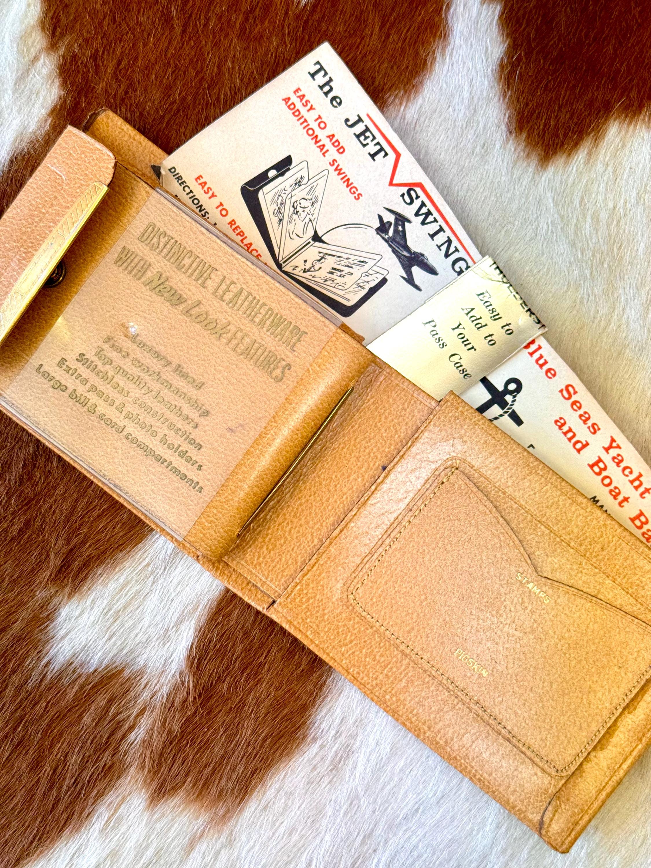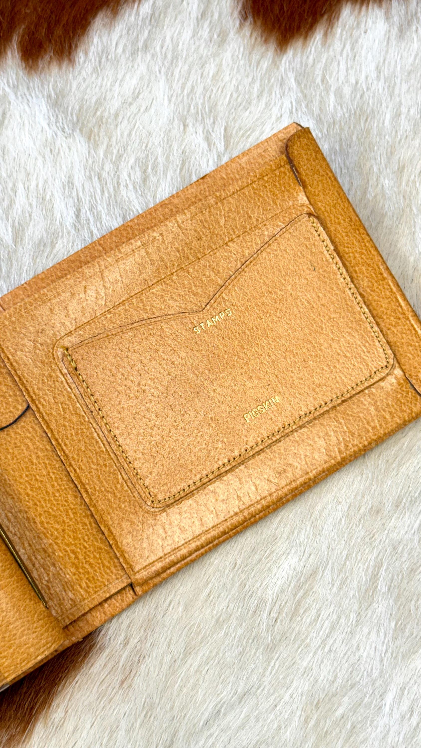 An authentic vintage bifold wallet. crafted from a smooth and crisp pigskin leather. unused, new old stock with all original paper inserts. includes removable key “swing” and slots for cards/stamps. its is a pretty thick wallet so probably best for using in a bag, not carrying in your pocket.