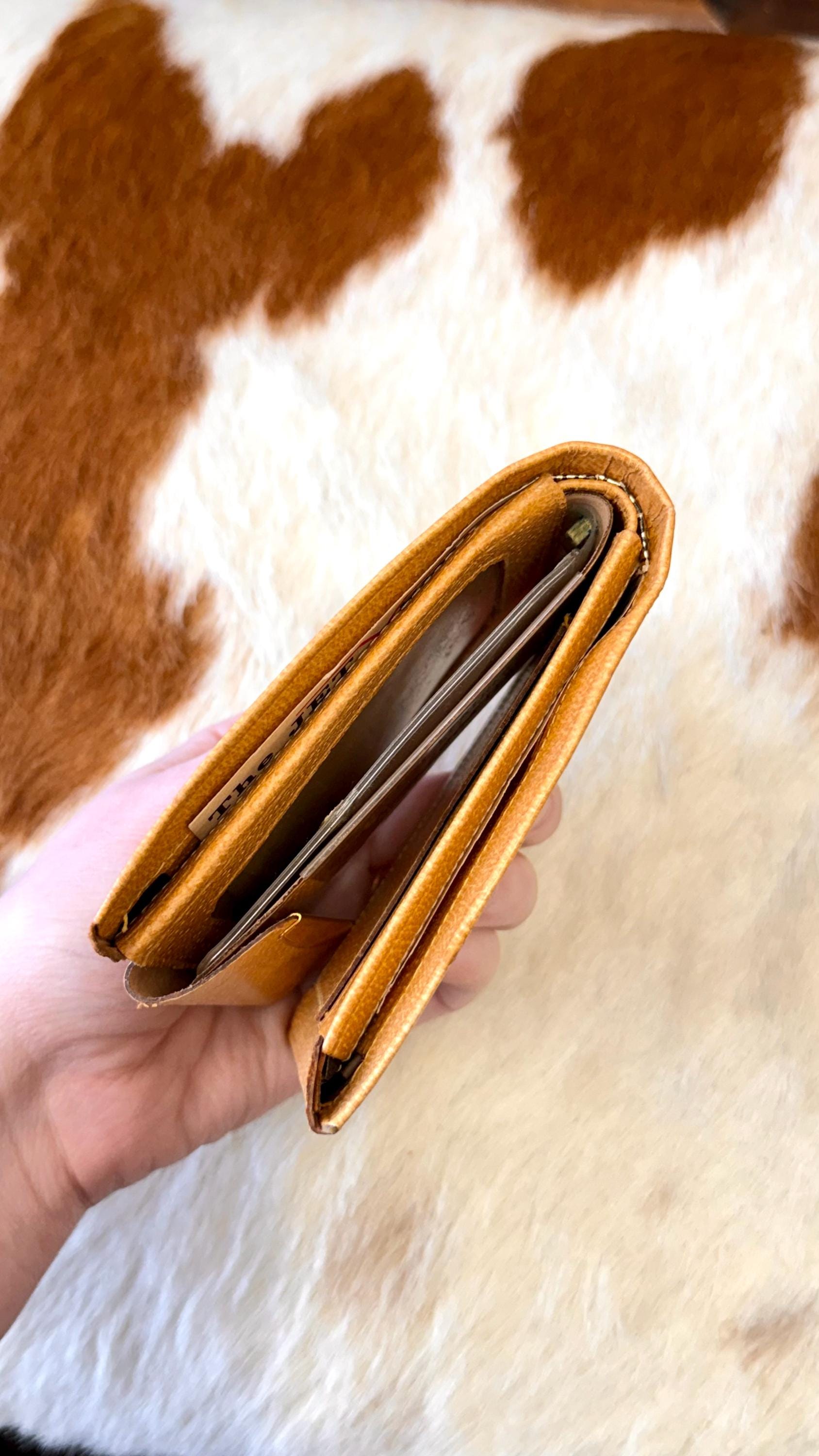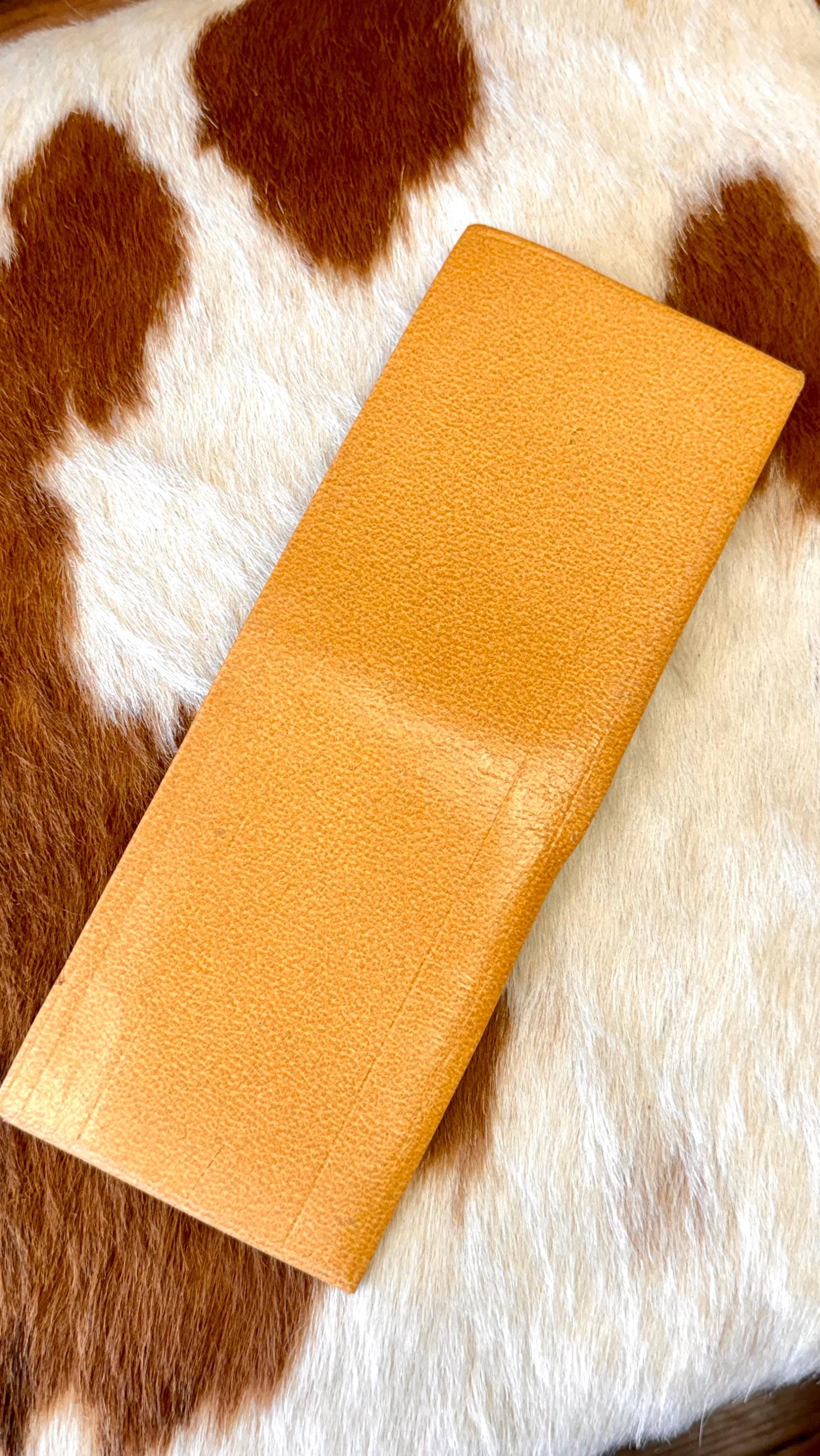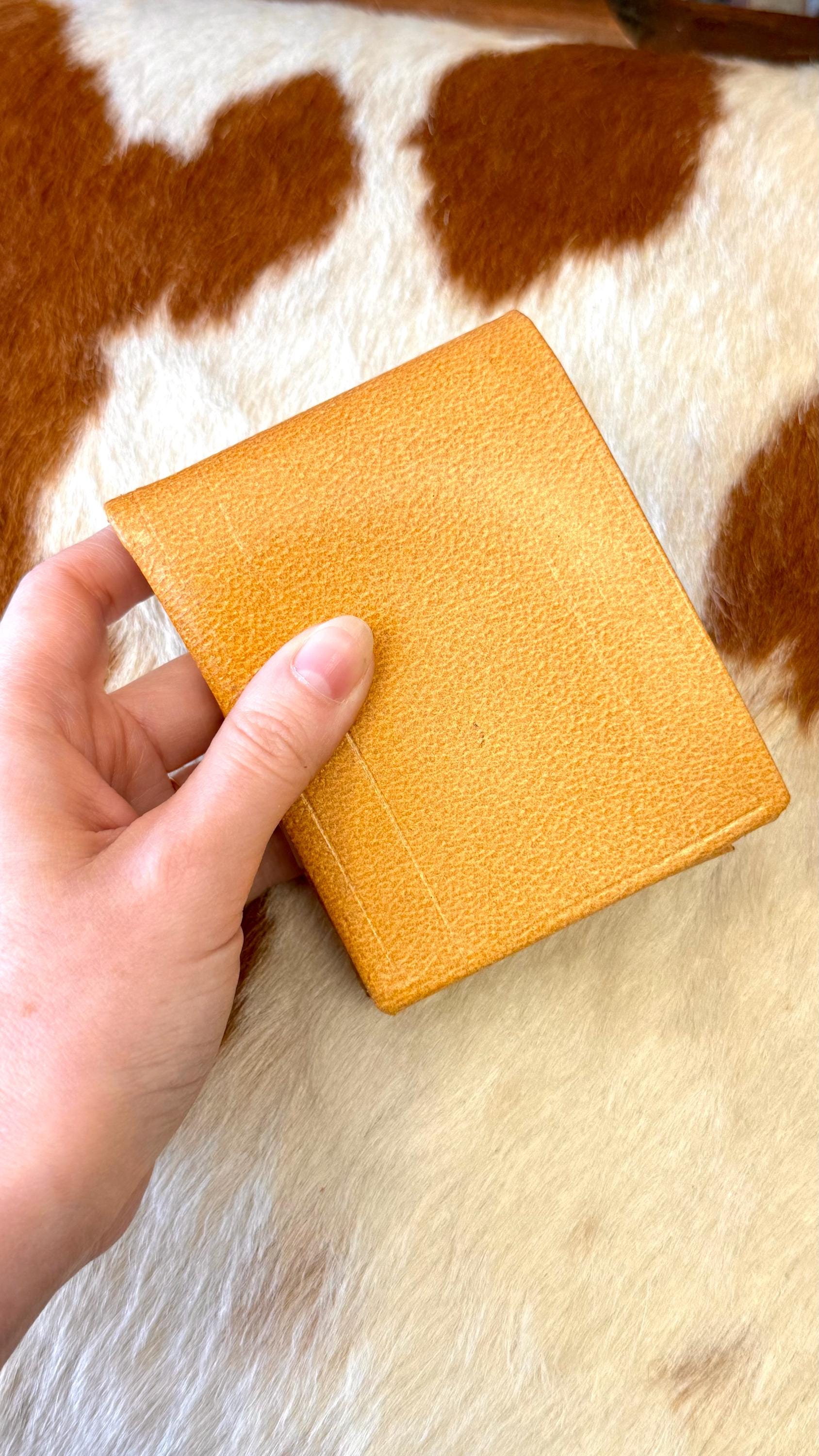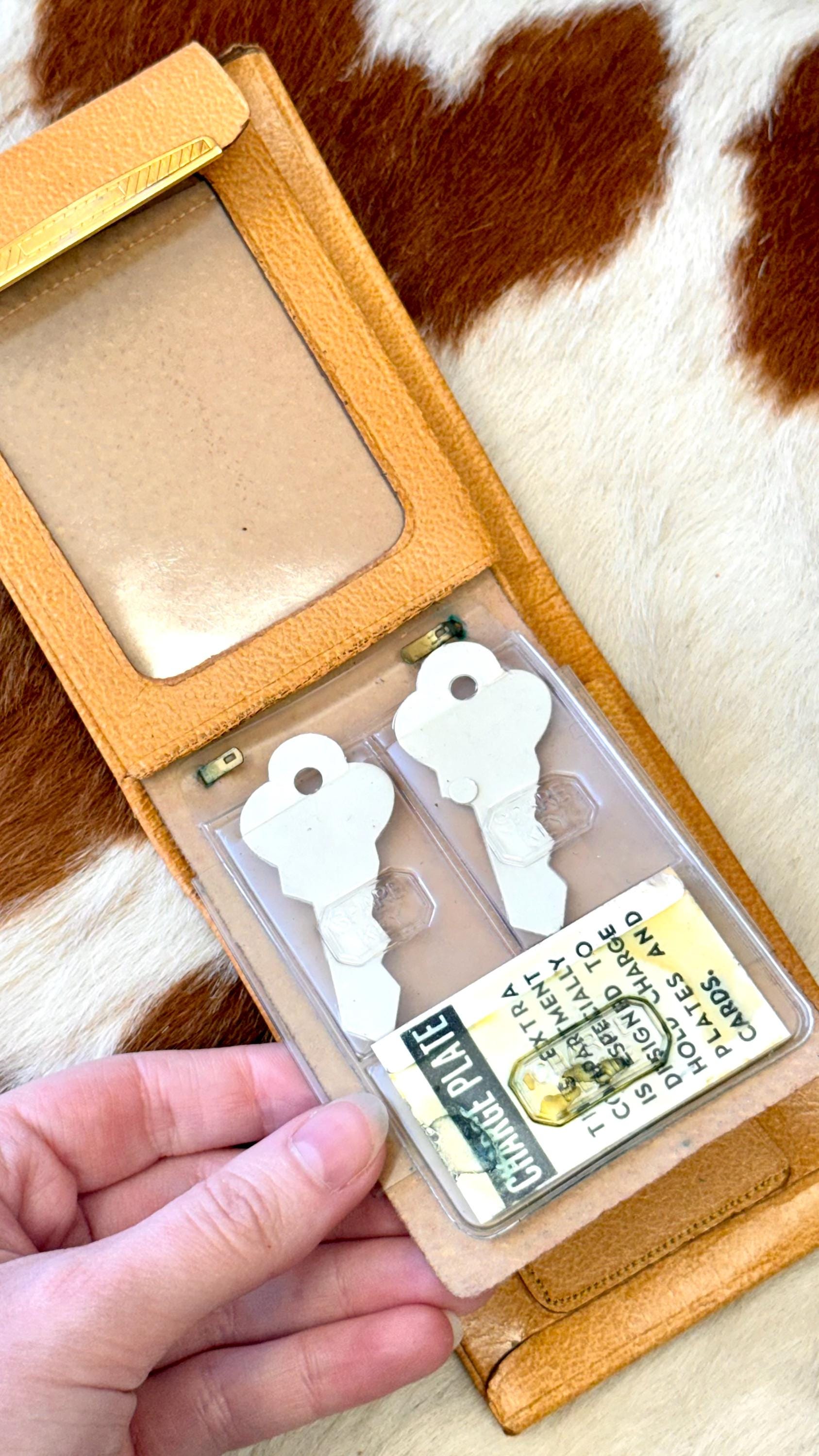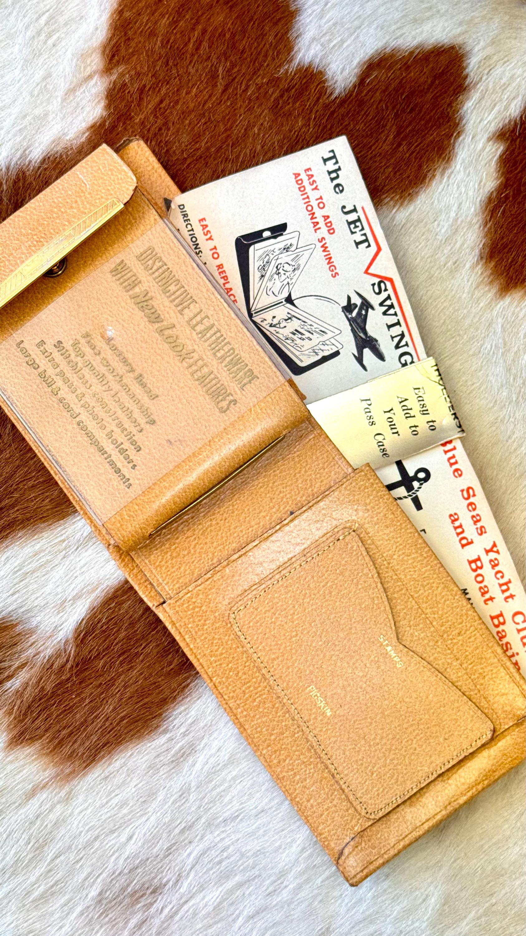 An authentic vintage bifold wallet. crafted from a smooth and crisp pigskin leather. unused, new old stock with all original paper inserts. includes removable key “swing” and slots for cards/stamps. its is a pretty thick wallet so probably best for using in a bag, not carrying in your pocket.