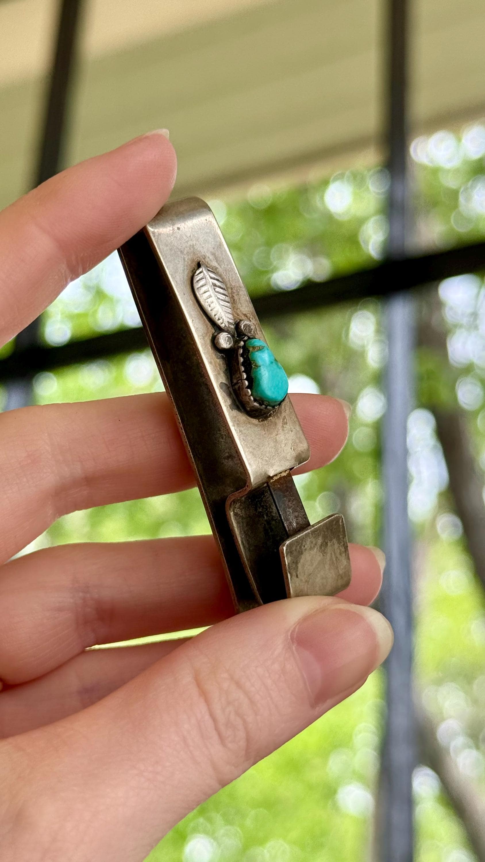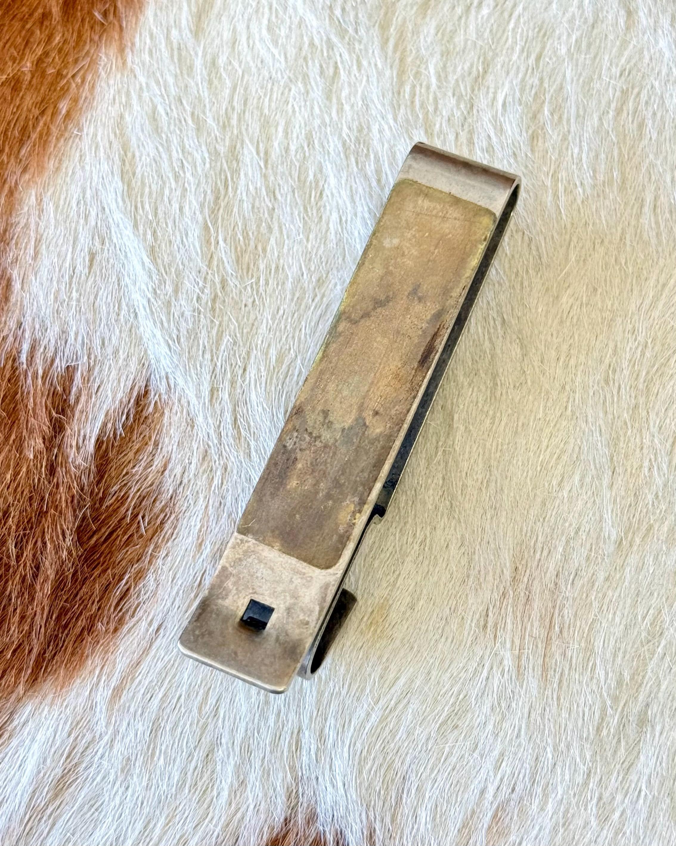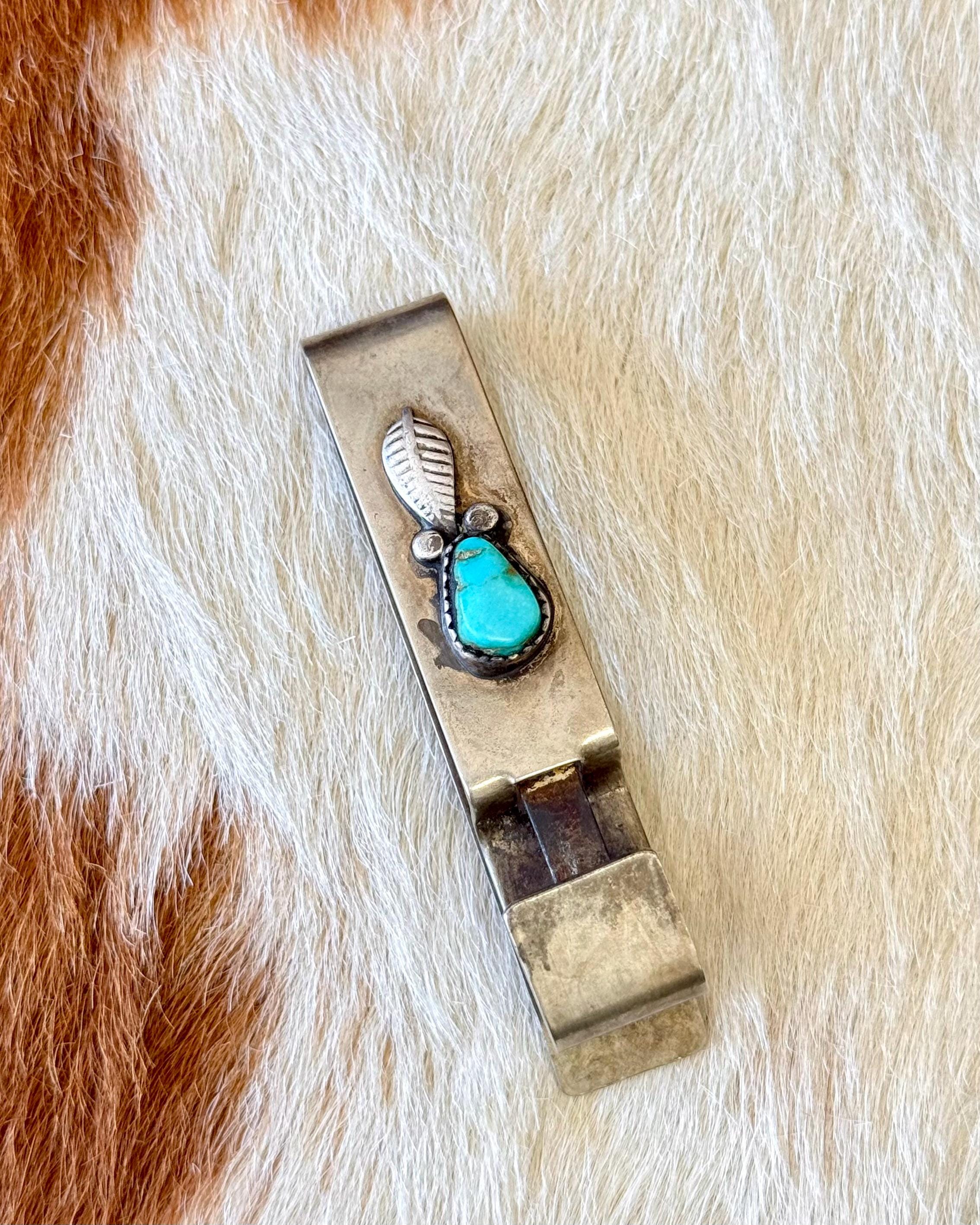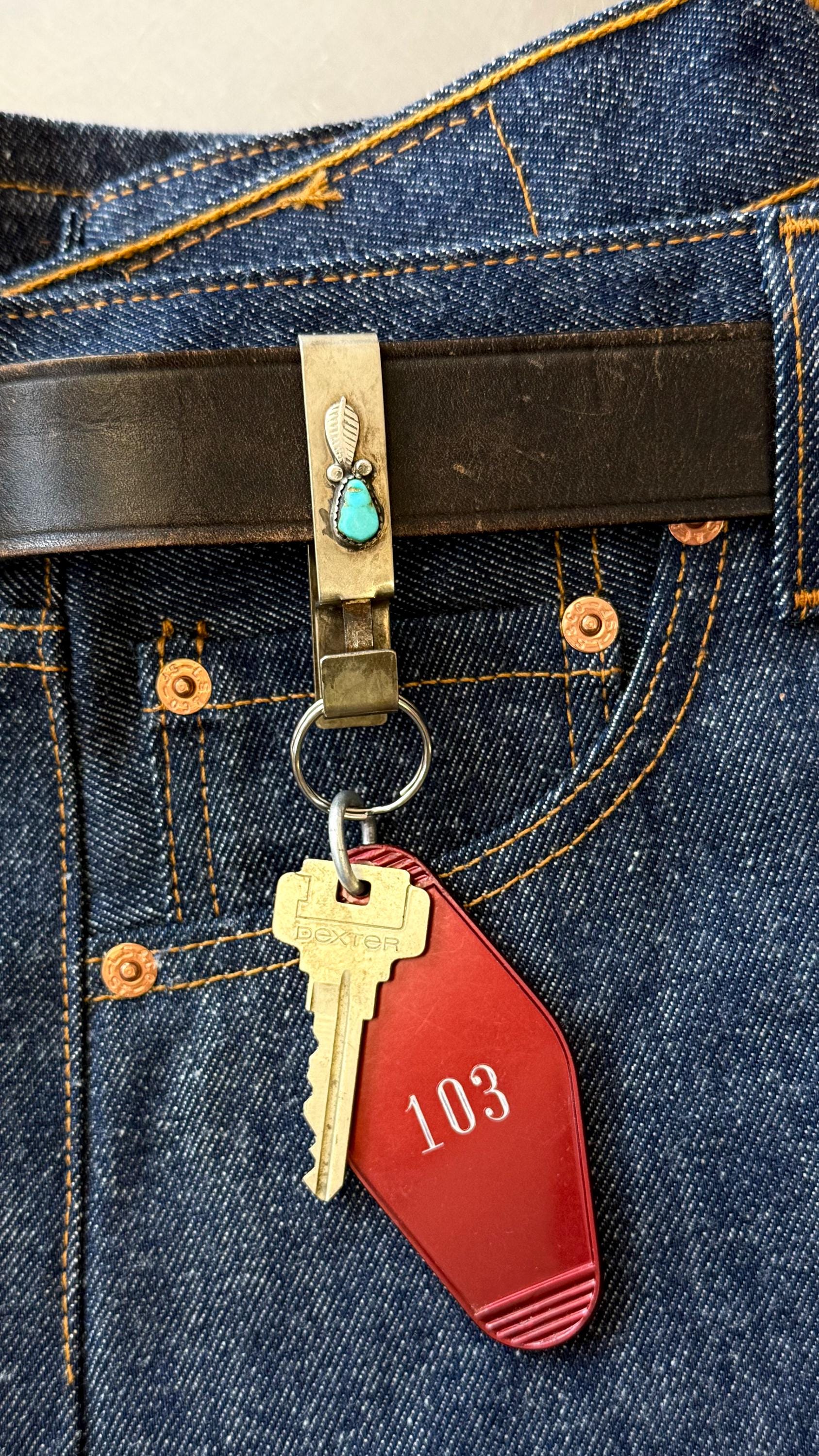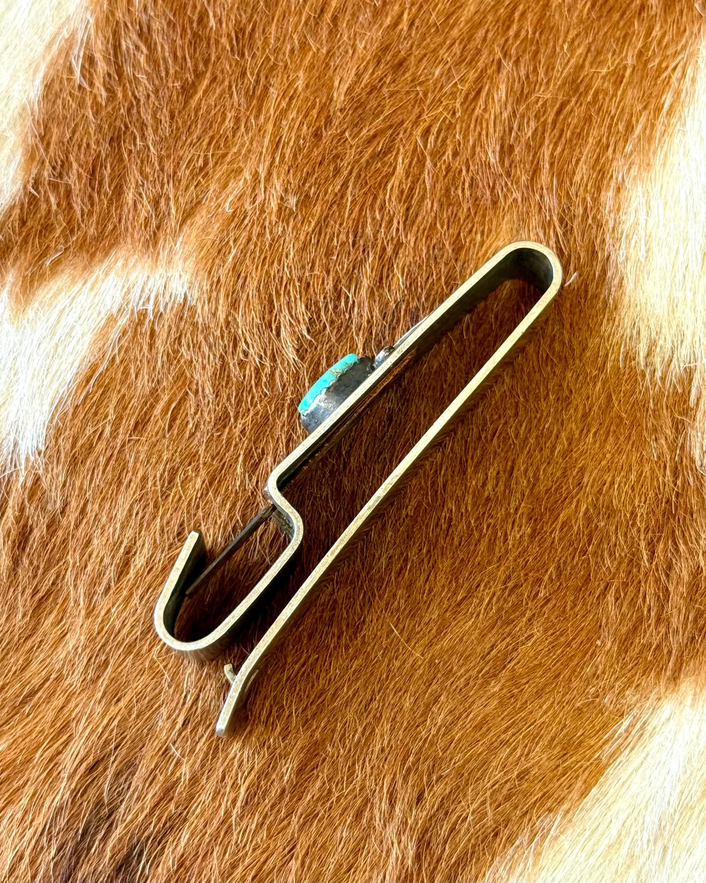An authentic vintage belt key clip. a solid brass slide to fix onto your belt of choice with a clip mechanism to easily attach and remove a key ring. features a handcrafted southwestern design of sterling silver leaf filigree and natural turquoise stone. unmarked.
